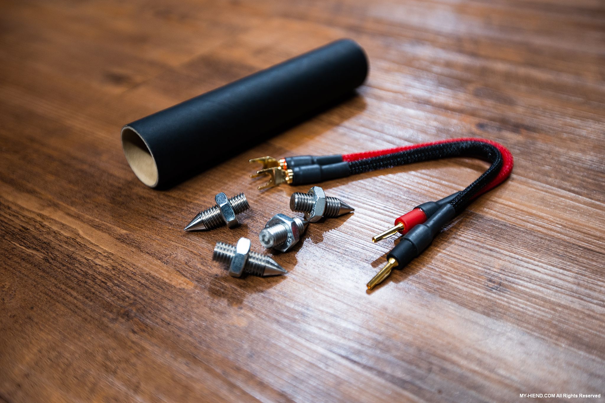 原廠所附的配件喇叭跳線與角錐就在這黑色筒子之中,雖是標準配件,但已有相當高的品質。EVO TWO採用Bi-Wiring設計,提供更多的調音可能。