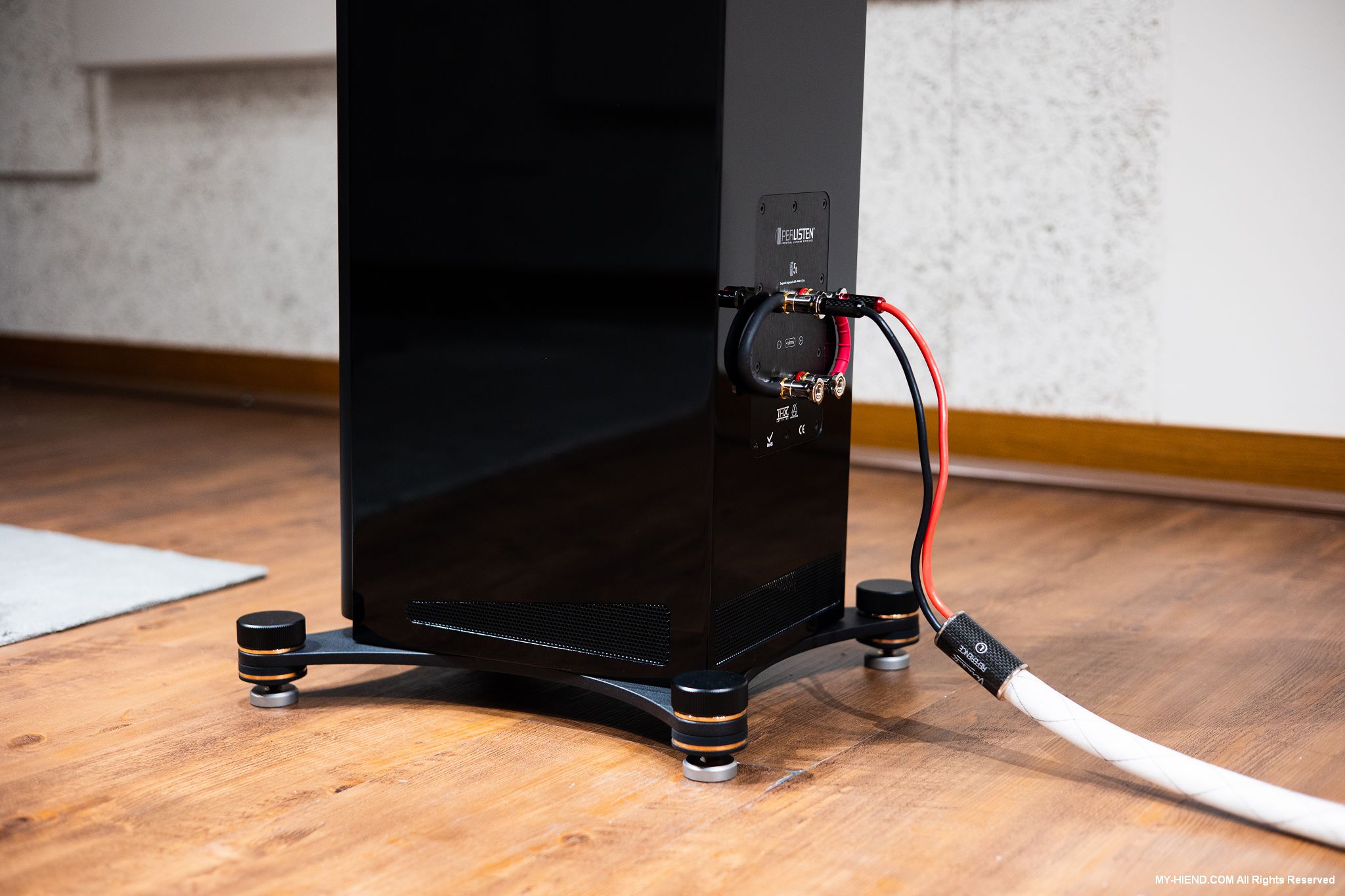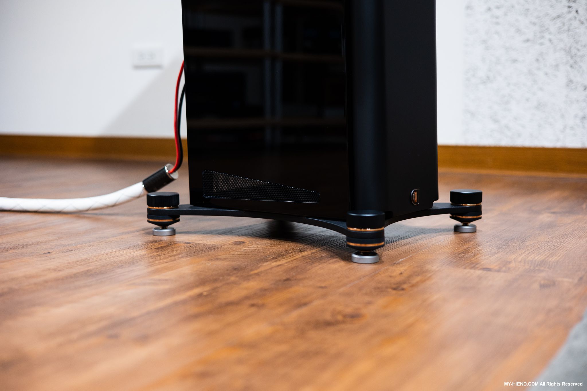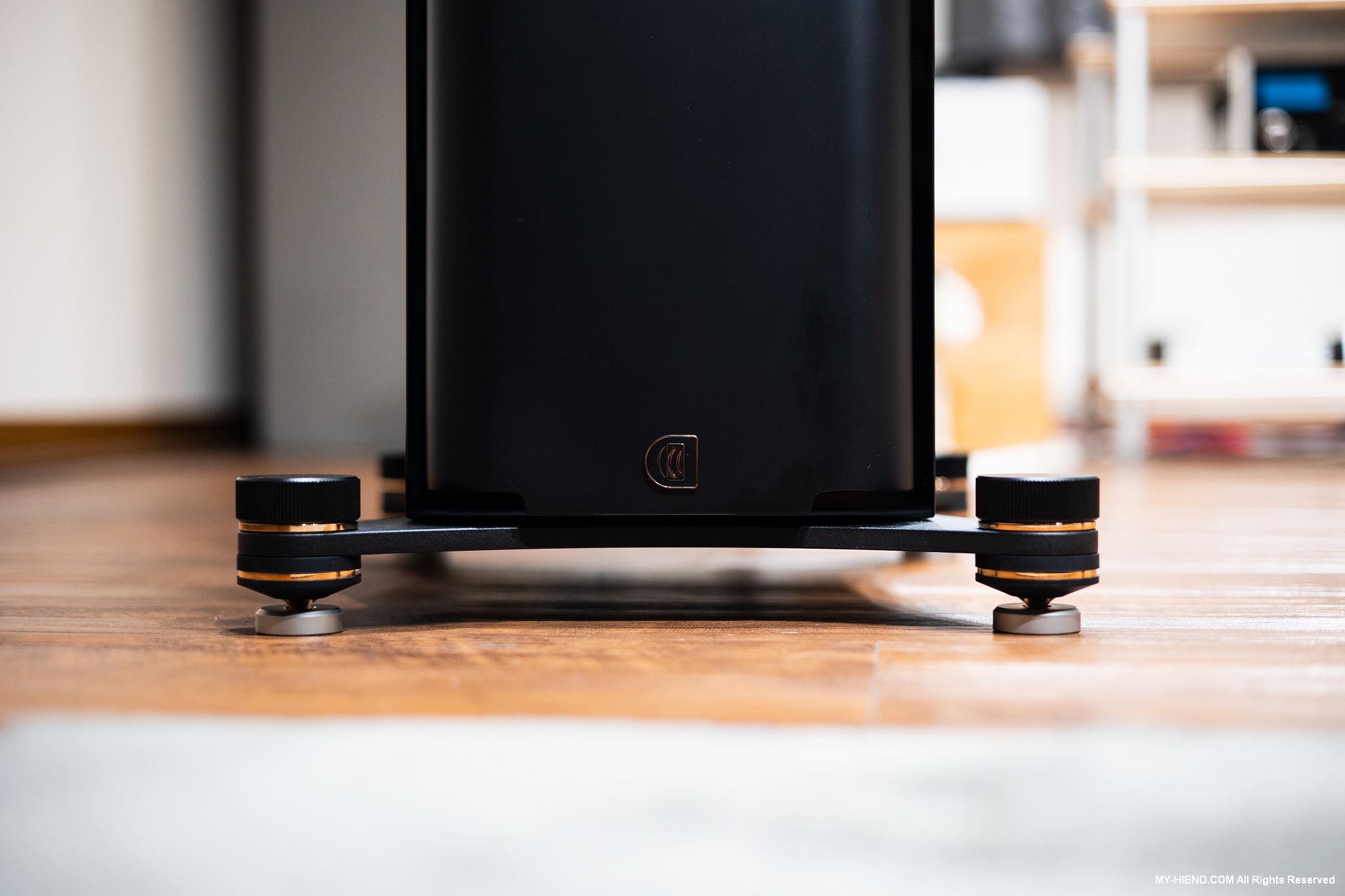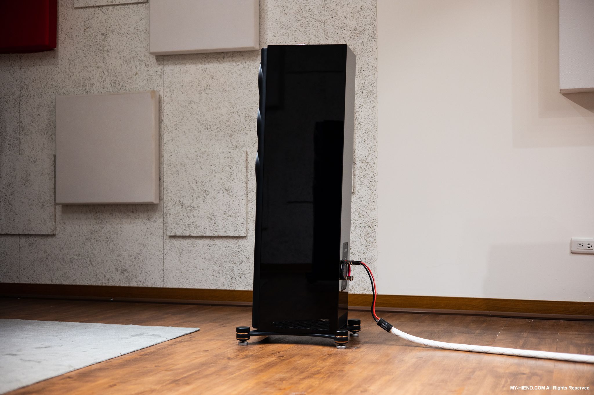 R5t落地喇叭的正面可以看到5個單體配置,以高音單體為中心採對稱式排列,中央前障板採消光處理,箱體另外3側與頂部則都是玻璃烤漆處理。喇叭接線端子為高音與低音分開的兩組設計,附帶原廠跳線。4個腳錐設計完善,並有工具輔助可輕易調整高度,安裝時需先安裝一塊非常扎實的底板與喇叭箱身結合,腳錐則裝在底板上,箱體、底板與腳錐碰觸到的接合處都有橡膠材質介於其中,除了接觸更密合以外也有消振效果。