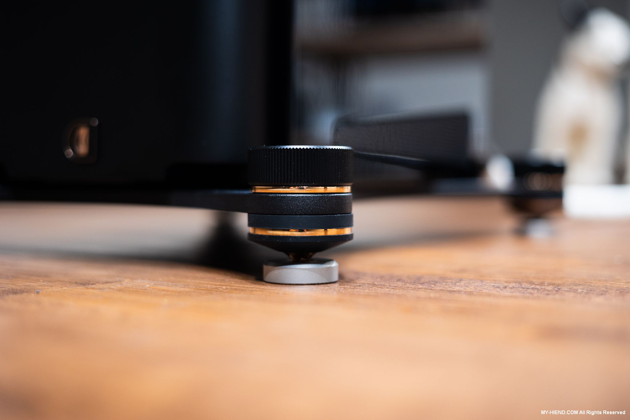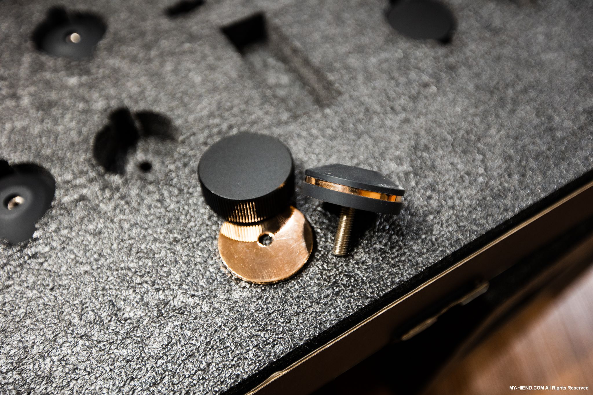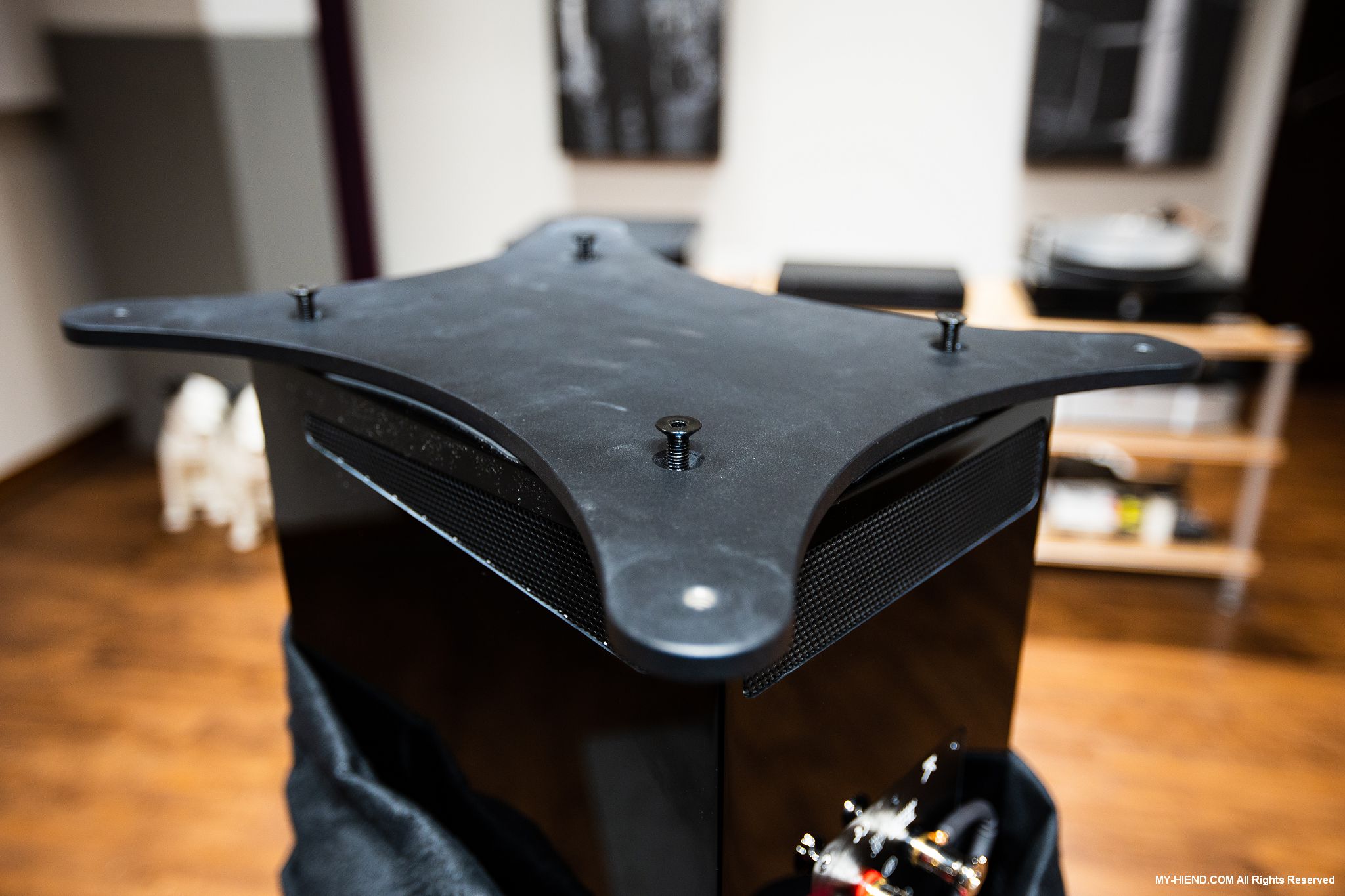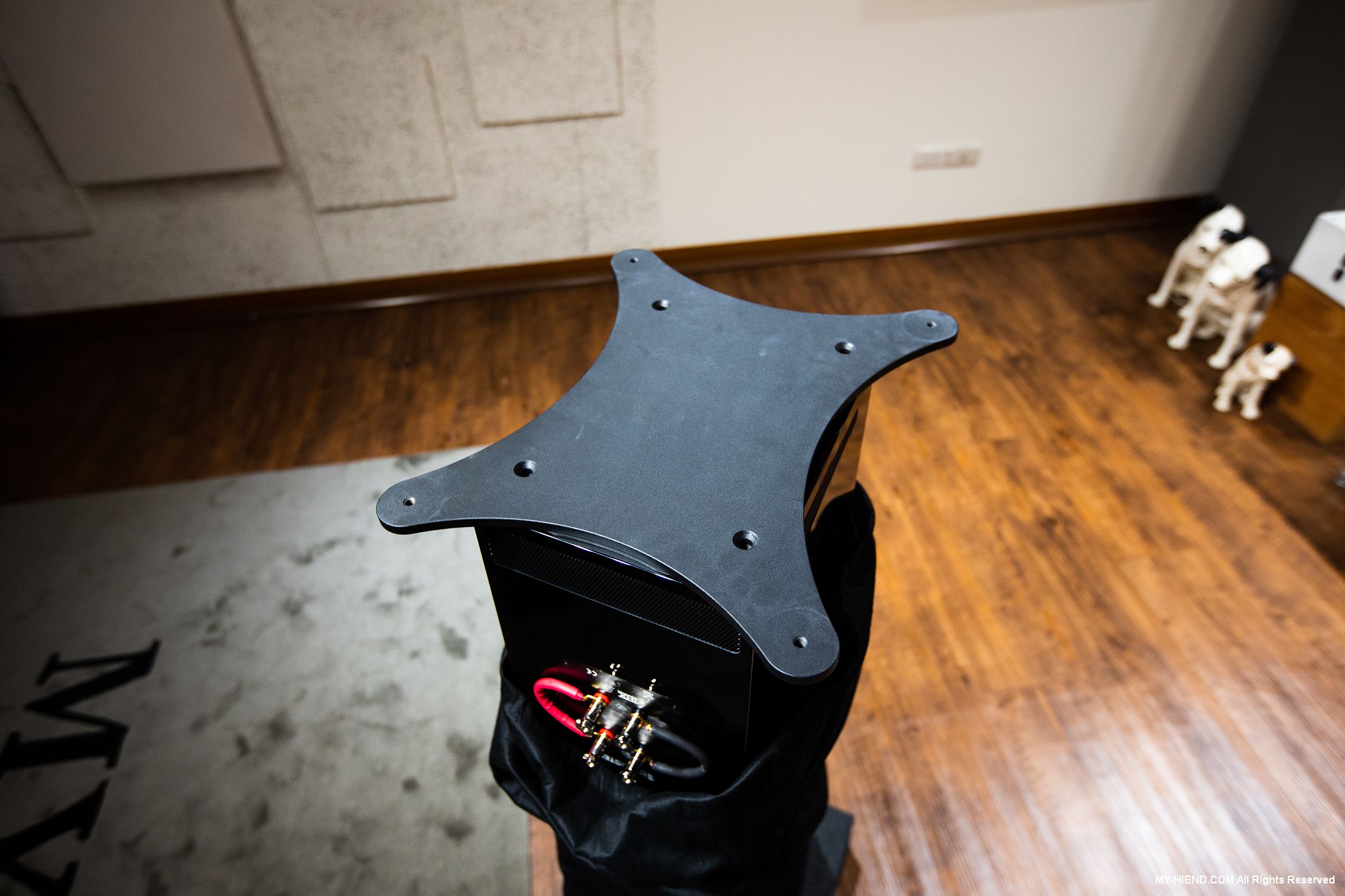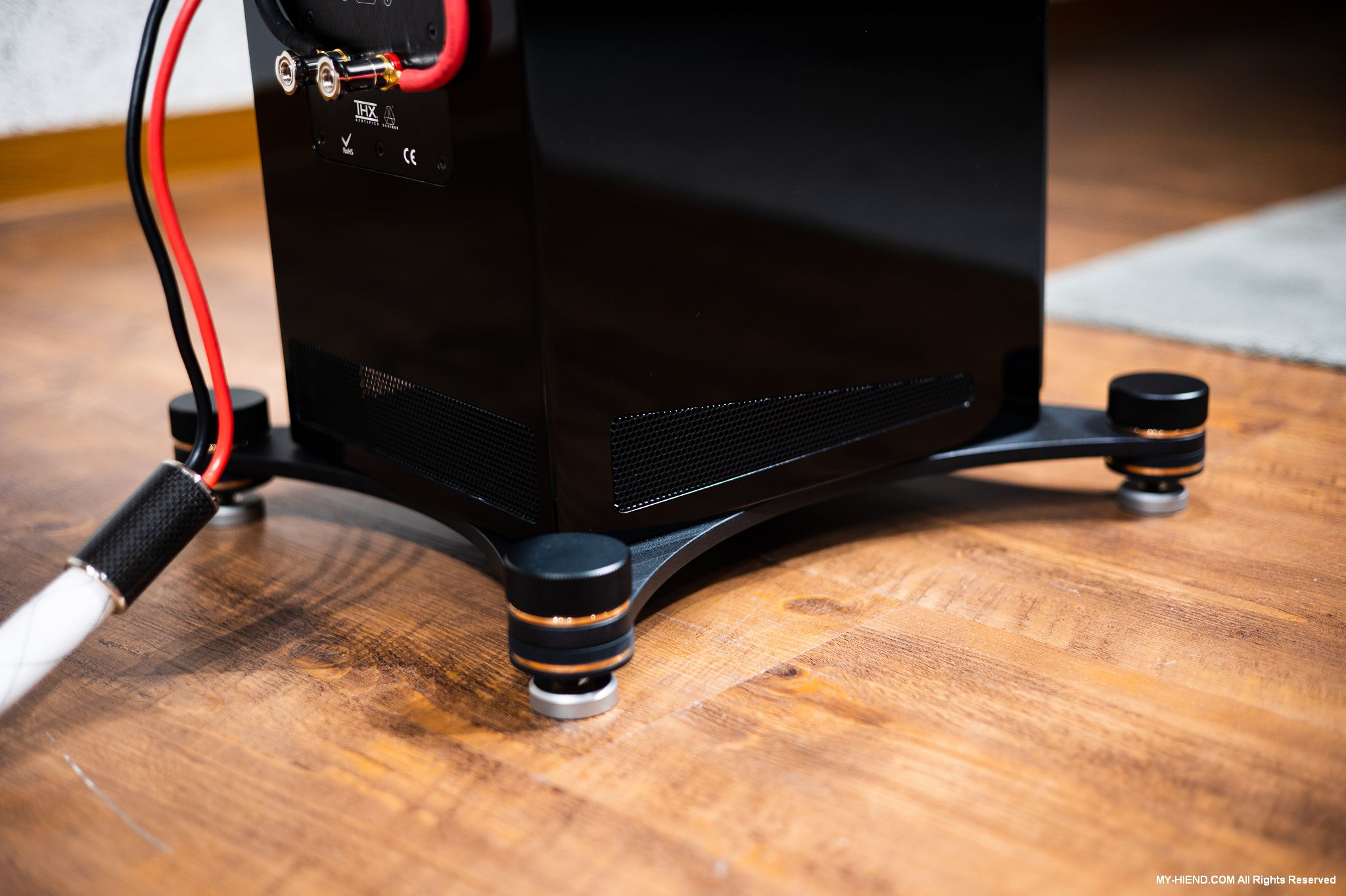 R5t落地喇叭的正面可以看到5個單體配置,以高音單體為中心採對稱式排列,中央前障板採消光處理,箱體另外3側與頂部則都是玻璃烤漆處理。喇叭接線端子為高音與低音分開的兩組設計,附帶原廠跳線。4個腳錐設計完善,並有工具輔助可輕易調整高度,安裝時需先安裝一塊非常扎實的底板與喇叭箱身結合,腳錐則裝在底板上,箱體、底板與腳錐碰觸到的接合處都有橡膠材質介於其中,除了接觸更密合以外也有消振效果。