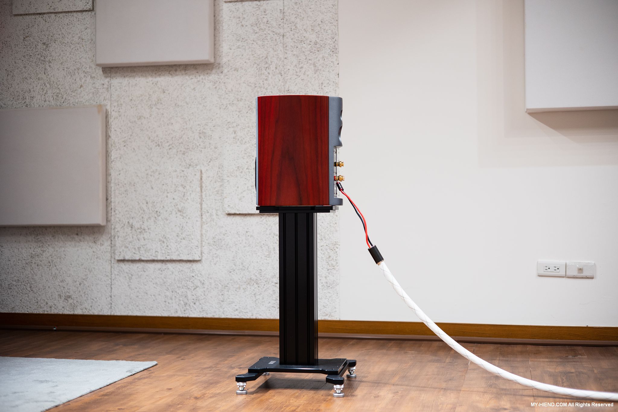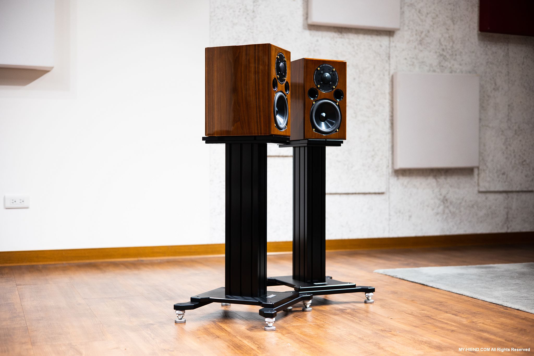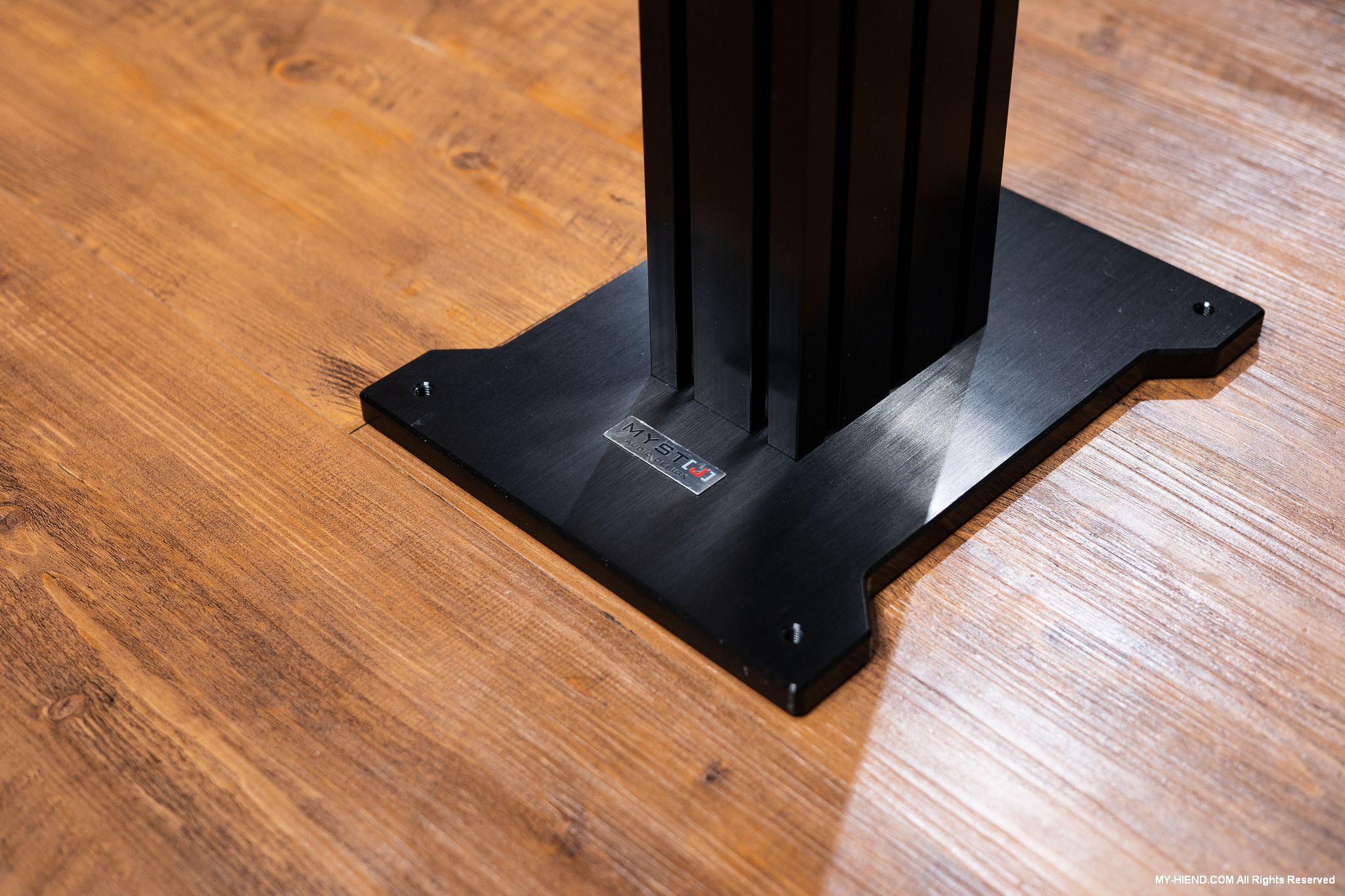 半年前我們收到MYSTJ最新的MSS60喇叭架後,便在多次書架喇叭的評測中使用,對喇叭的幫助非常明顯。MSS60型號後方的數字是架子的高度,系列中還有50~120公分的不同高度可選,已經涵蓋大部份有可能使用的喇叭架高度。承板和支柱的整體材質都是鋁合金,外觀是黑色陽極處理,在支柱中央填充鋼珠,完成品大約20公斤並附有角錐、調整環、墊片。MSS最重要重點是上方承板的設計可以調整承板寬度與深度的,這是為了因應不同書架喇叭的底寬,這個聰明的設計完善了安全與美觀。