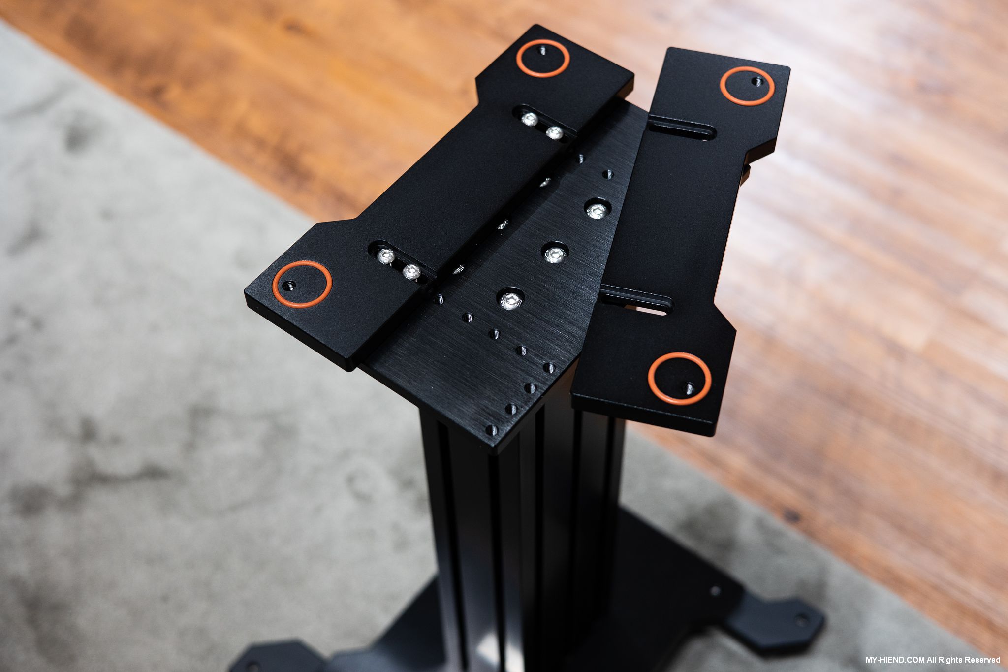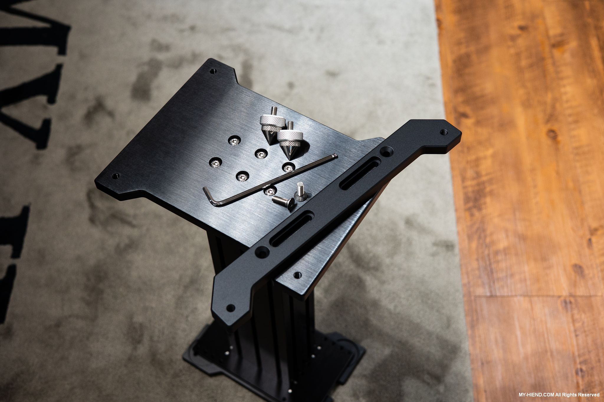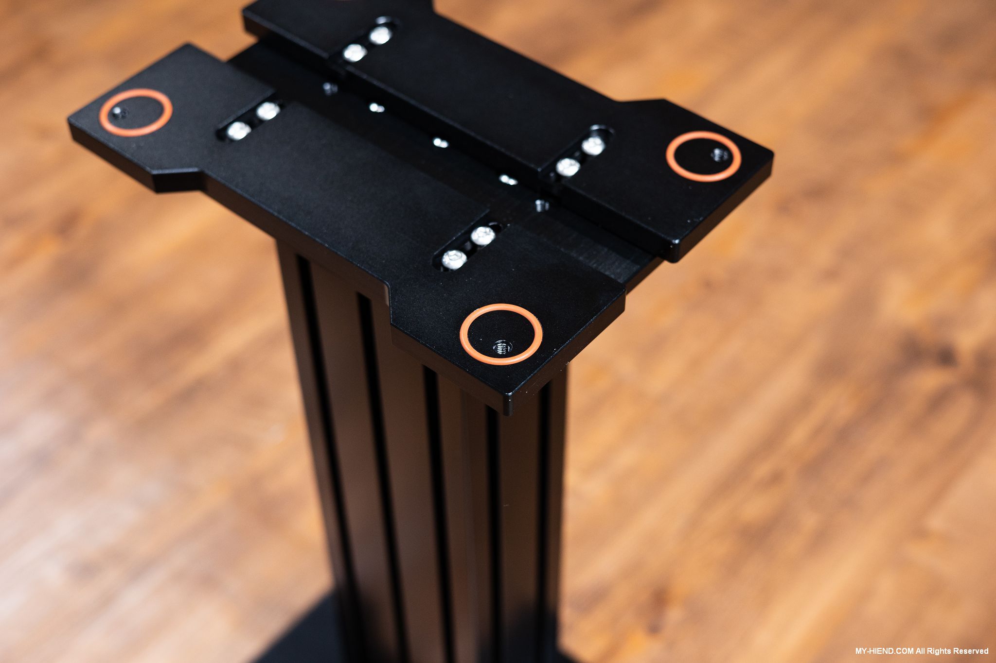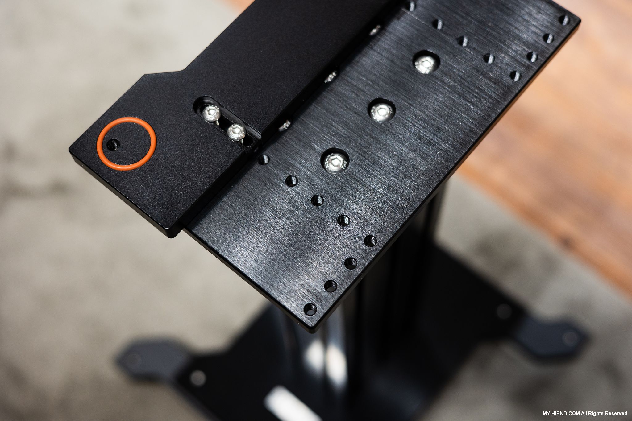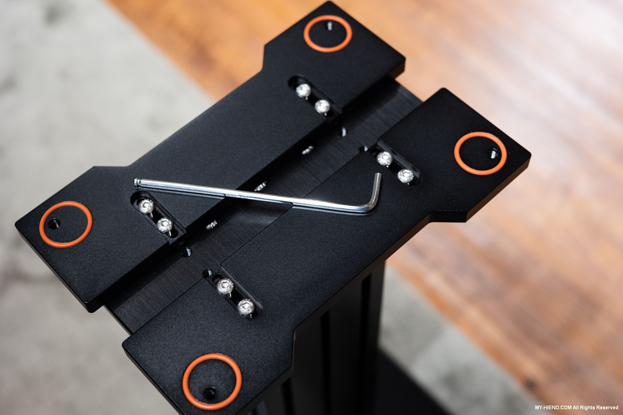 MSS喇叭架的頂板前後兩側各有排成ㄇ字形的14個孔洞,搭配兩塊獨立且留有螺絲孔的承板,可以透過選擇頂板孔洞安裝成不同寬度或深度的喇叭擺放面積。調整時可選擇調整寬度或者深度,尺寸面積為寬160~232mm/深260mm或者是寬260mm/深240~300mm,另外也接受客製化尺寸。在接觸喇叭底部的4個角落,MYSTJ也有O型橡膠環提供減震及防刮的效果。如果用家不需要可調整的喇叭架,廠方也有PSS系列產品,同樣都由鋁合金打造,僅少了尺寸調整功能。