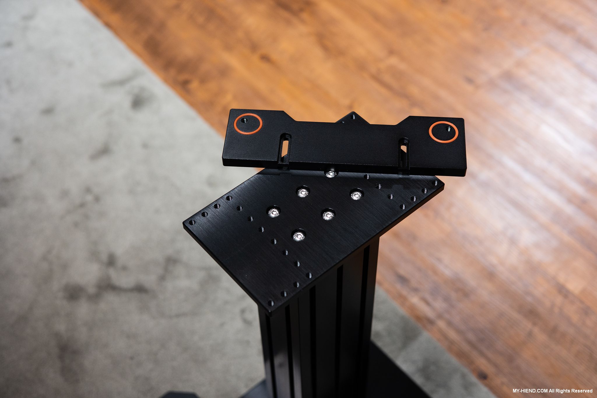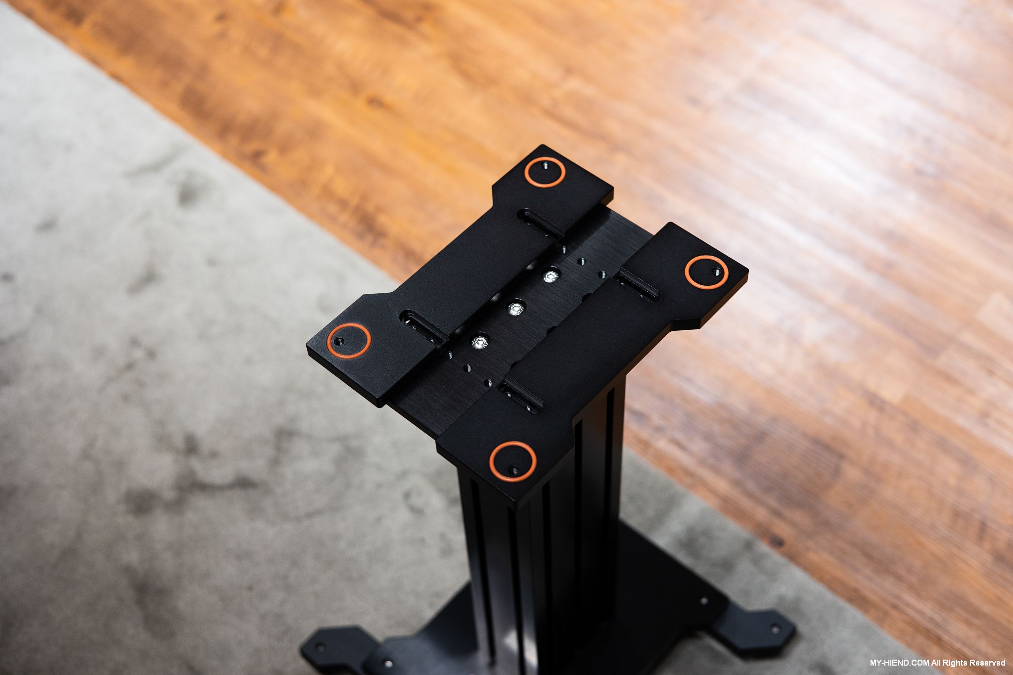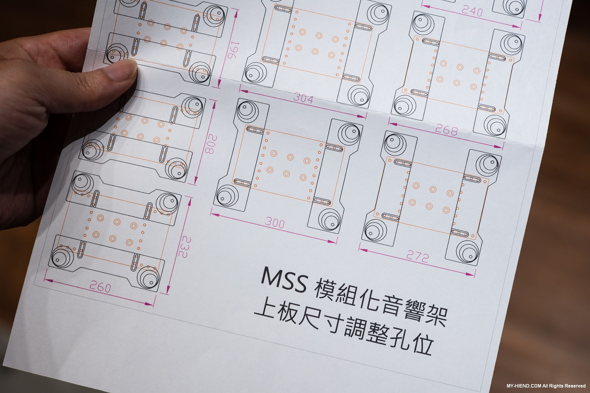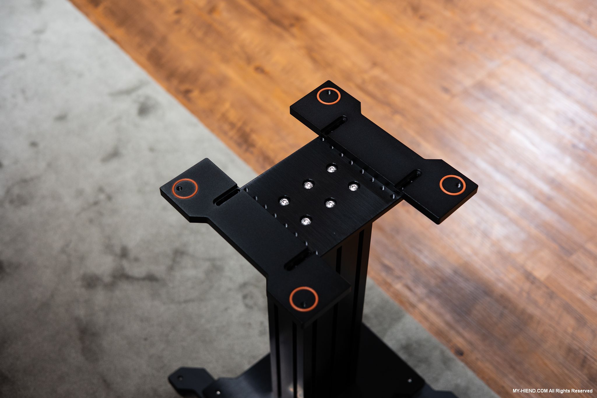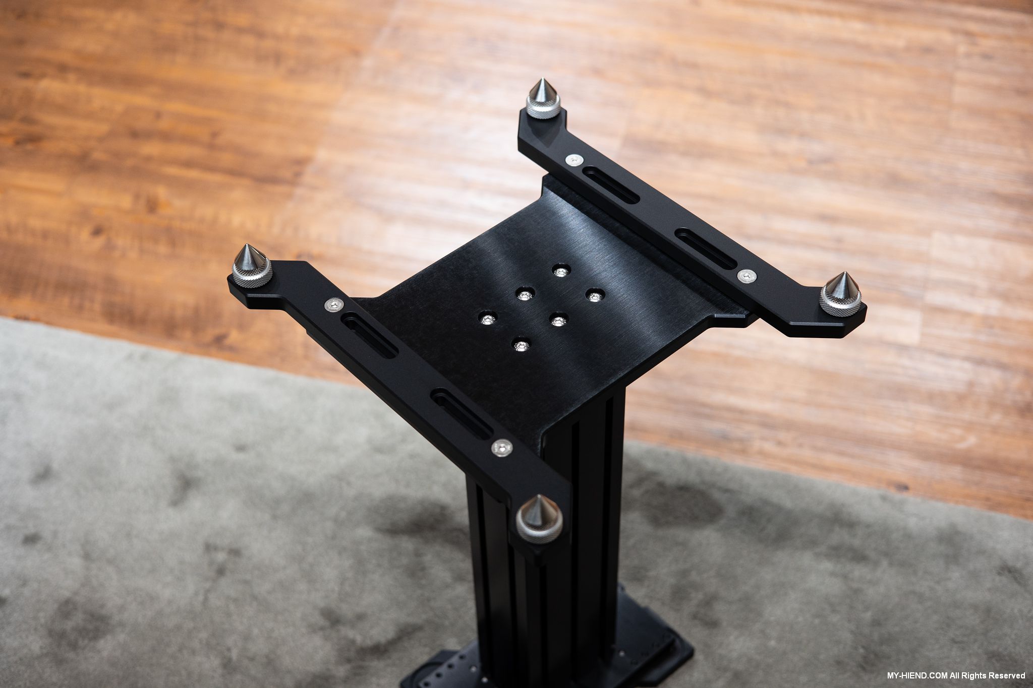 MSS喇叭架的頂板前後兩側各有排成ㄇ字形的14個孔洞,搭配兩塊獨立且留有螺絲孔的承板,可以透過選擇頂板孔洞安裝成不同寬度或深度的喇叭擺放面積。調整時可選擇調整寬度或者深度,尺寸面積為寬160~232mm/深260mm或者是寬260mm/深240~300mm,另外也接受客製化尺寸。在接觸喇叭底部的4個角落,MYSTJ也有O型橡膠環提供減震及防刮的效果。如果用家不需要可調整的喇叭架,廠方也有PSS系列產品,同樣都由鋁合金打造,僅少了尺寸調整功能。