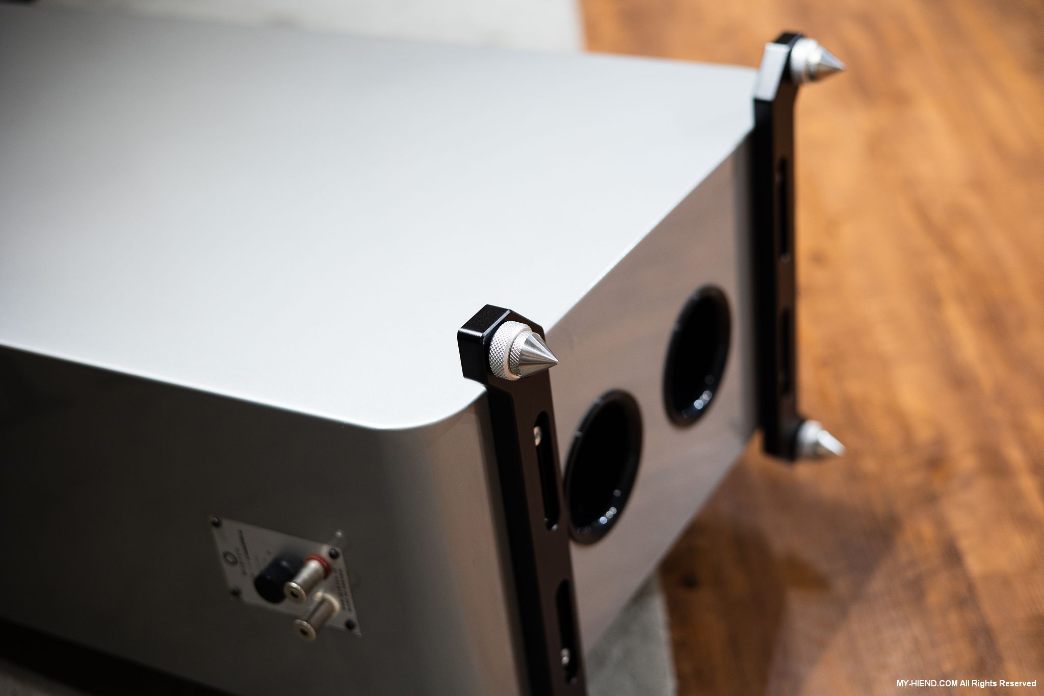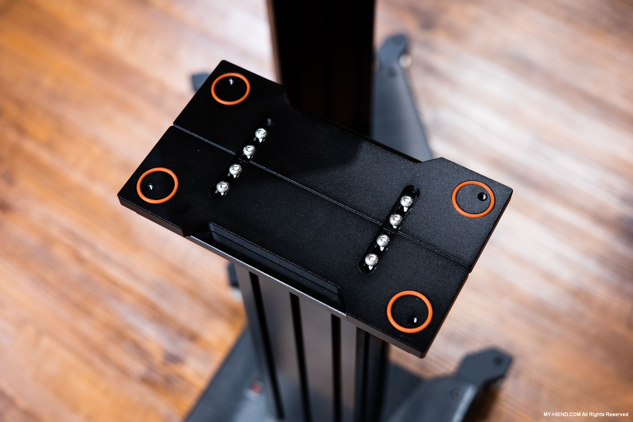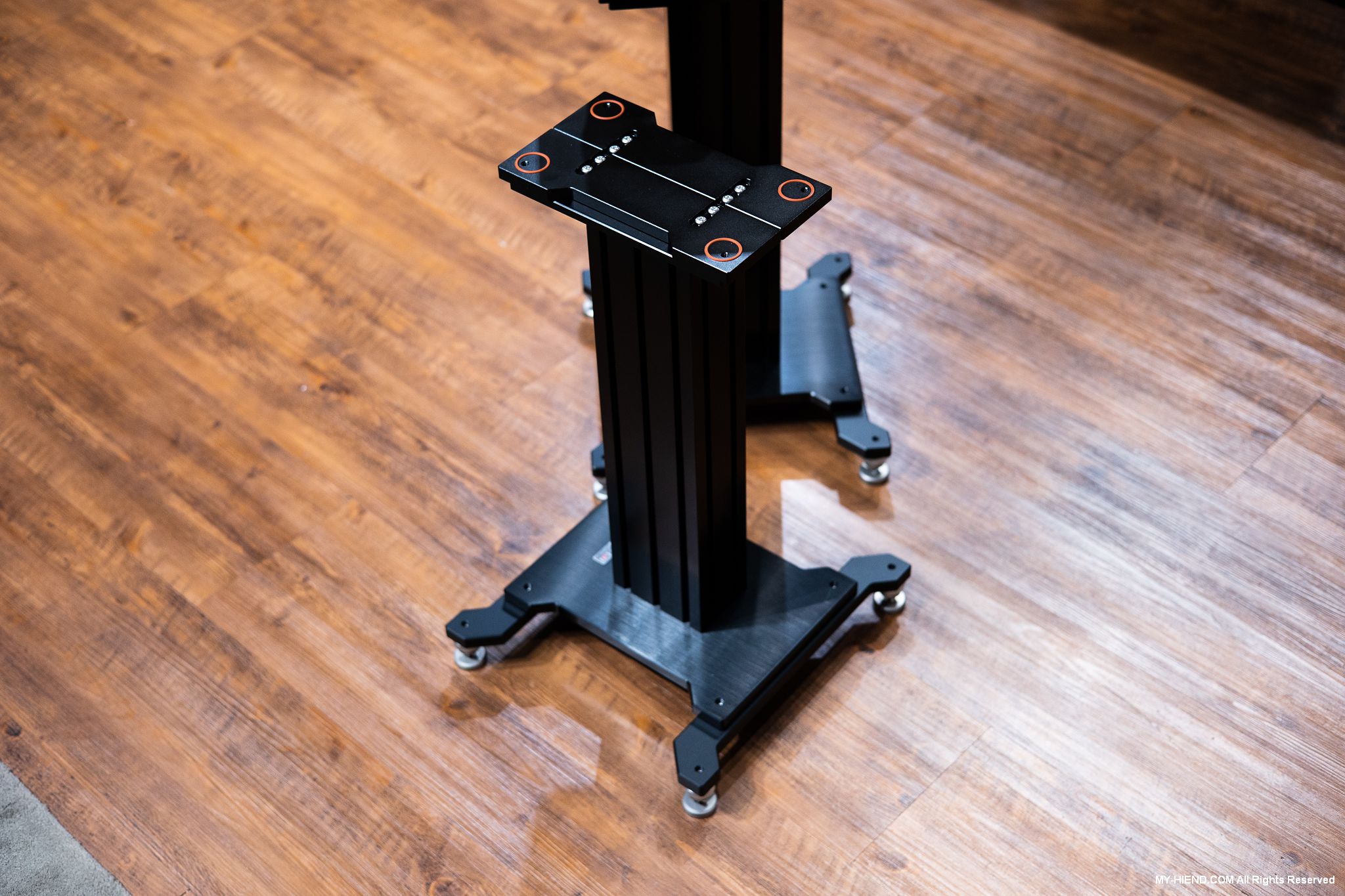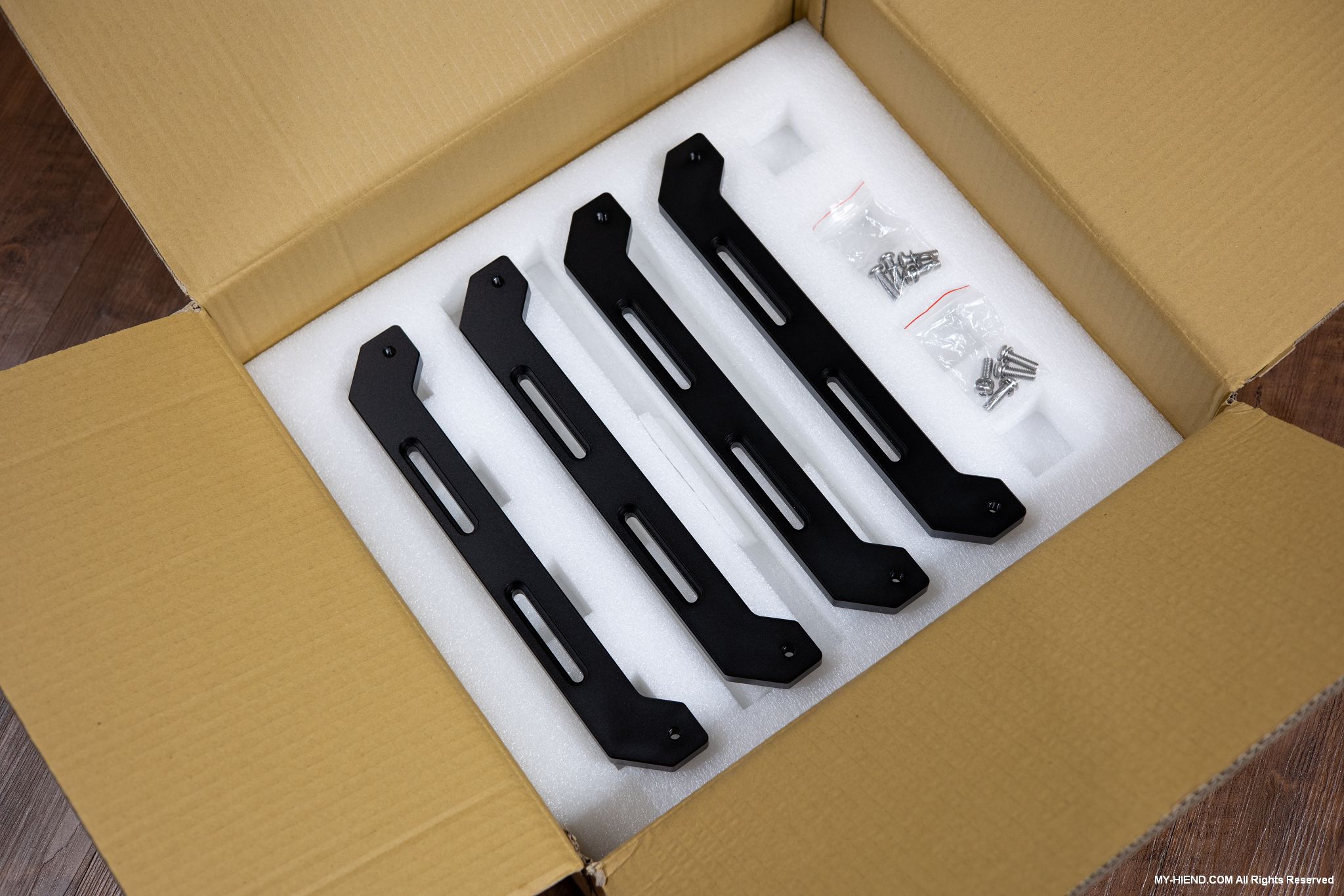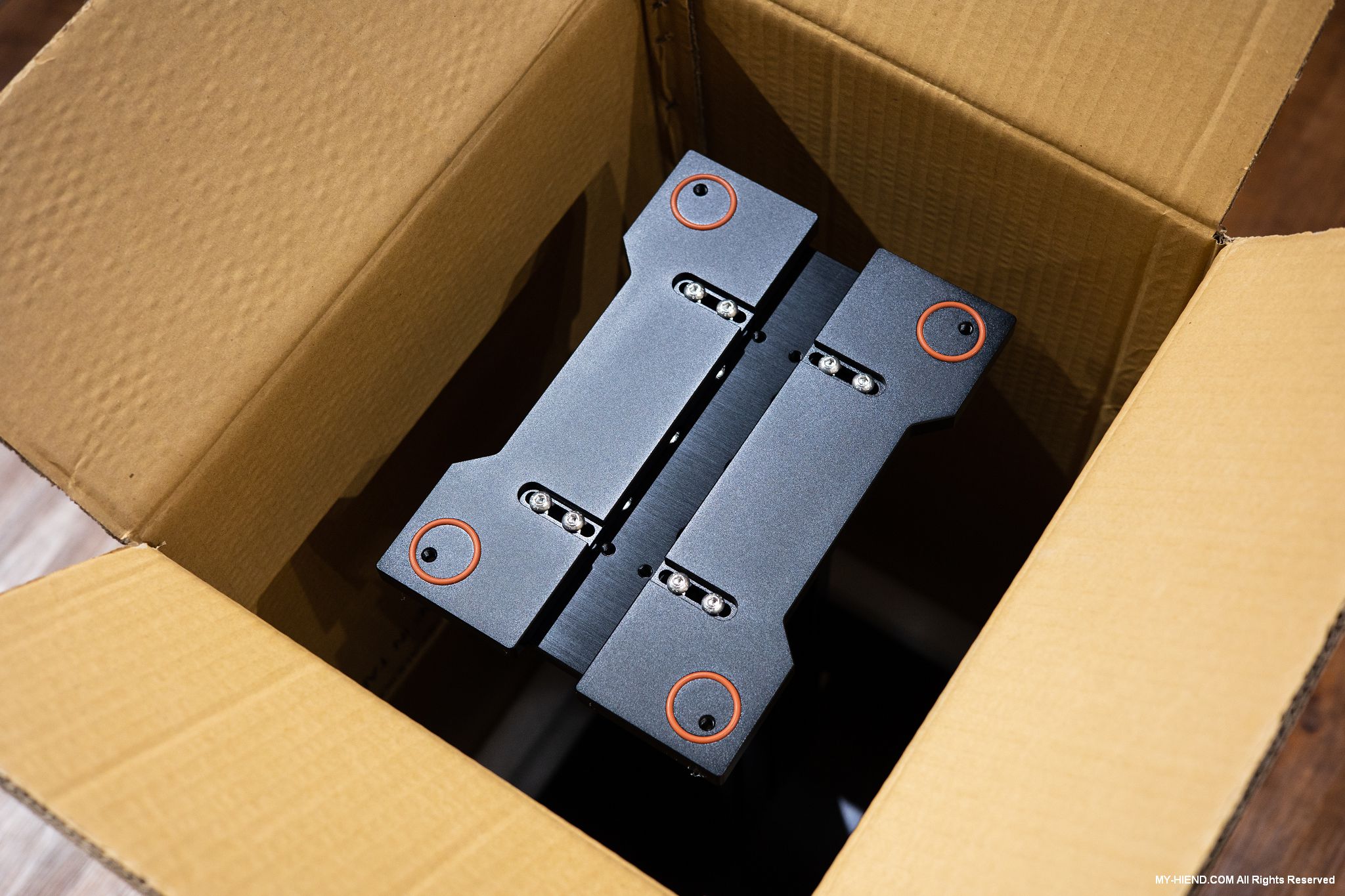 MSS喇叭架的頂板前後兩側各有排成ㄇ字形的14個孔洞,搭配兩塊獨立且留有螺絲孔的承板,可以透過選擇頂板孔洞安裝成不同寬度或深度的喇叭擺放面積。調整時可選擇調整寬度或者深度,尺寸面積為寬160~232mm/深260mm或者是寬260mm/深240~300mm,另外也接受客製化尺寸。在接觸喇叭底部的4個角落,MYSTJ也有O型橡膠環提供減震及防刮的效果。如果用家不需要可調整的喇叭架,廠方也有PSS系列產品,同樣都由鋁合金打造,僅少了尺寸調整功能。