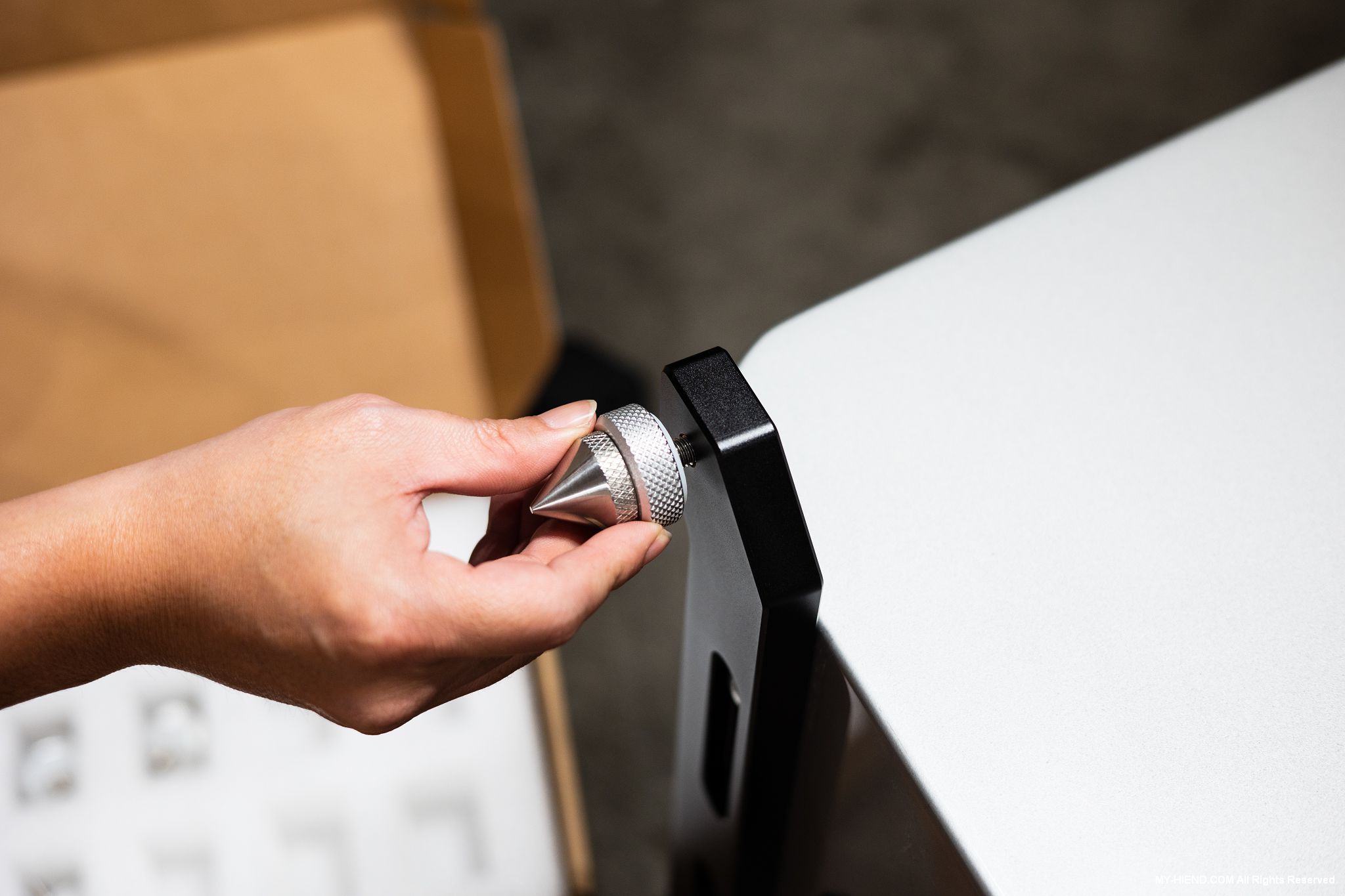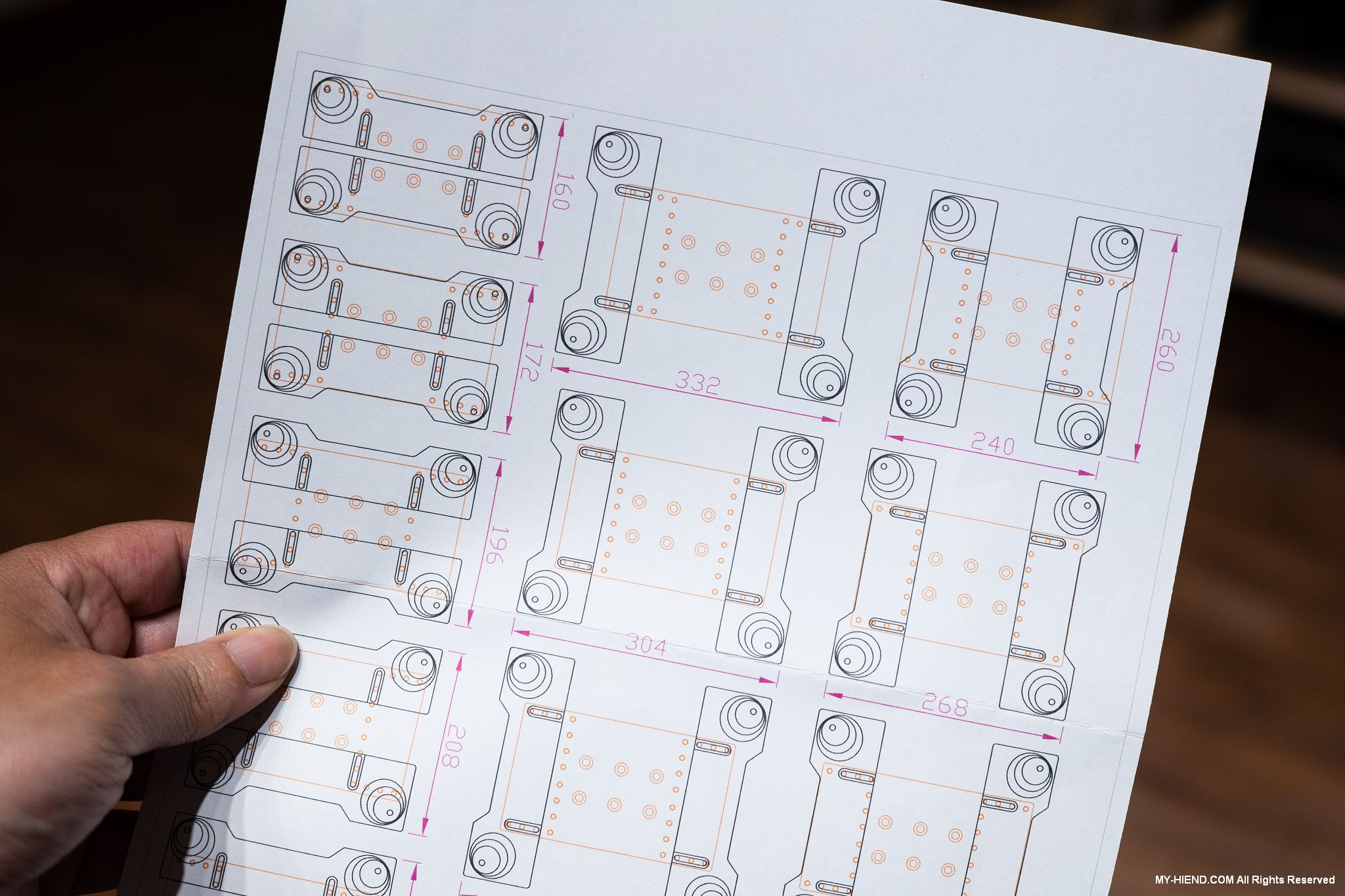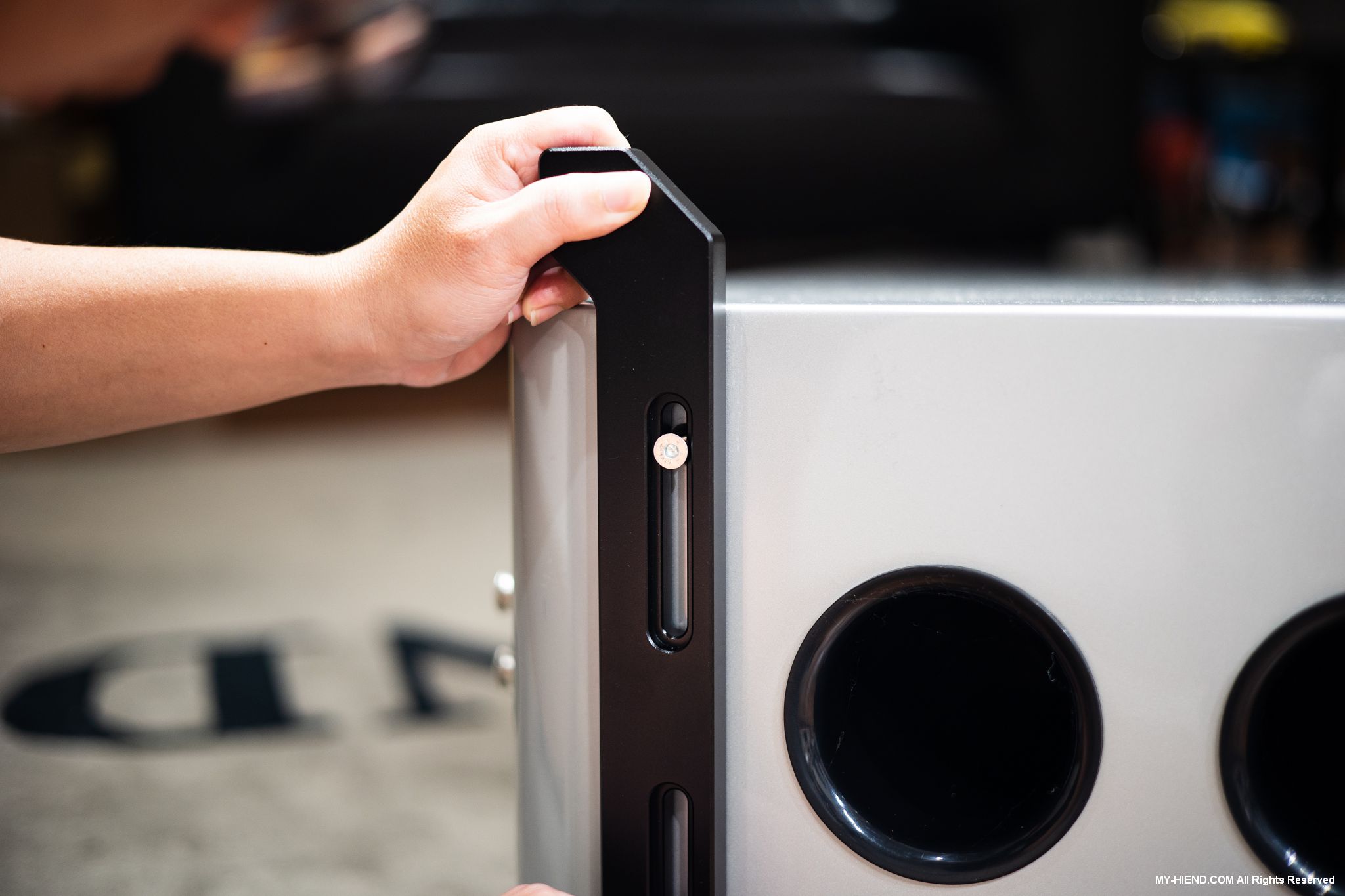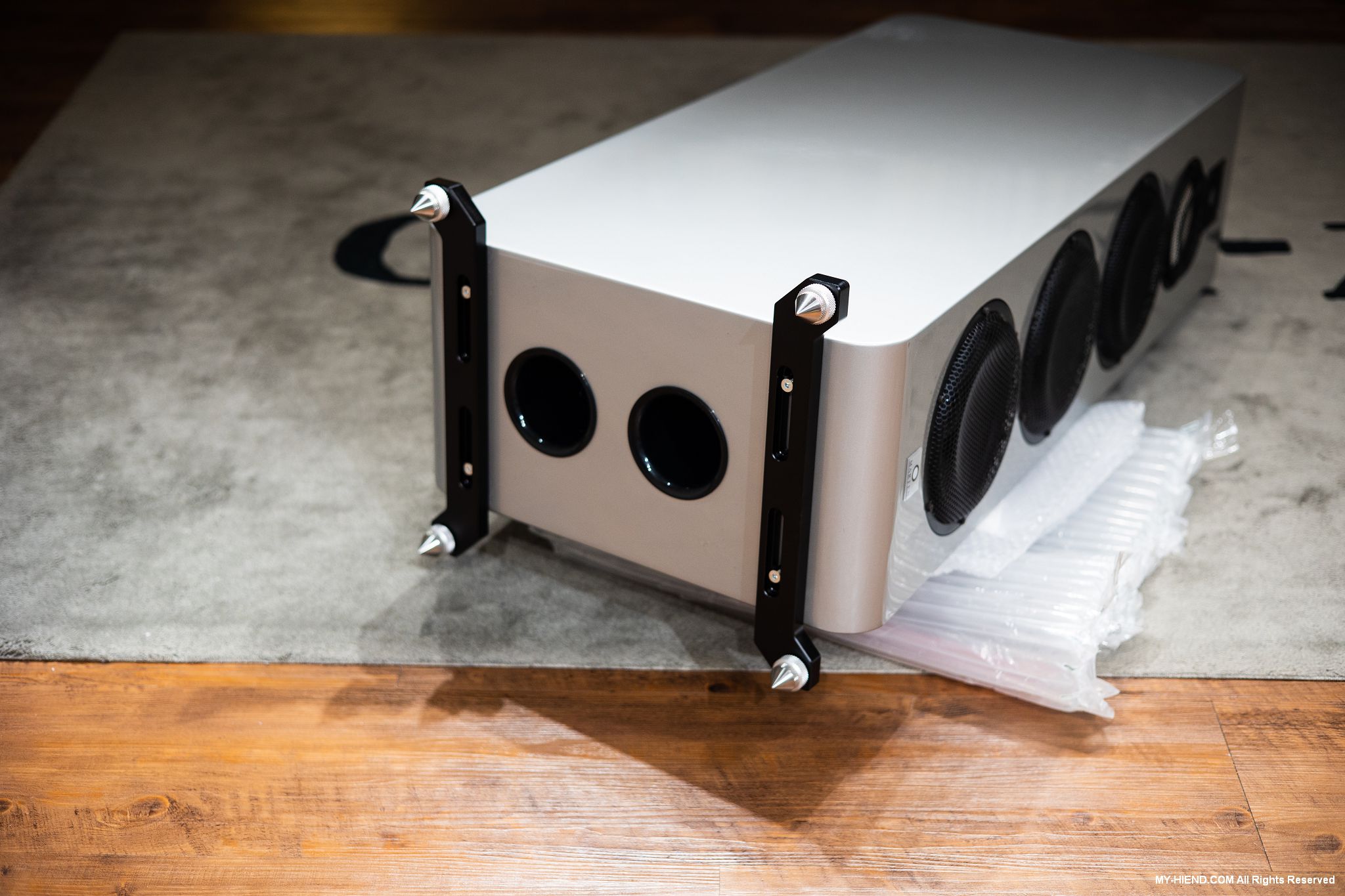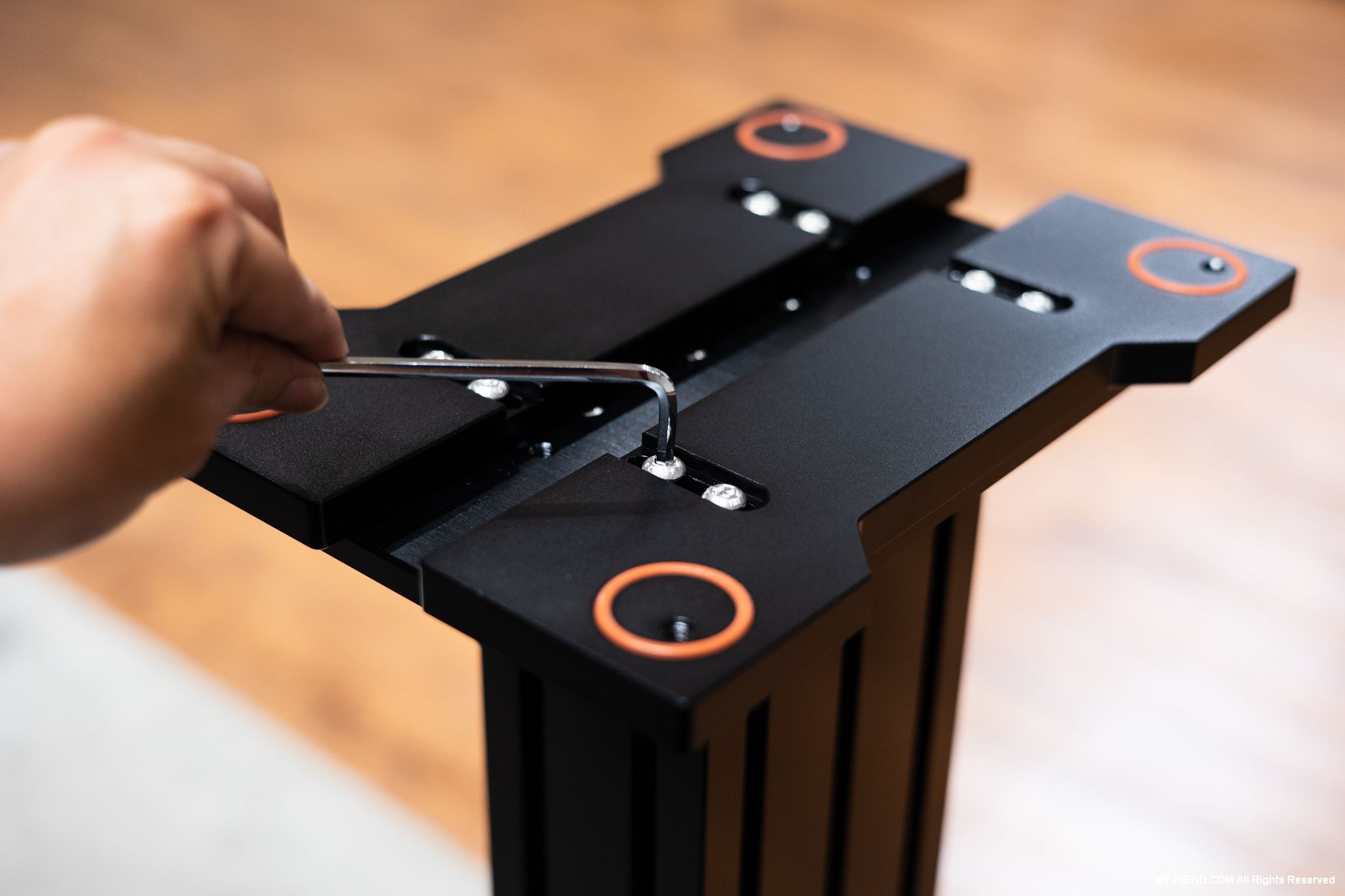 MSS喇叭架的頂板前後兩側各有排成ㄇ字形的14個孔洞,搭配兩塊獨立且留有螺絲孔的承板,可以透過選擇頂板孔洞安裝成不同寬度或深度的喇叭擺放面積。調整時可選擇調整寬度或者深度,尺寸面積為寬160~232mm/深260mm或者是寬260mm/深240~300mm,另外也接受客製化尺寸。在接觸喇叭底部的4個角落,MYSTJ也有O型橡膠環提供減震及防刮的效果。如果用家不需要可調整的喇叭架,廠方也有PSS系列產品,同樣都由鋁合金打造,僅少了尺寸調整功能。