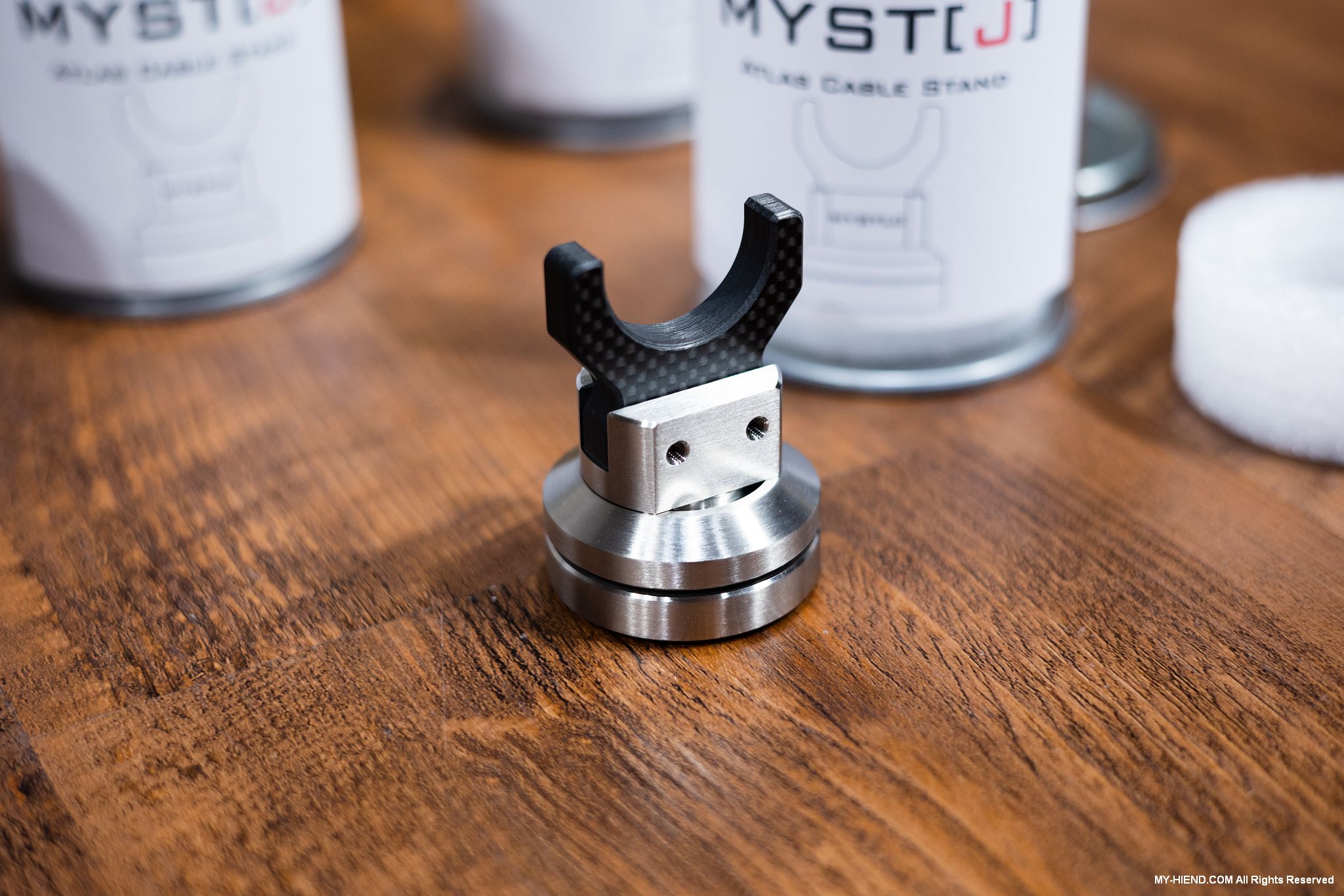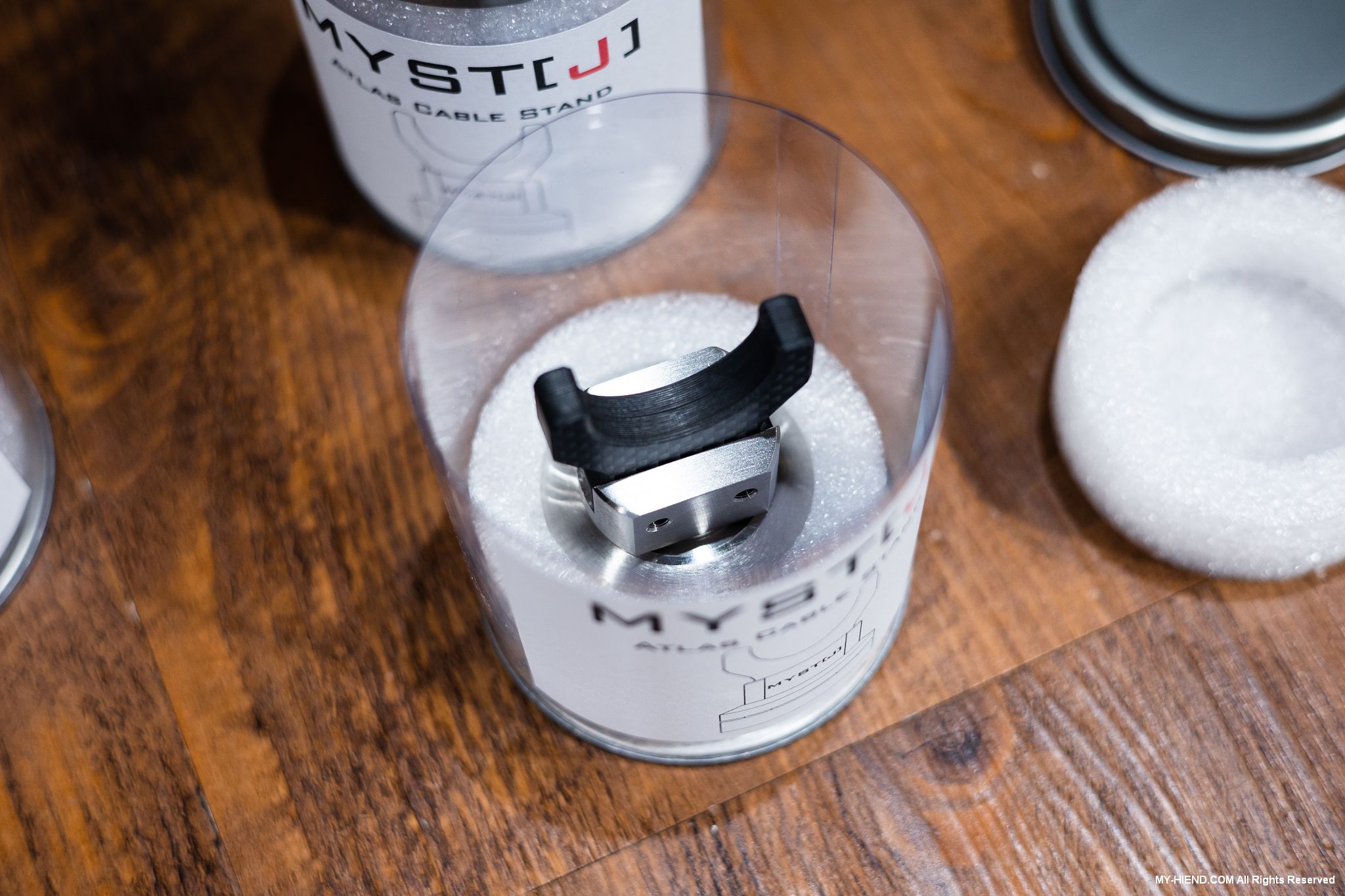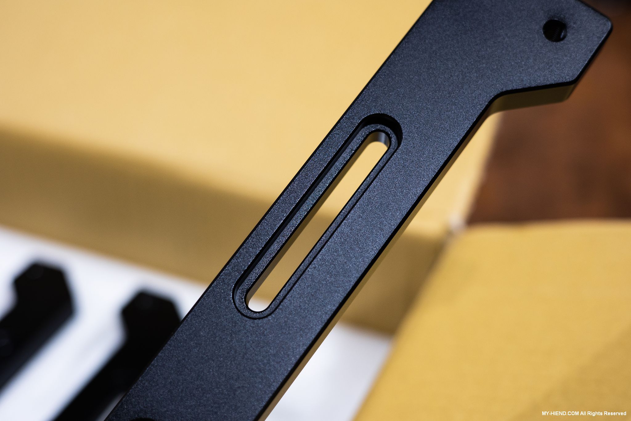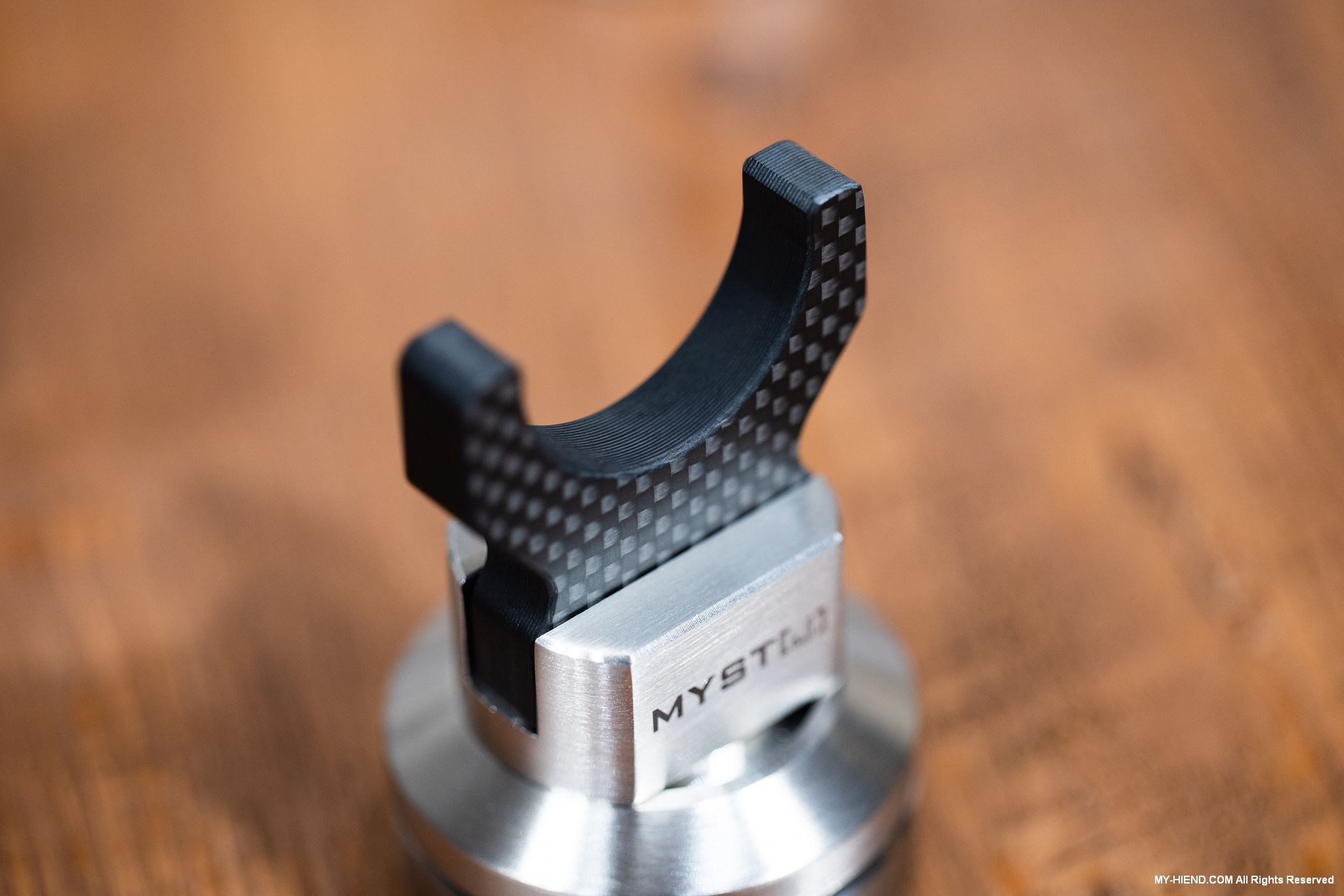 最後一項產品是架線器,很多品牌都已經有類似的產品,MYSTJ架線器使用鋁合金切削製作底座,與線材接觸的部分為碳纖維板,高度不可調,擺放時稍留空間即可。設計上是讓碳纖維板接觸線身,透過架線器底部的橡膠材質與中央的陶瓷珠達到減震效果。