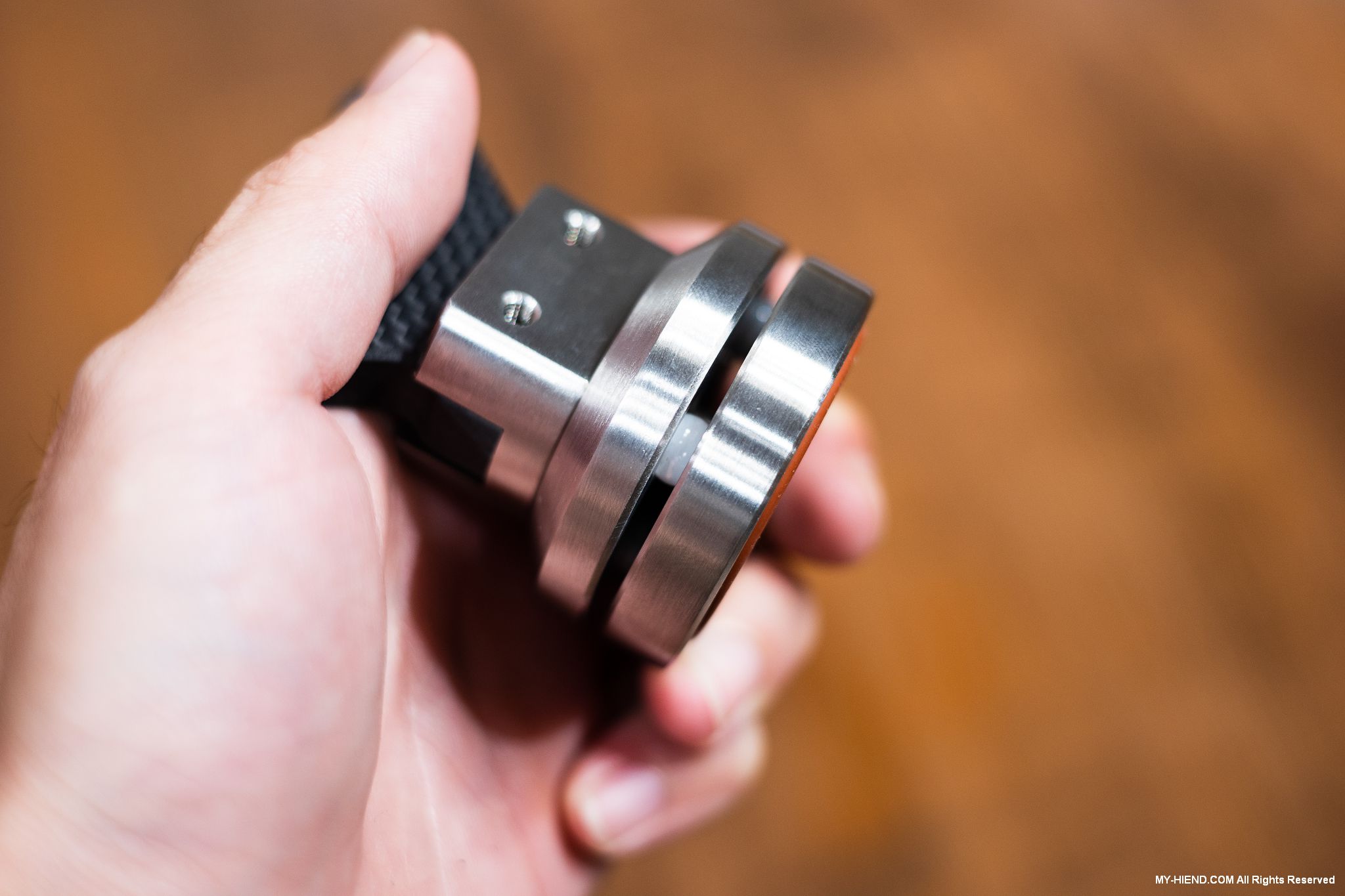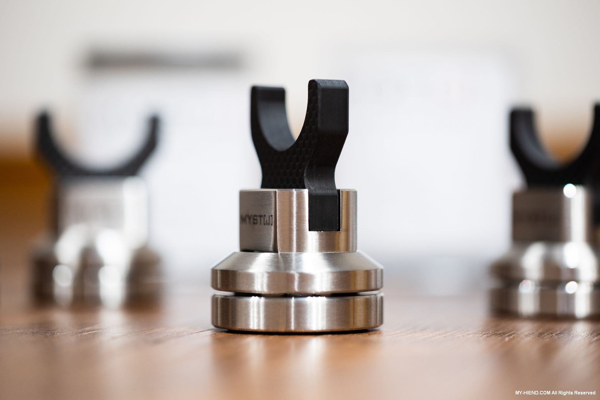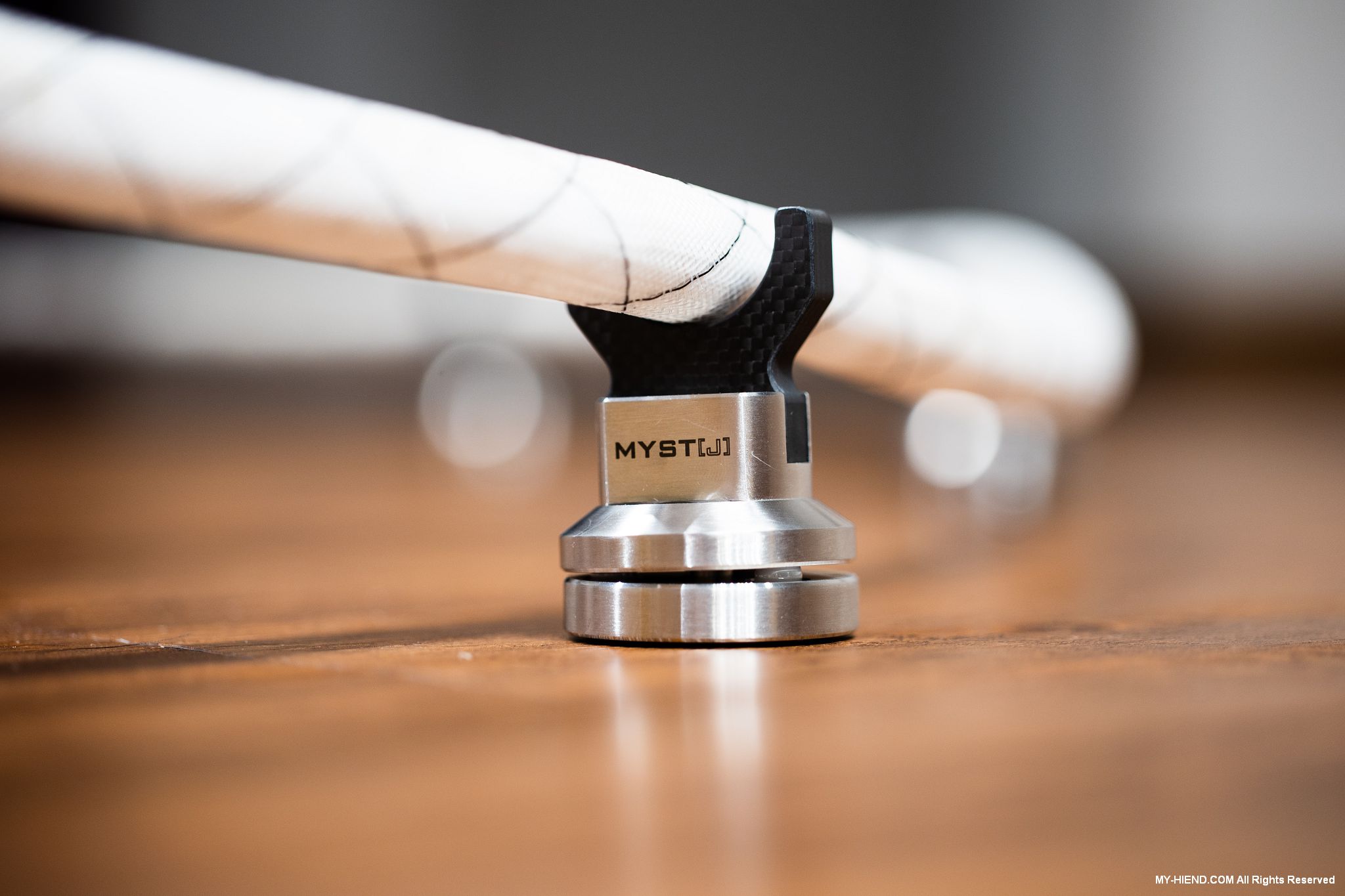 最後一項產品是架線器,很多品牌都已經有類似的產品,MYSTJ架線器使用鋁合金切削製作底座,與線材接觸的部分為碳纖維板,高度不可調,擺放時稍留空間即可。設計上是讓碳纖維板接觸線身,透過架線器底部的橡膠材質與中央的陶瓷珠達到減震效果。
