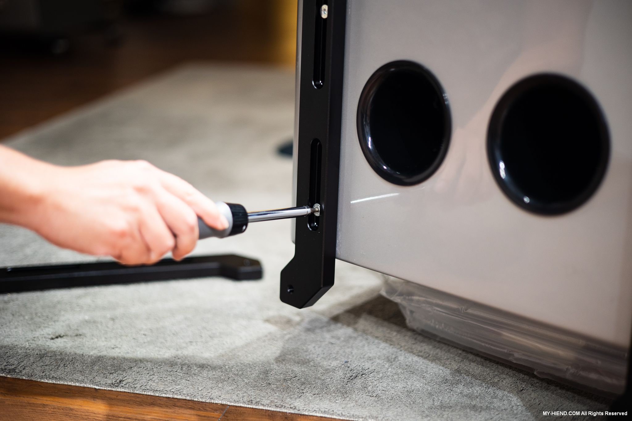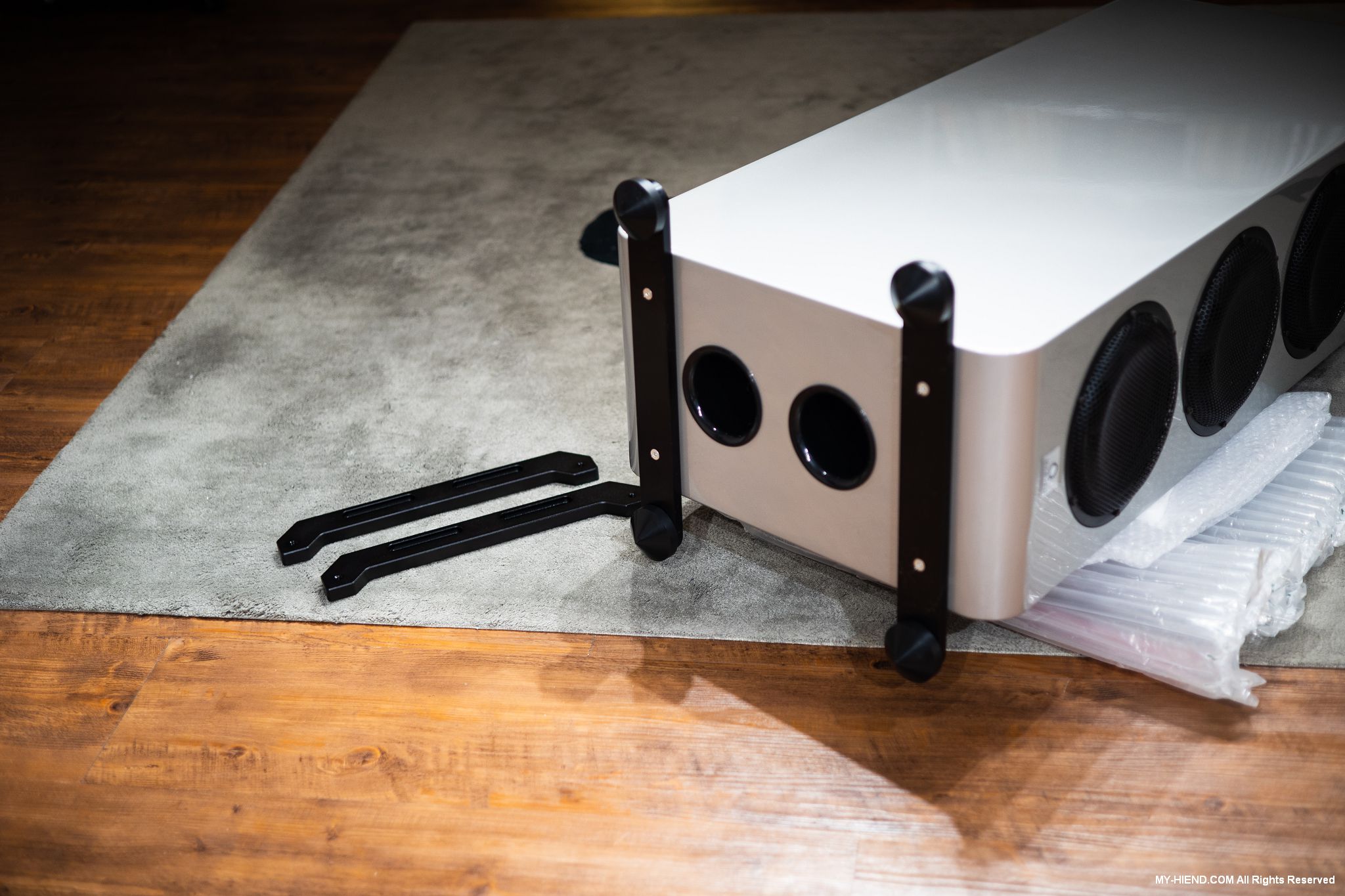 每隻支架在中央靠左右兩側各有一個可鎖螺絲的長型空間,由於每對喇叭底部的螺絲孔位間距不同,這是一個極為彈性的設計。雖然廠方有附M8規格螺絲,但喇叭本身原廠底座應有螺絲,直接照用就好。