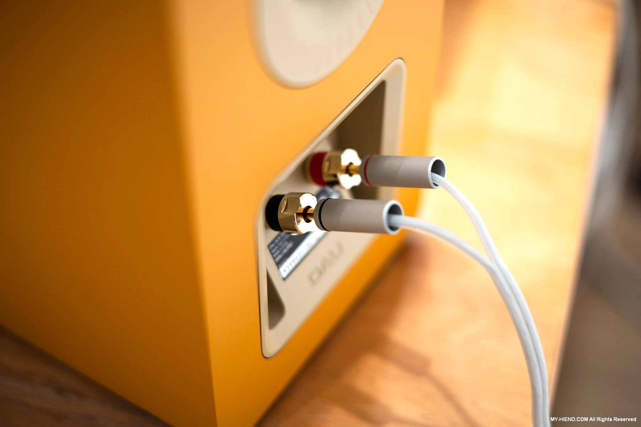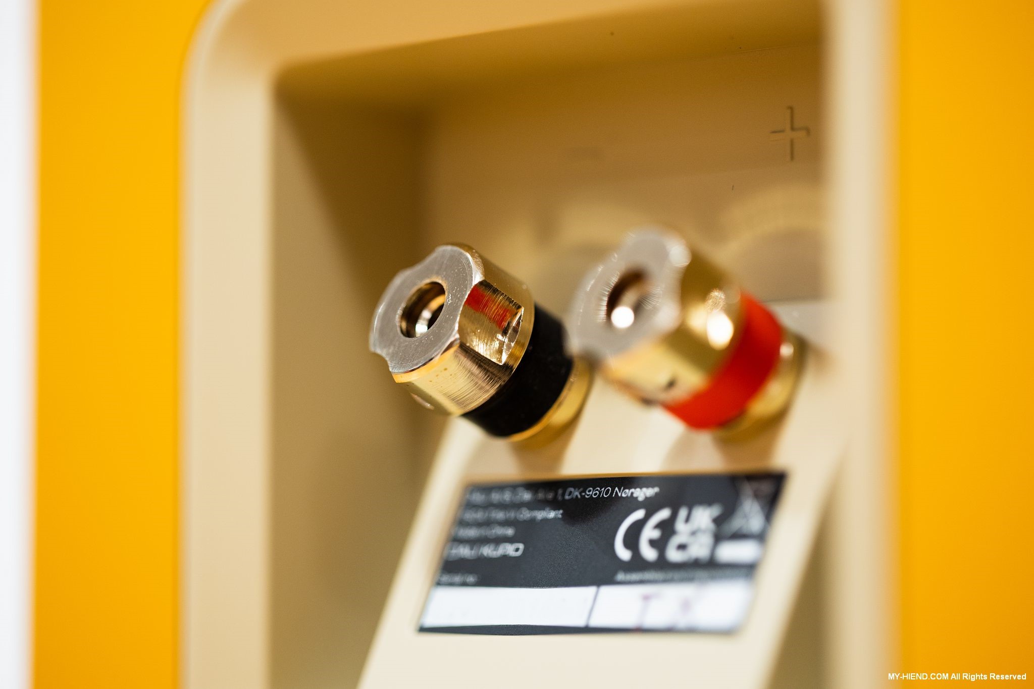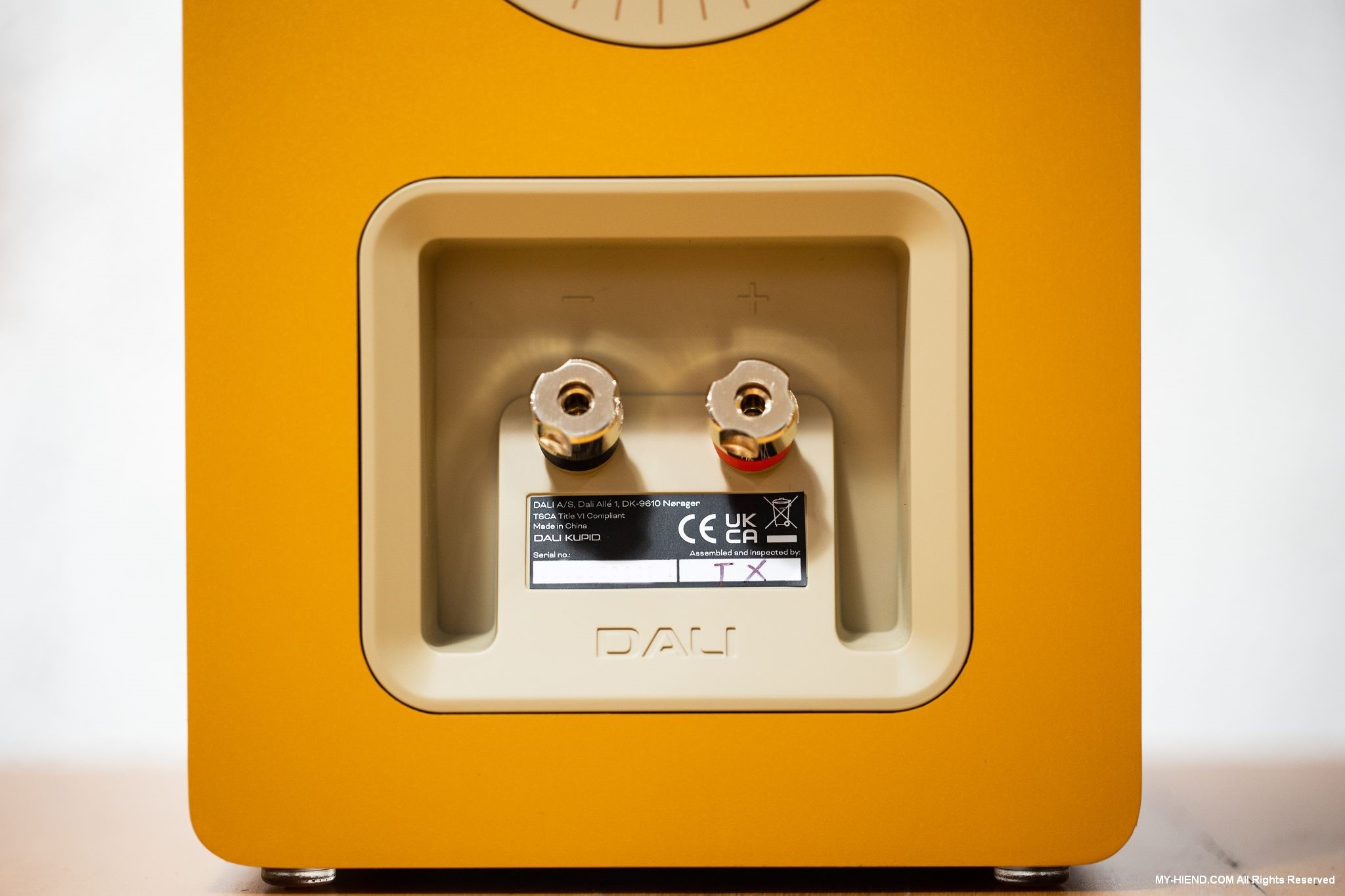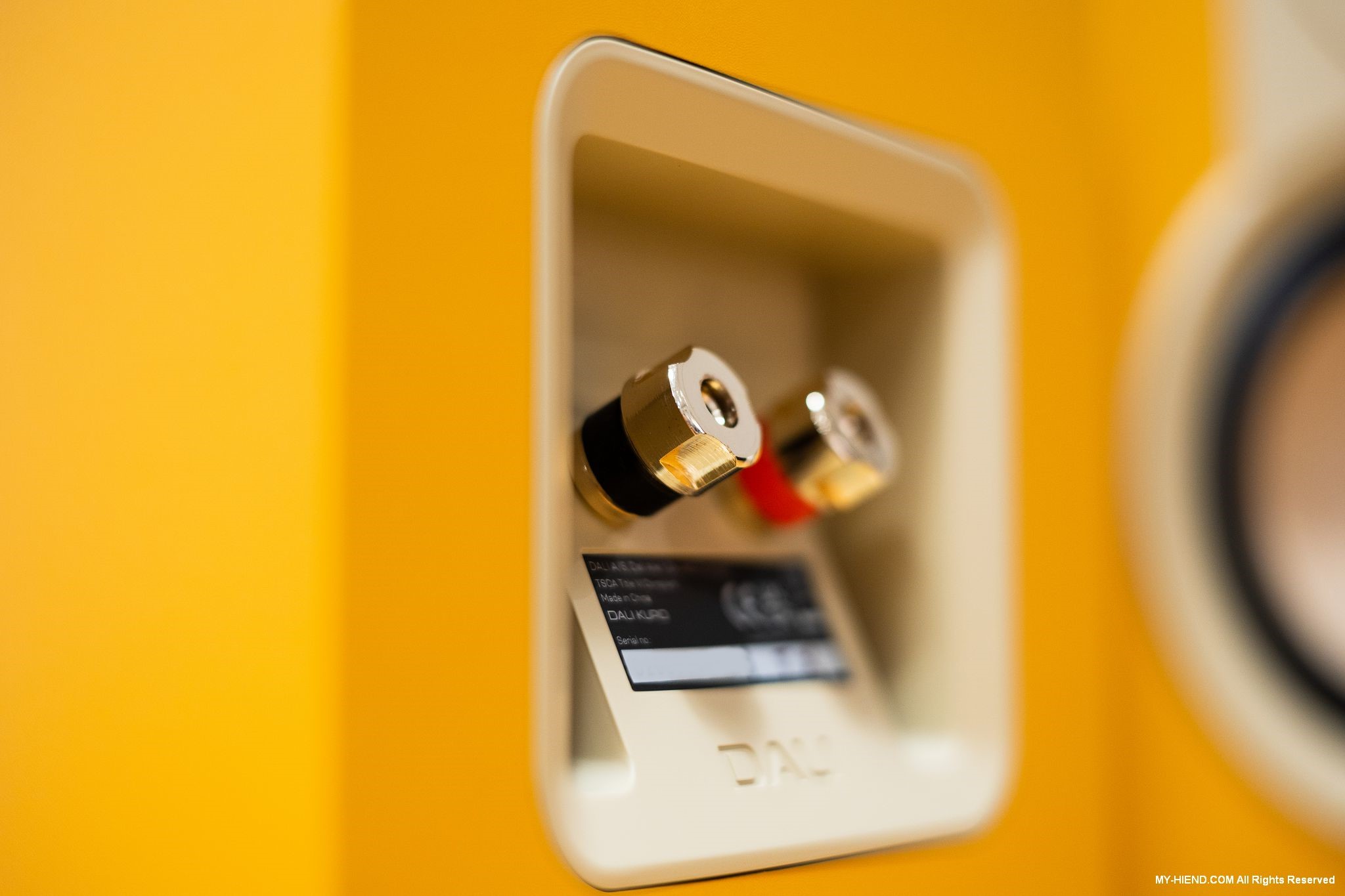 低音反射孔(Dual Flare Bass Port)位於背面上方,喇叭輸入為Single-Wiring設計,喇叭端子質感很好