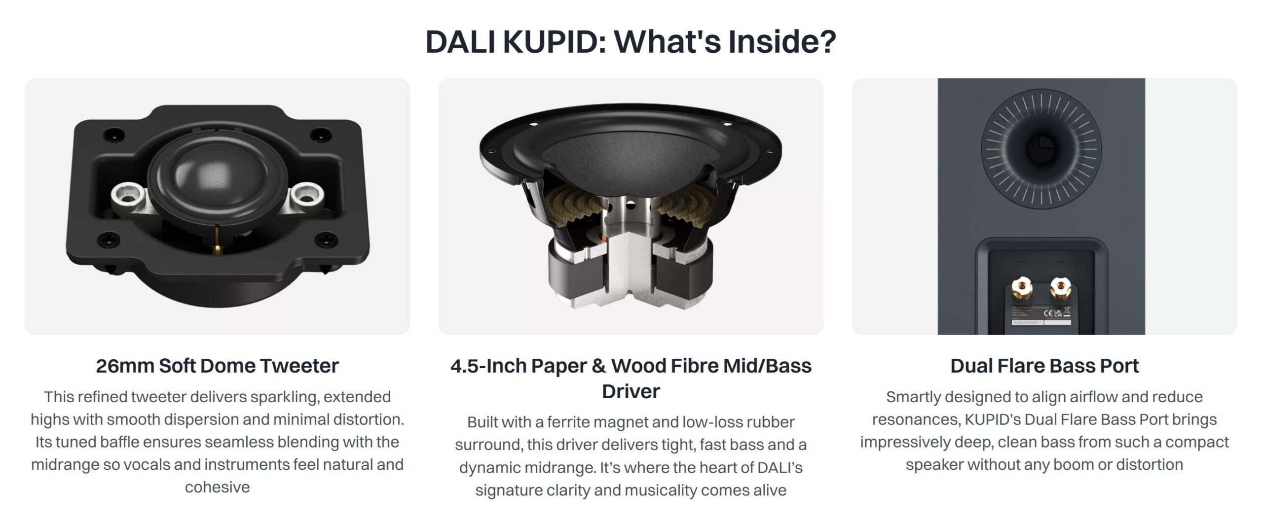 DALI KUPID則是採用傳統被動式設計,喇叭本身就是單純聲學設計,內部容積都使用在物理聲學上,被動式分音電路和單體本身結構單純、耐用度高,正常使用下很難會出問題。音樂愛好者可以自由搭配不同器材使用,現今的數位串流訊源以及擴大機選擇極多,而且同樣小巧,專業程度與易用程度大多都比主動式喇叭更佳,在喇叭箱內聲學考量中,被動式的單純性也是較好的選擇,未來還有分開升級的空間,無論是喇叭或者器材都可另外添加或更換。