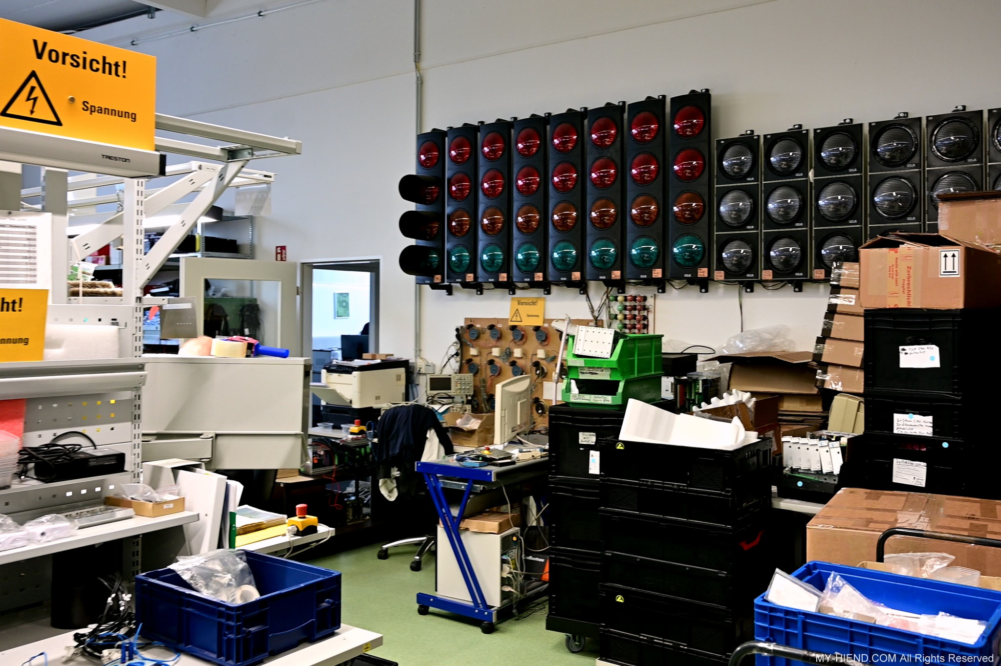 在BLB裡,看到許多供應給Burmester線路等相關組件自然是意料中事,目測現場大約佔了95%以上,那其他5%是甚麼? 其實BLB也幫其他公司研發與生產以充份利用工廠的產能,其中包括遊艇音響(Yacht Audio),交通號誌管理系統(Traffic Light Management System)、銀行或企業的出入管制系統(Access Control System)…等等,這面牆上就裝滿了交通號誌以進行研發與測試之用。