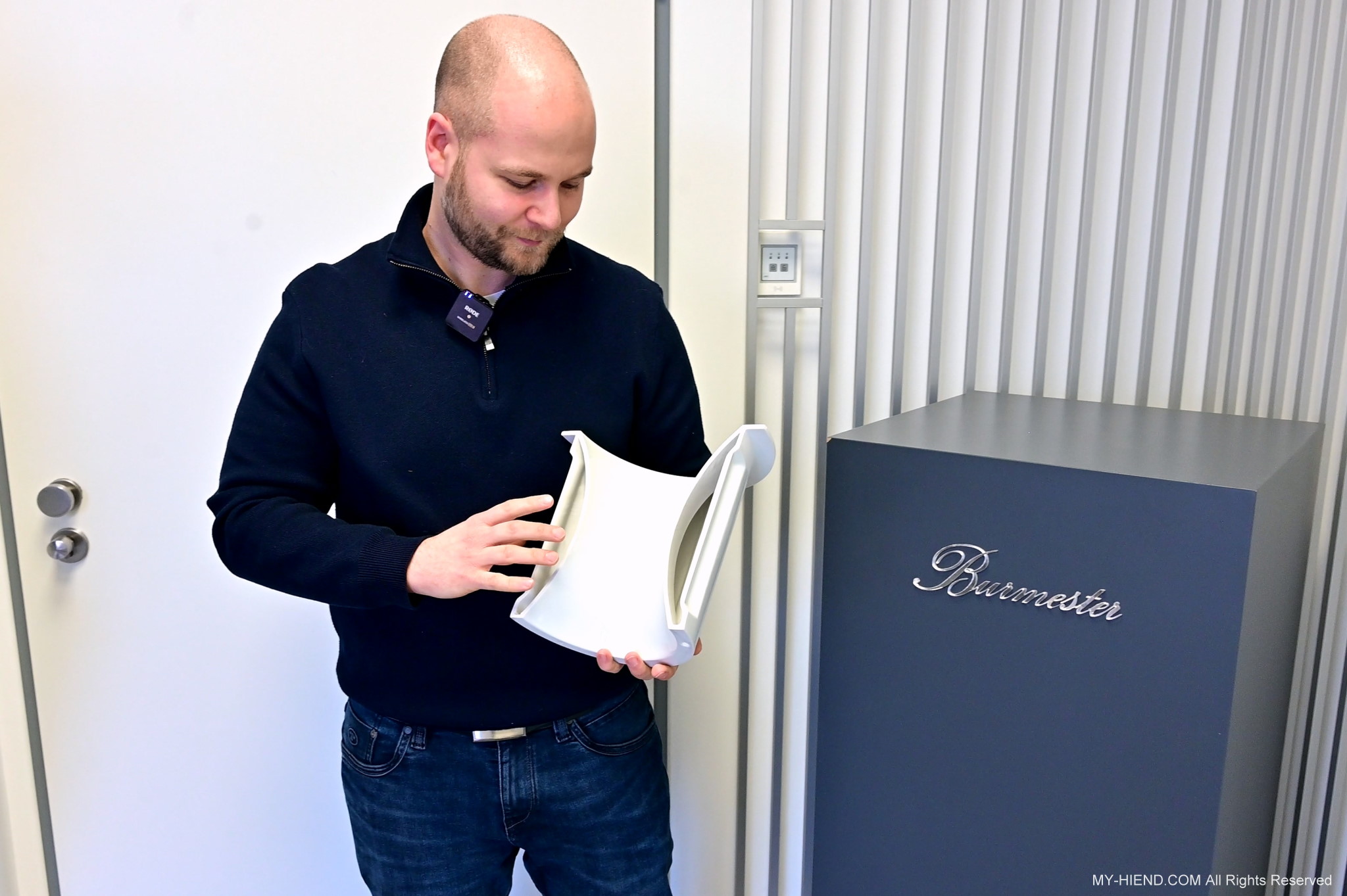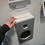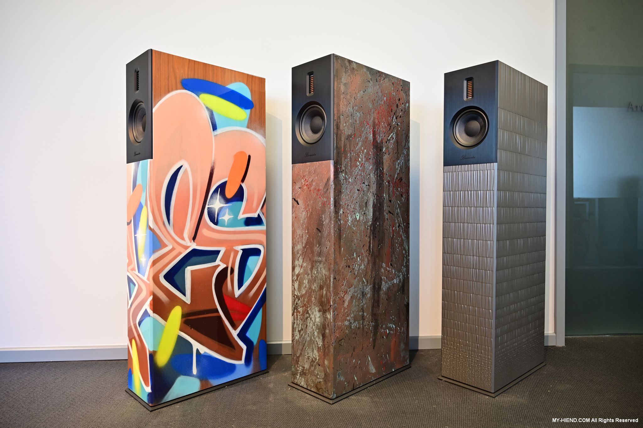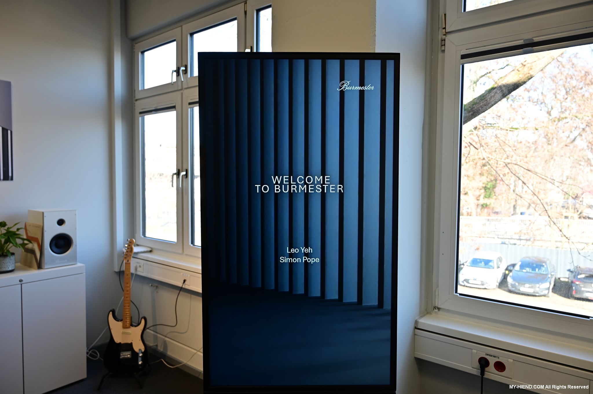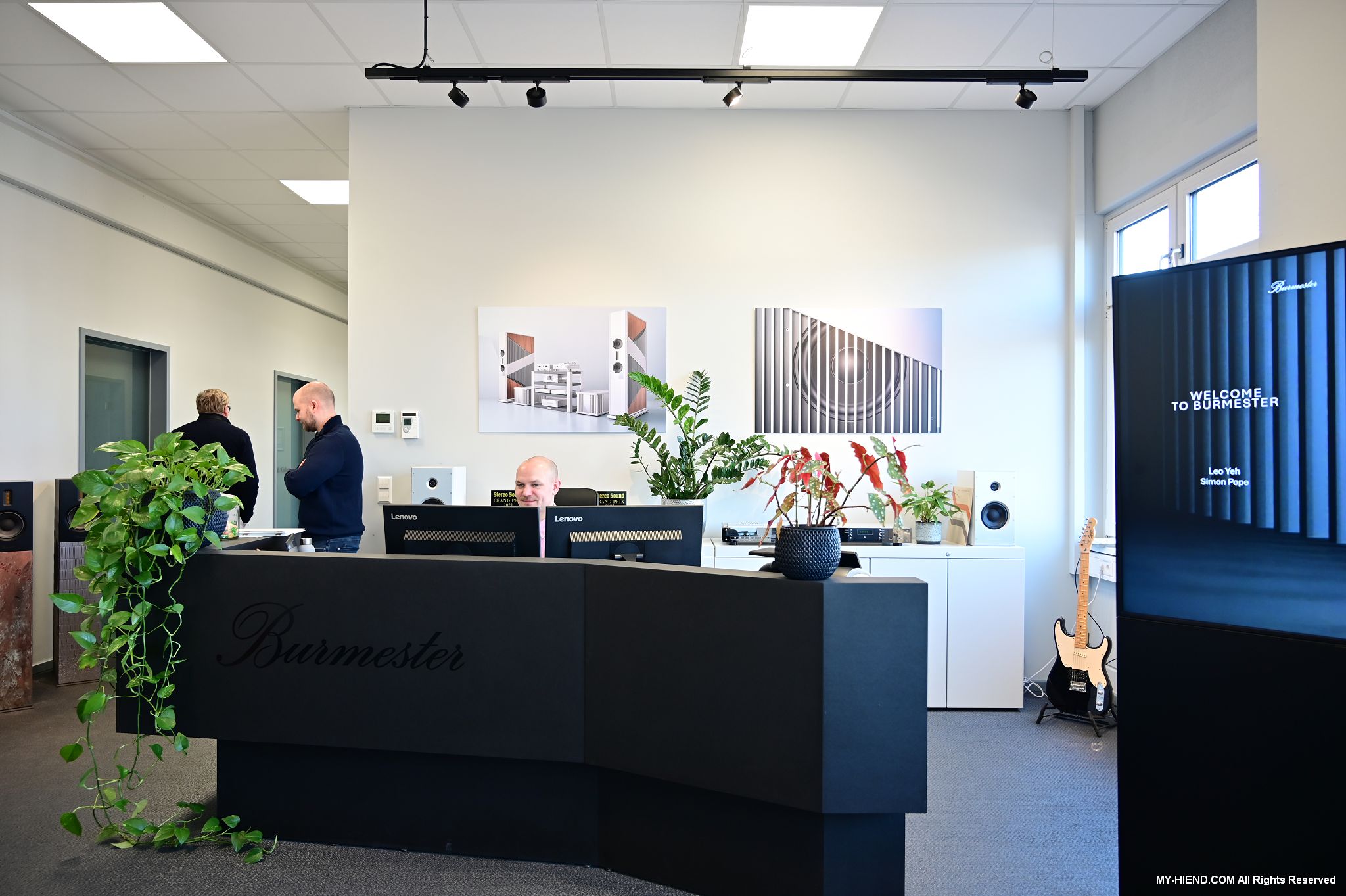 接著我們就前往Burmester新完工的總部,位置沒變,為在原地重新裝潢,Burmester總部離柏林市中心相當近,整棟建築共有兩層,總面積達3,400平方公尺 (1,028.5坪),一樓主要是工廠與音響室,二樓是辦公室,到訪時要進行登記並換參觀證,這裡有著很完善的管理,二樓辦公室入口接待處很貼心的在電子看板上顯示歡迎Simon跟我(Leo)到訪。總部負責導覽的是客服經理Phillipe Marseille先生。接待處展示了B38喇叭的各種外觀設計,有跟藝術家合作的,有不同材質的,不同表面處理方式的,各式客訂服務(Bespoke)是Burmester近來重要的發展主軸之一,可以滿足用家的各種對外觀的偏好需求。