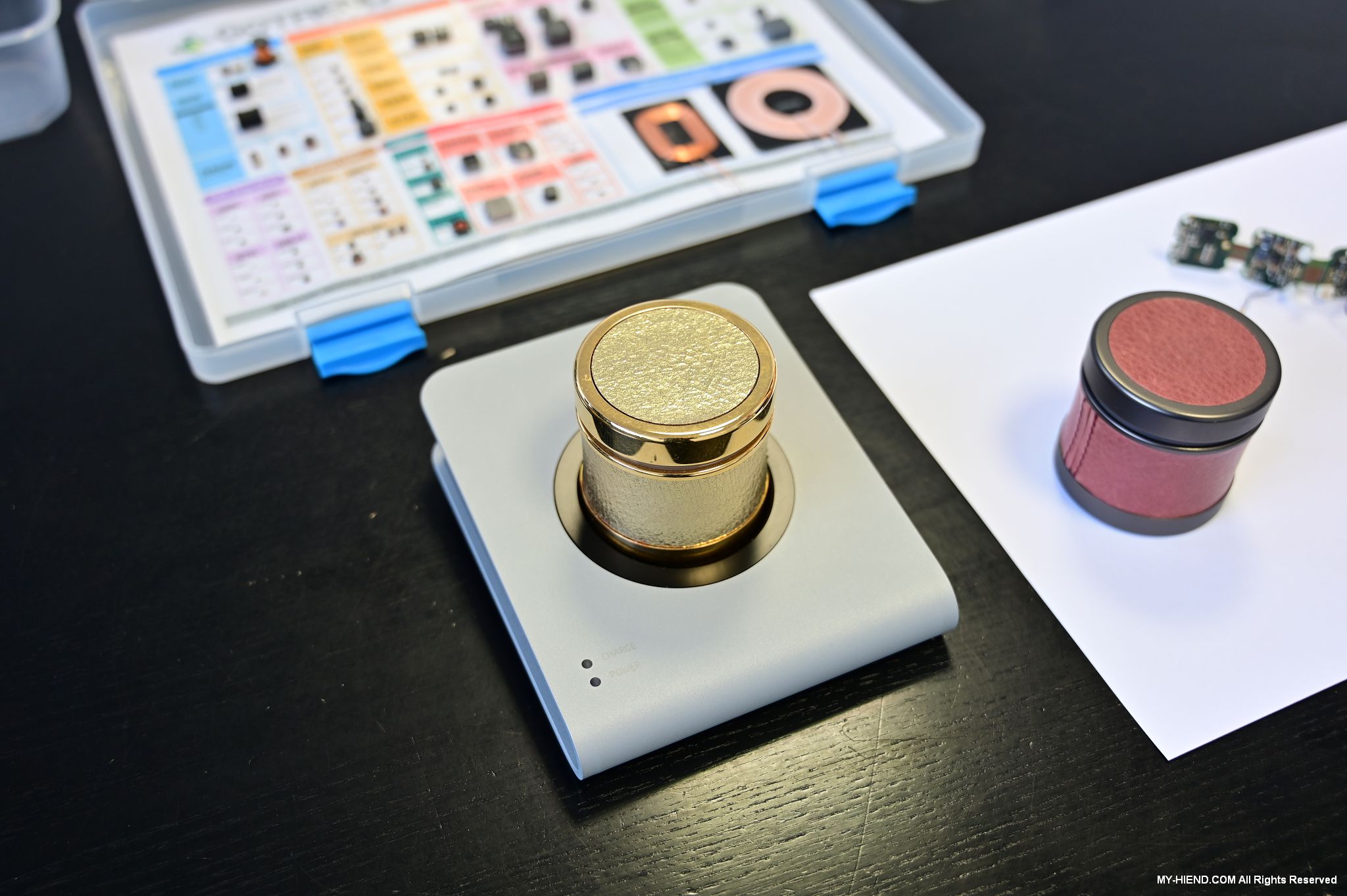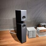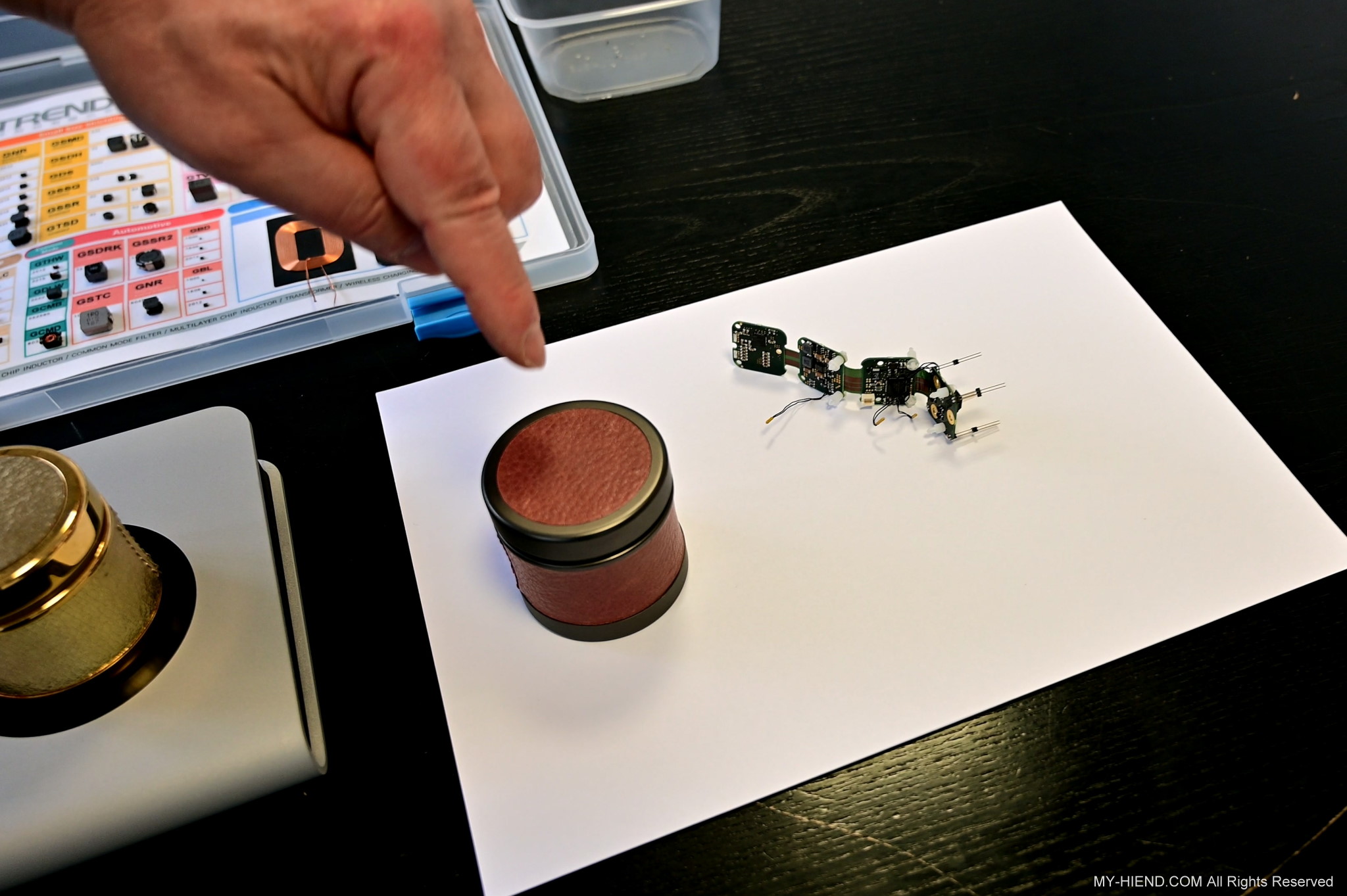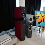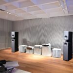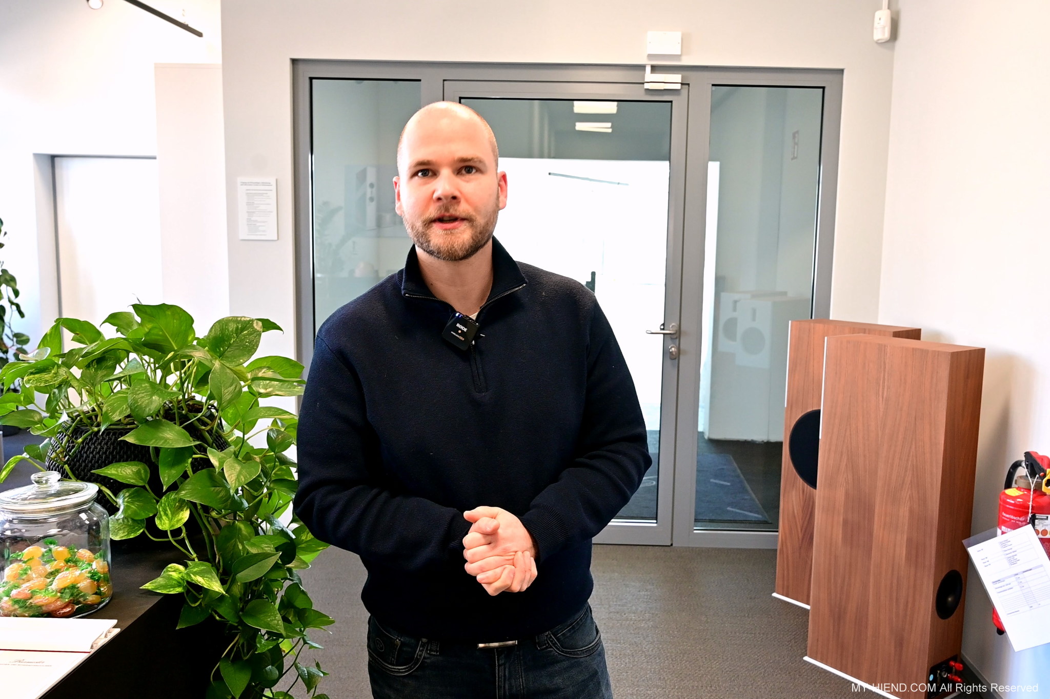 接著我們就前往Burmester新完工的總部,位置沒變,為在原地重新裝潢,Burmester總部離柏林市中心相當近,整棟建築共有兩層,總面積達3,400平方公尺 (1,028.5坪),一樓主要是工廠與音響室,二樓是辦公室,到訪時要進行登記並換參觀證,這裡有著很完善的管理,二樓辦公室入口接待處很貼心的在電子看板上顯示歡迎Simon跟我(Leo)到訪。總部負責導覽的是客服經理Phillipe Marseille先生。接待處展示了B38喇叭的各種外觀設計,有跟藝術家合作的,有不同材質的,不同表面處理方式的,各式客訂服務(Bespoke)是Burmester近來重要的發展主軸之一,可以滿足用家的各種對外觀的偏好需求。