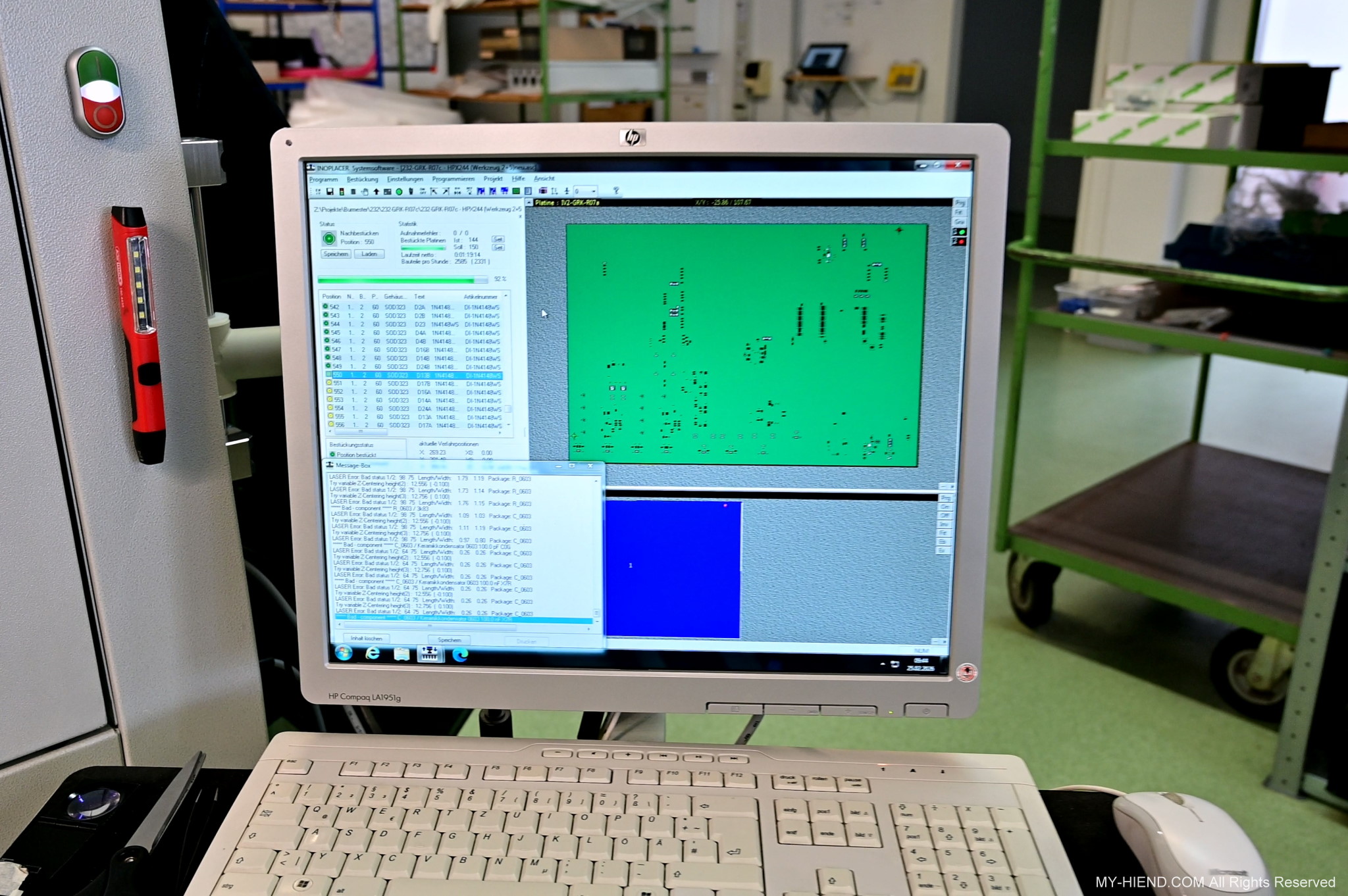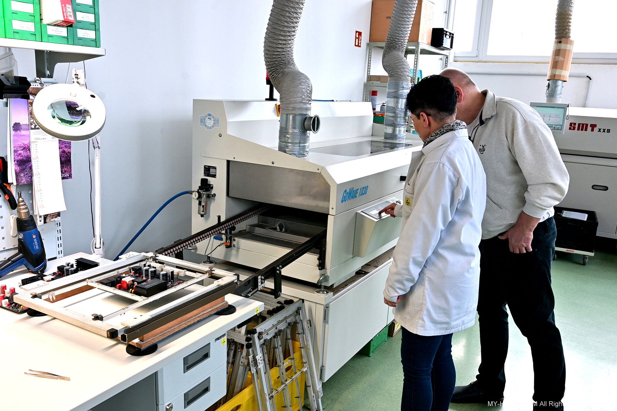 接著Winfried進入主題,電子線路的生產,在BLB裡,電子線路大約有60%的電子元件採用直插式封裝(THT, Through-Hole Technology),40%採用表面黏著技術(SMT, Surface Mount Technology)。SMT主要是將各式表面黏著元件(SMD, Surface Mount Device)精確地焊接於PCB板上,SMD元件通常非常非常小,需倚賴SMT專業的機器來施作,BLB這裡的設備最小可以處理到”0201 package”,也就是0.02″x0.01″的大小,肉眼看都有困難了,根本不可能以手工焊接,而且一塊線路板可能就有上百個SMD元件要安裝。