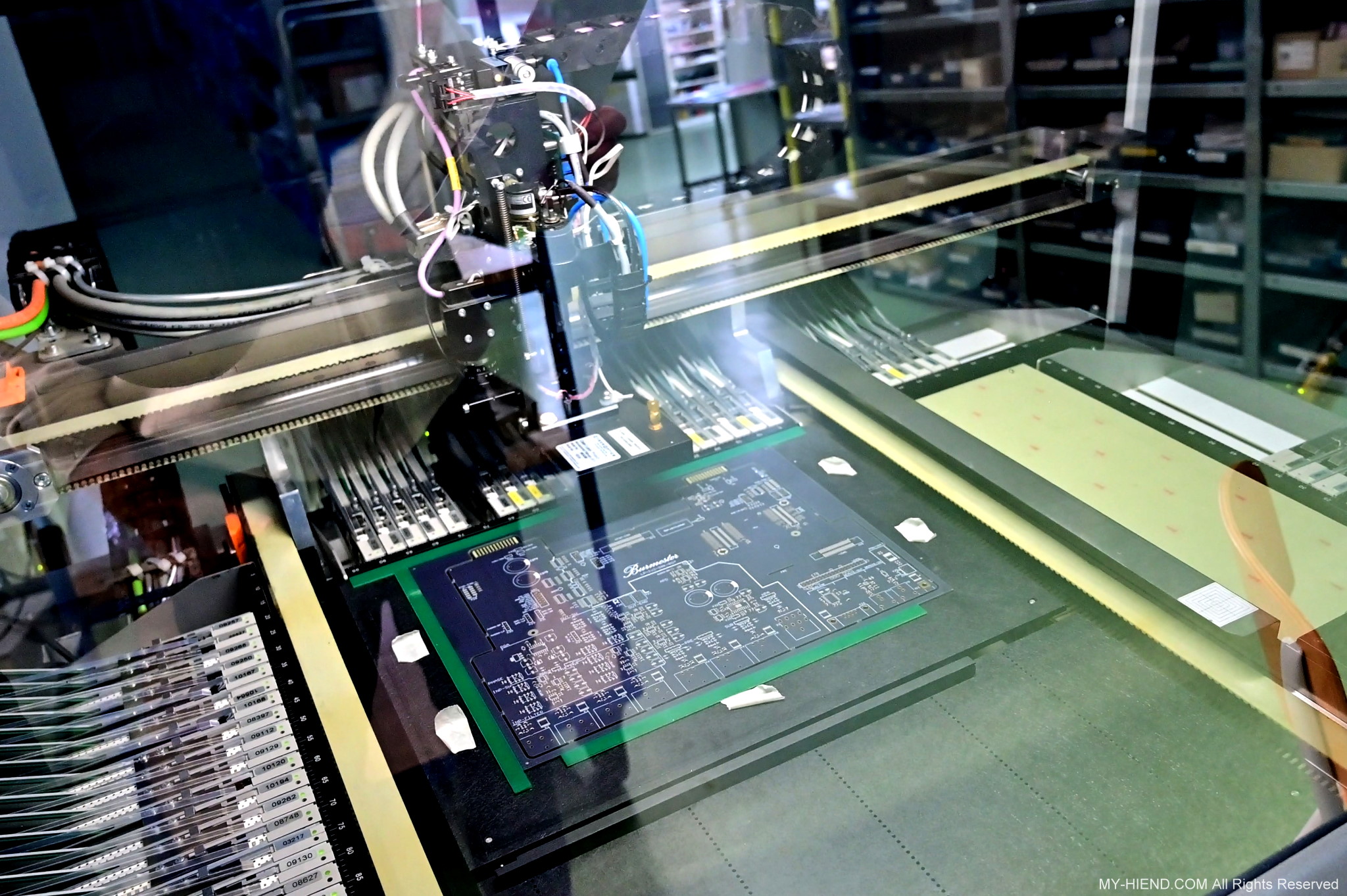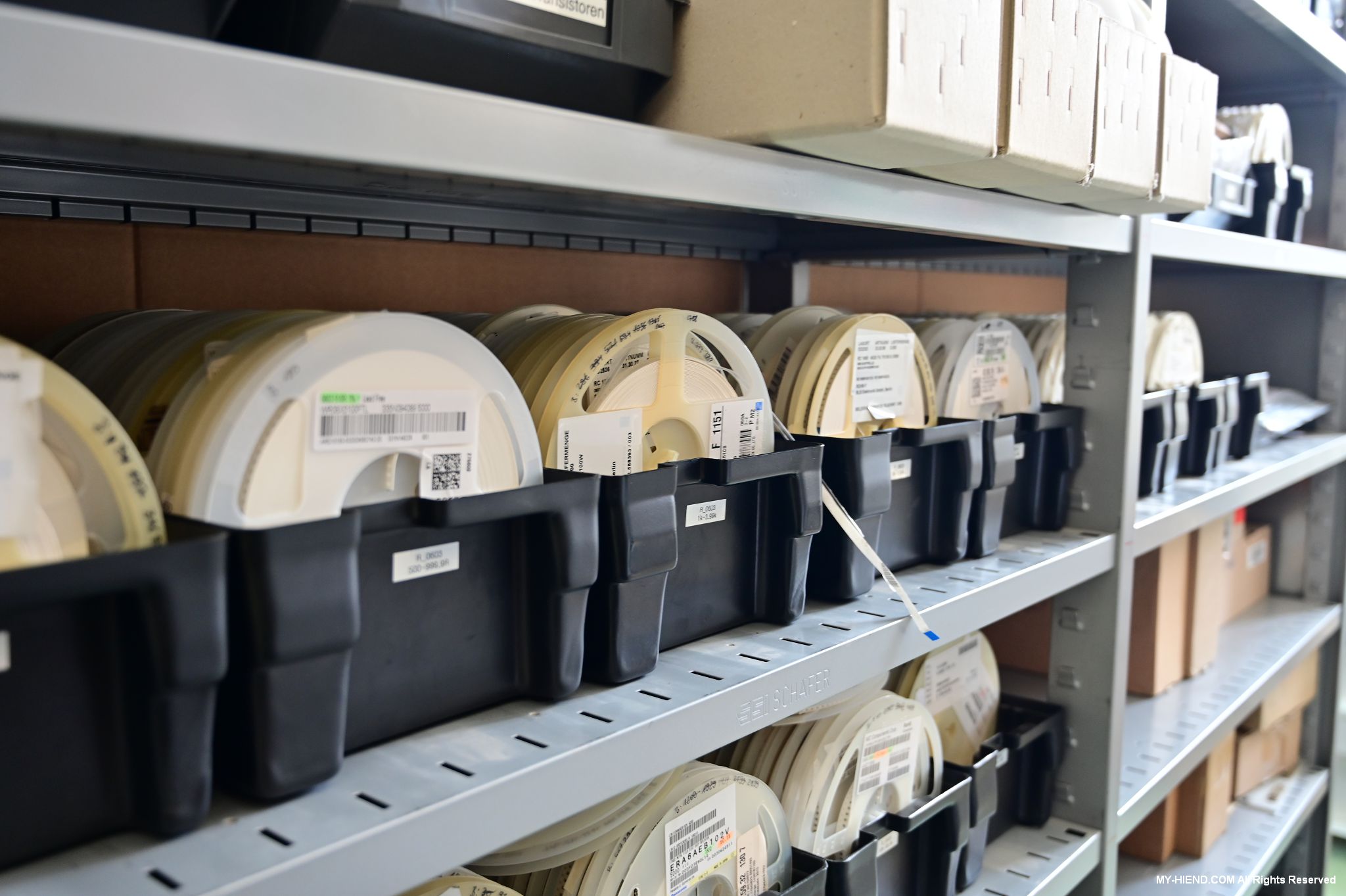 這裡架上一卷一卷的帶子,每一卷帶子上面就是各種SMD電子元件,透過SMT機器將其精準的安置在線路板上,有點像早期印表機的色帶,每次挑選所需的各式SMD電子元件,然後透過SMT機器將其精準的安裝在PCB版上