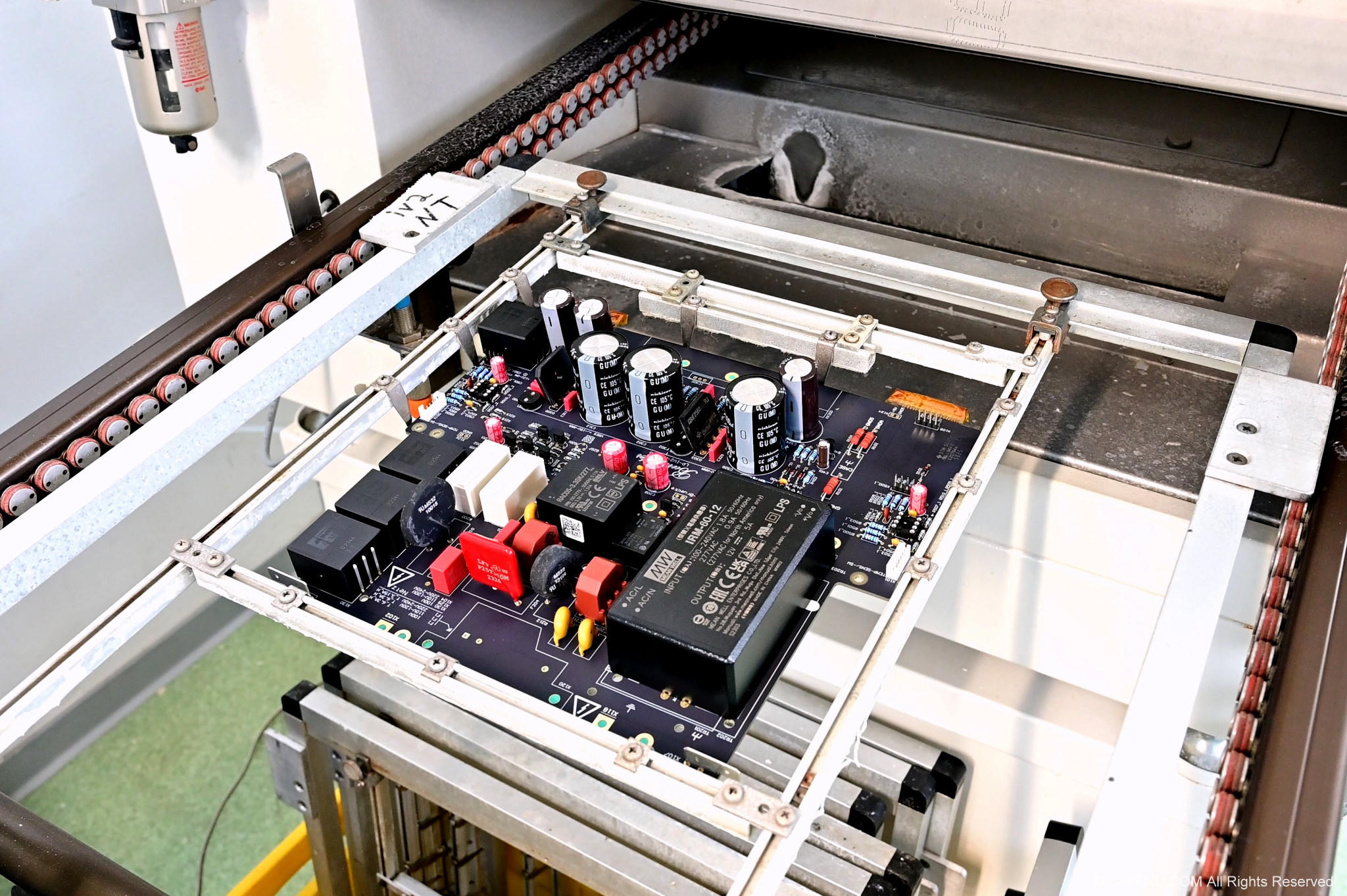 Reflow Soldering: 有點像烤箱一樣,透過達到焊點溫度後將SMD元件與PCB板緊密焊住,這裡也需先把線路板上沒有要上錫的地方用耐熱貼布保護起來