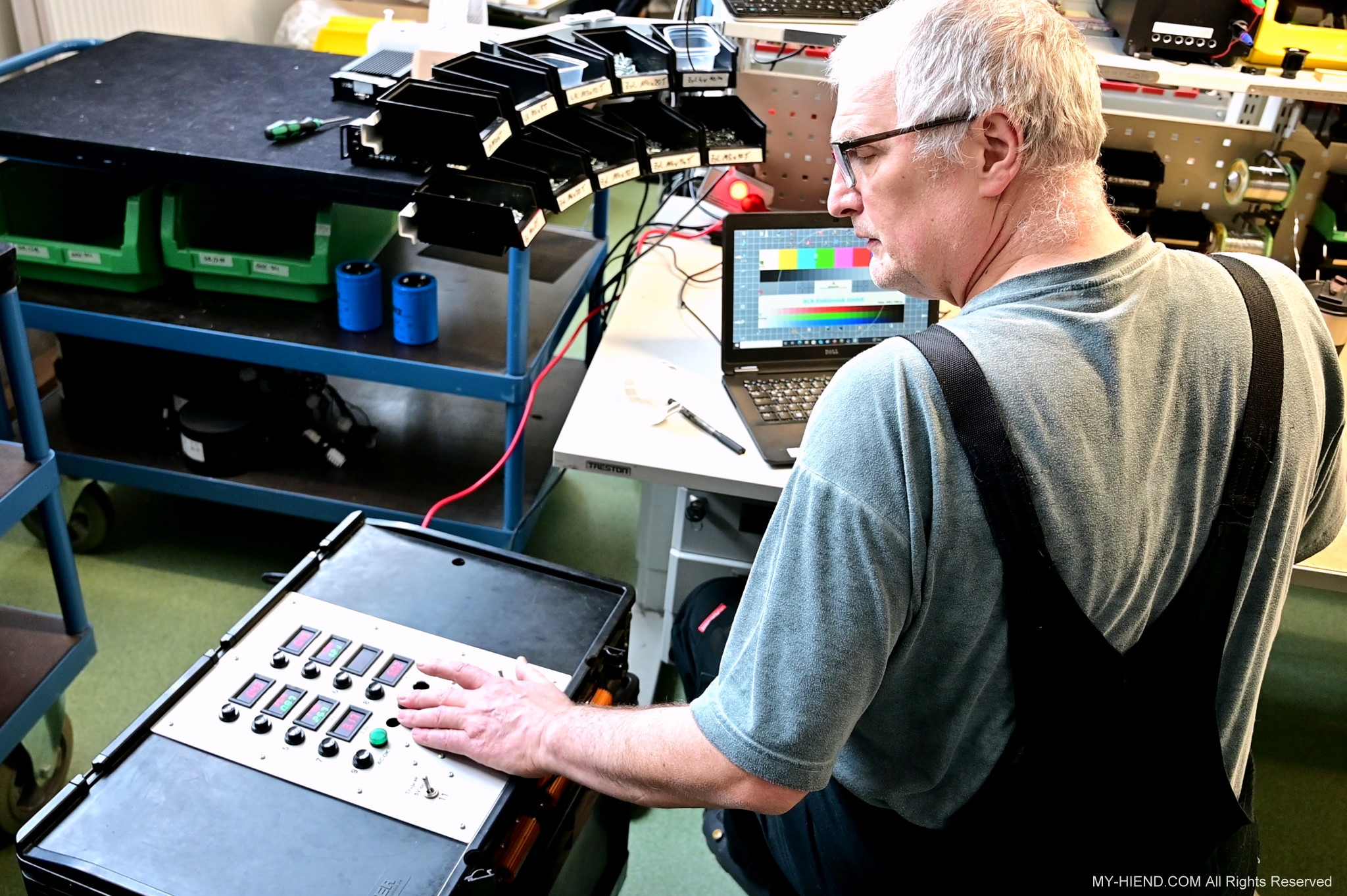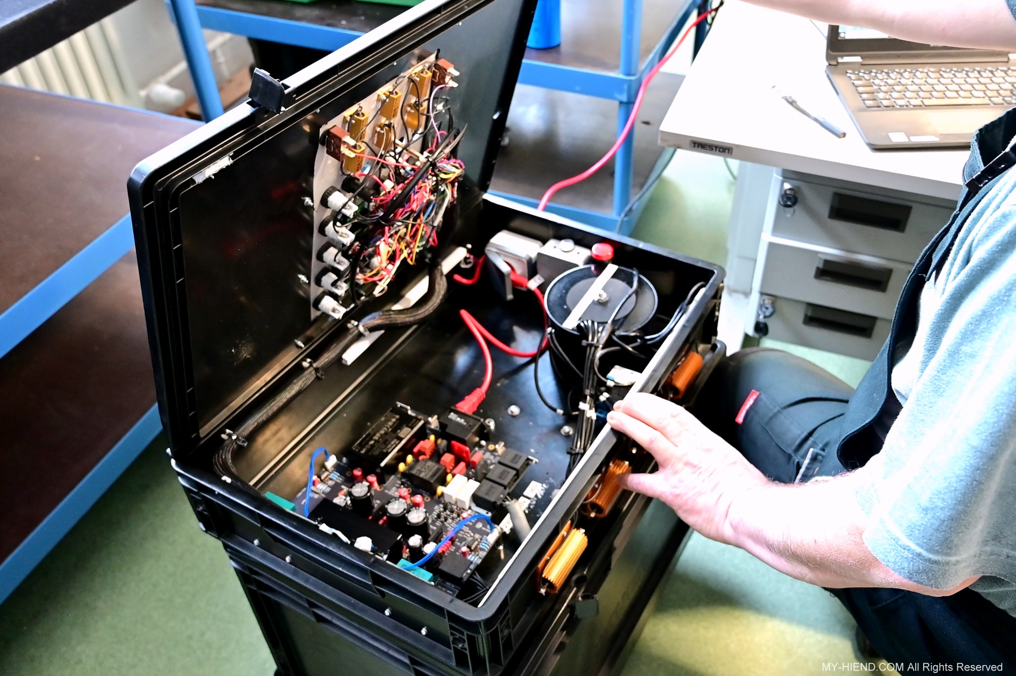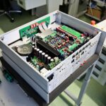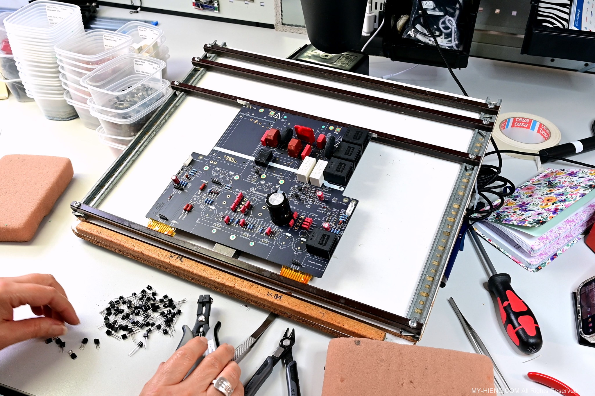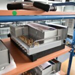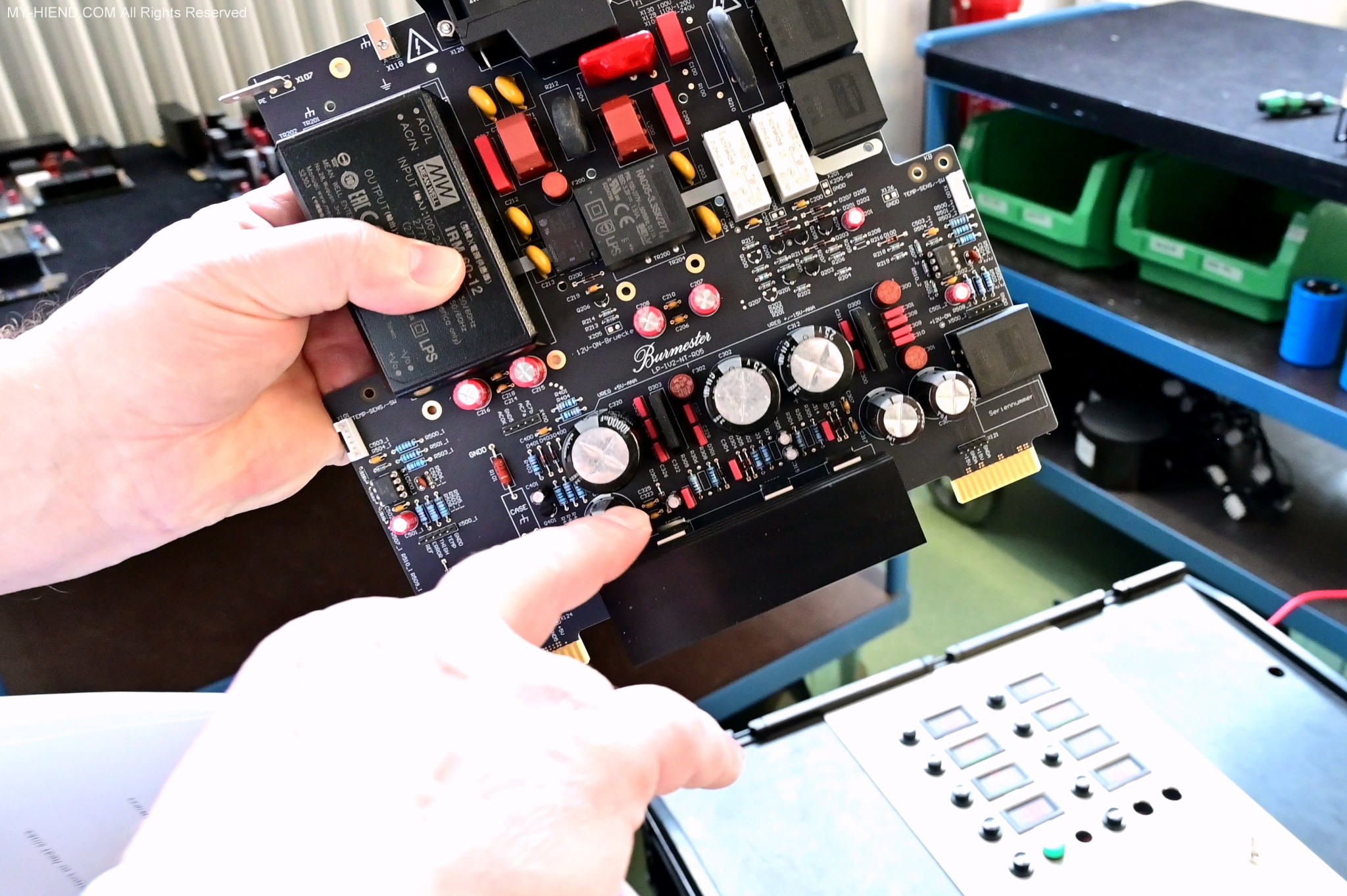 這區目前正全力生產Burmester 232綜擴,每一台232大約需要一整天的時間組裝,組裝好後就會進行測量,共有300個檢測項目都需通過,然後接著放到架上進行熟化約100個小時與壓力測試(Stress Test),都通過後就會進行實際聆聽,最後就是清潔跟 包裝出貨了。