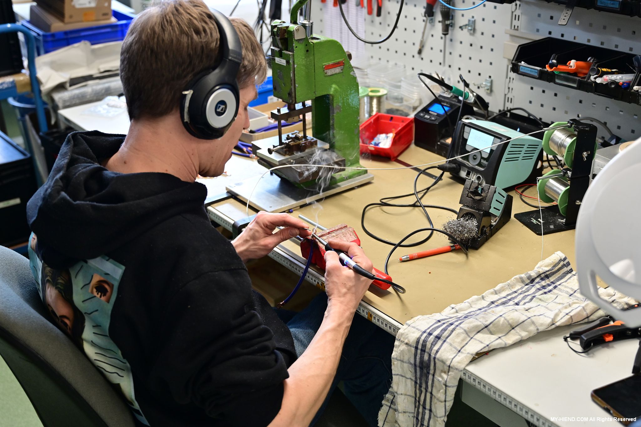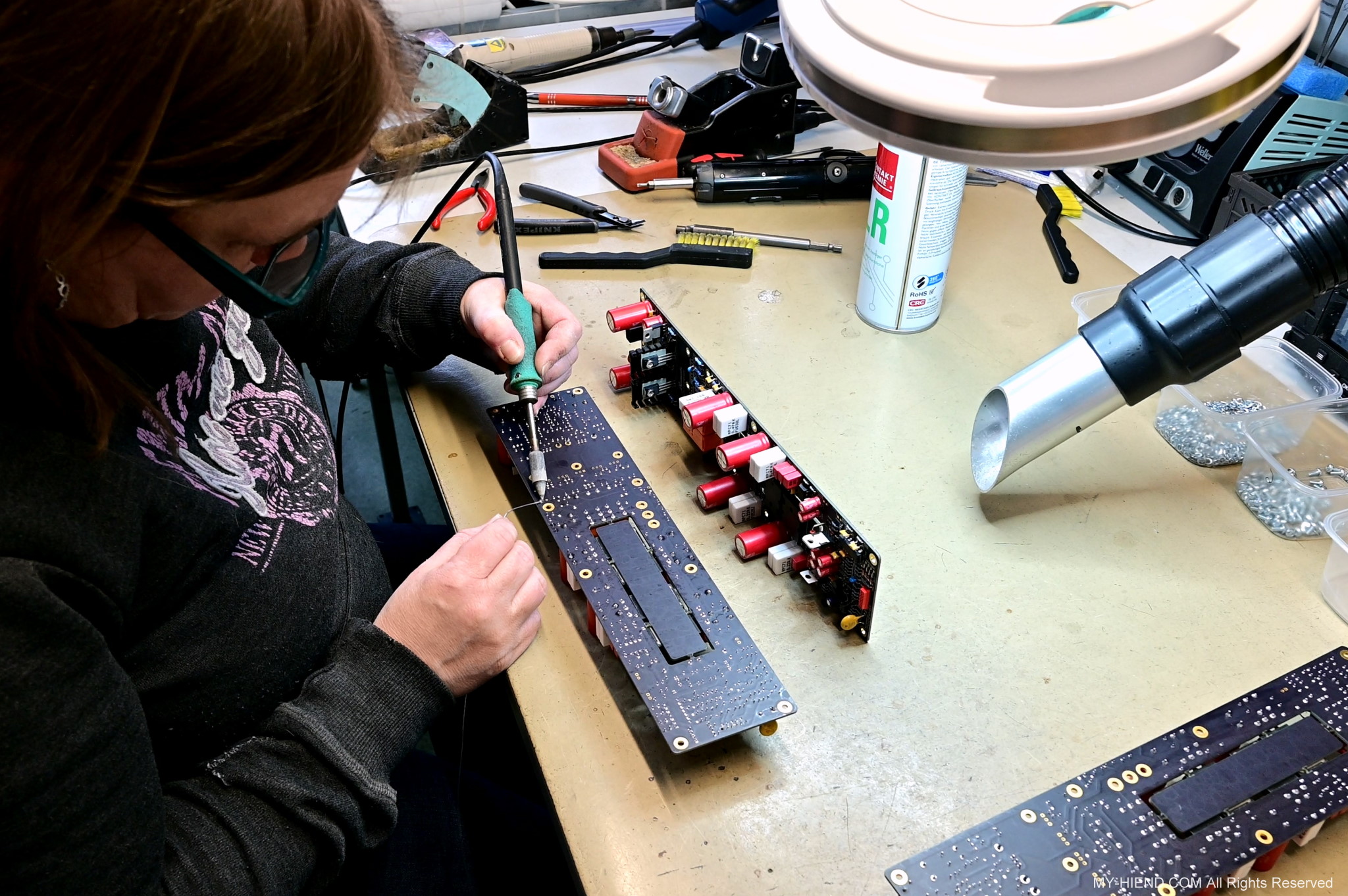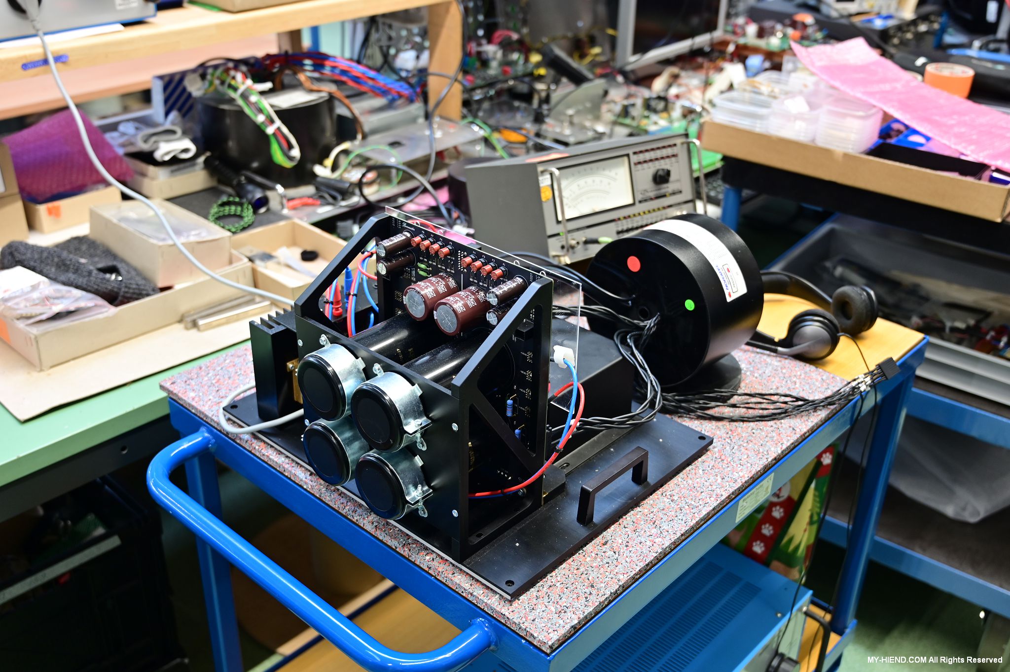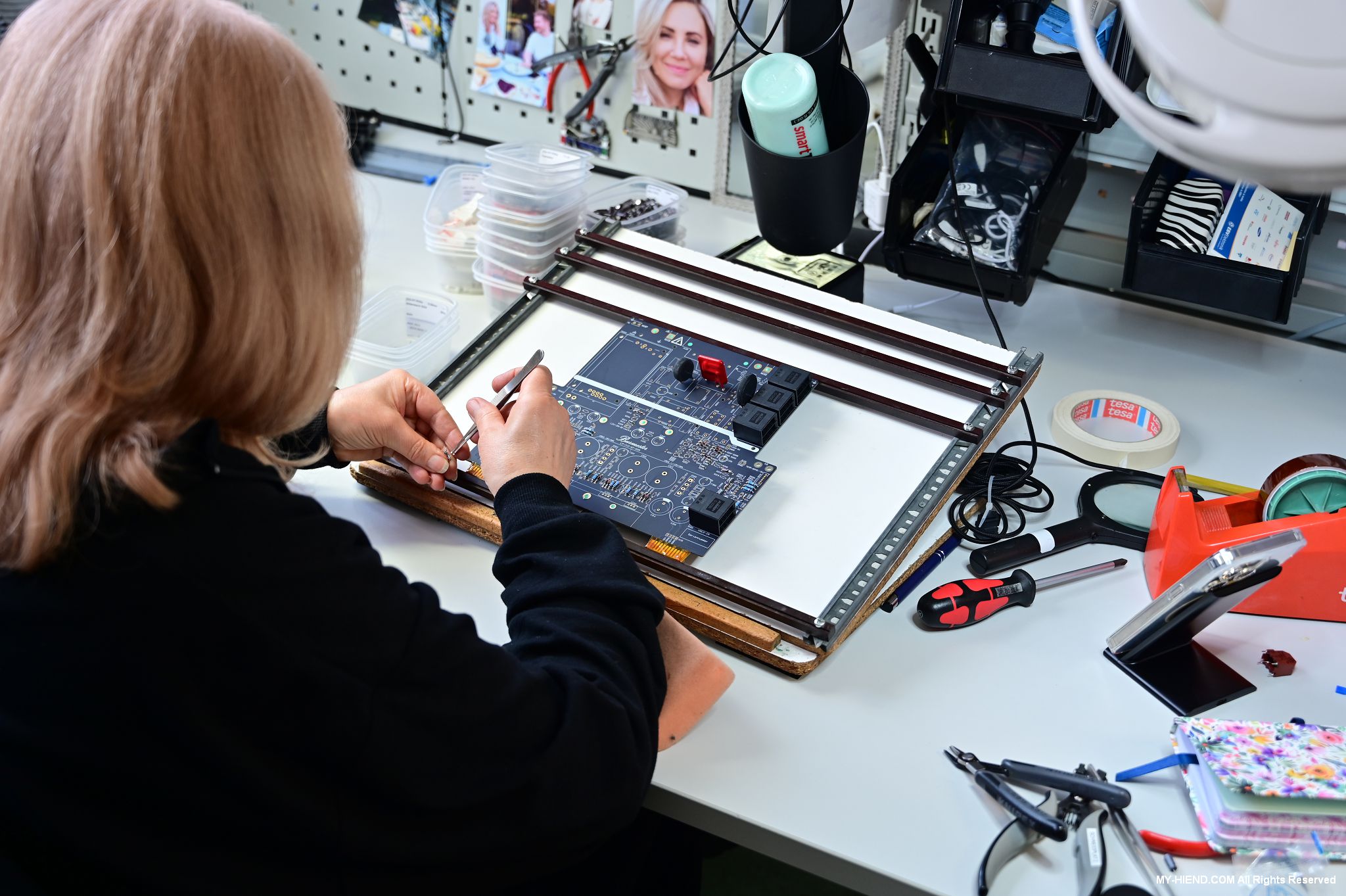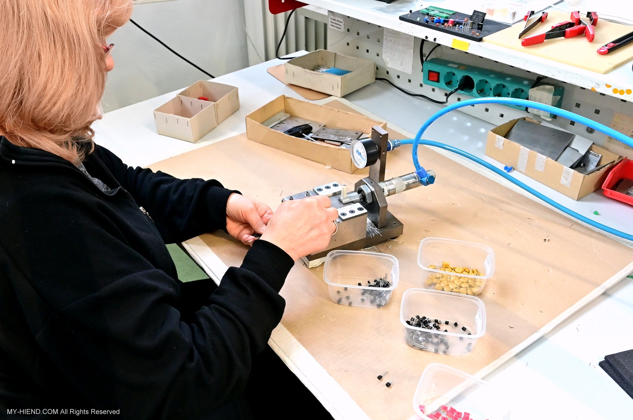 這區目前正全力生產Burmester 232綜擴,每一台232大約需要一整天的時間組裝,組裝好後就會進行測量,共有300個檢測項目都需通過,然後接著放到架上進行熟化約100個小時與壓力測試(Stress Test),都通過後就會進行實際聆聽,最後就是清潔跟 包裝出貨了。