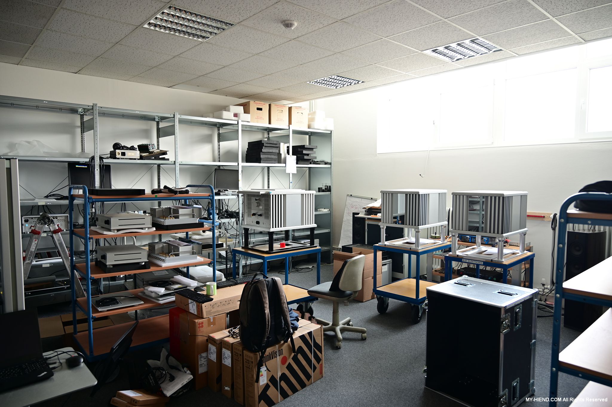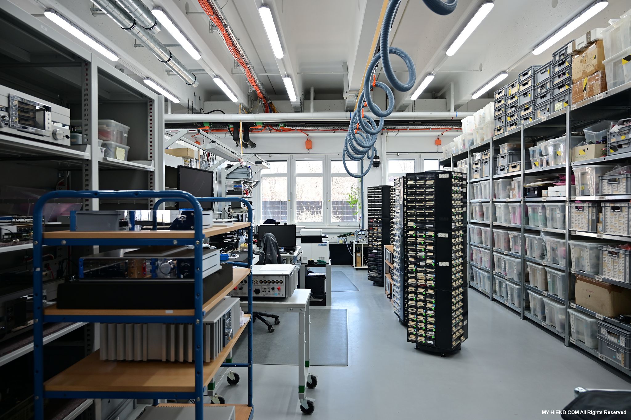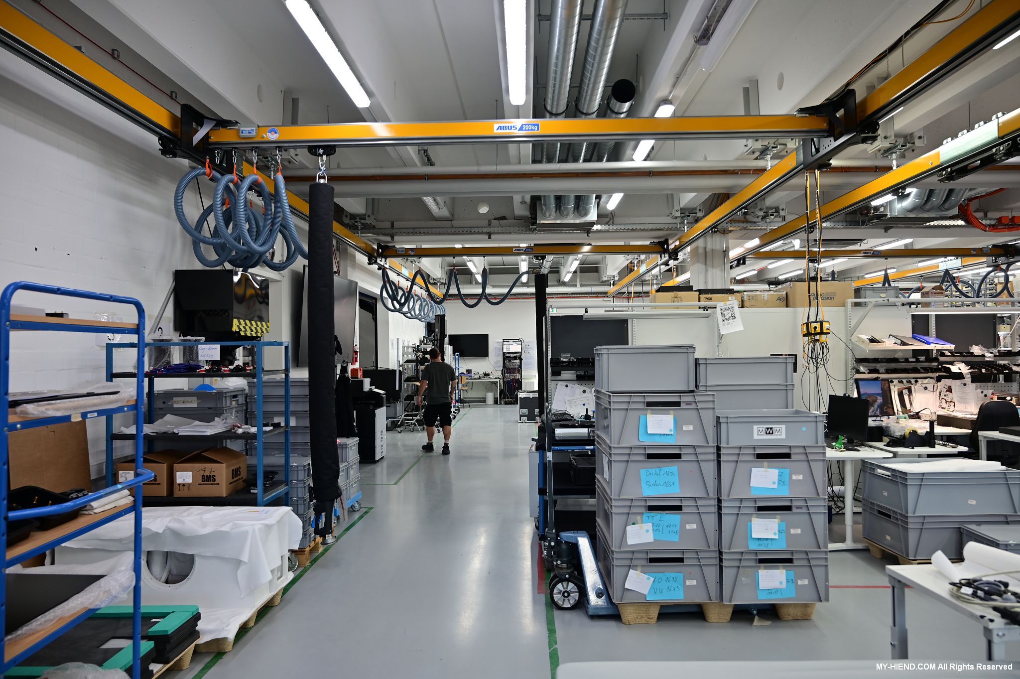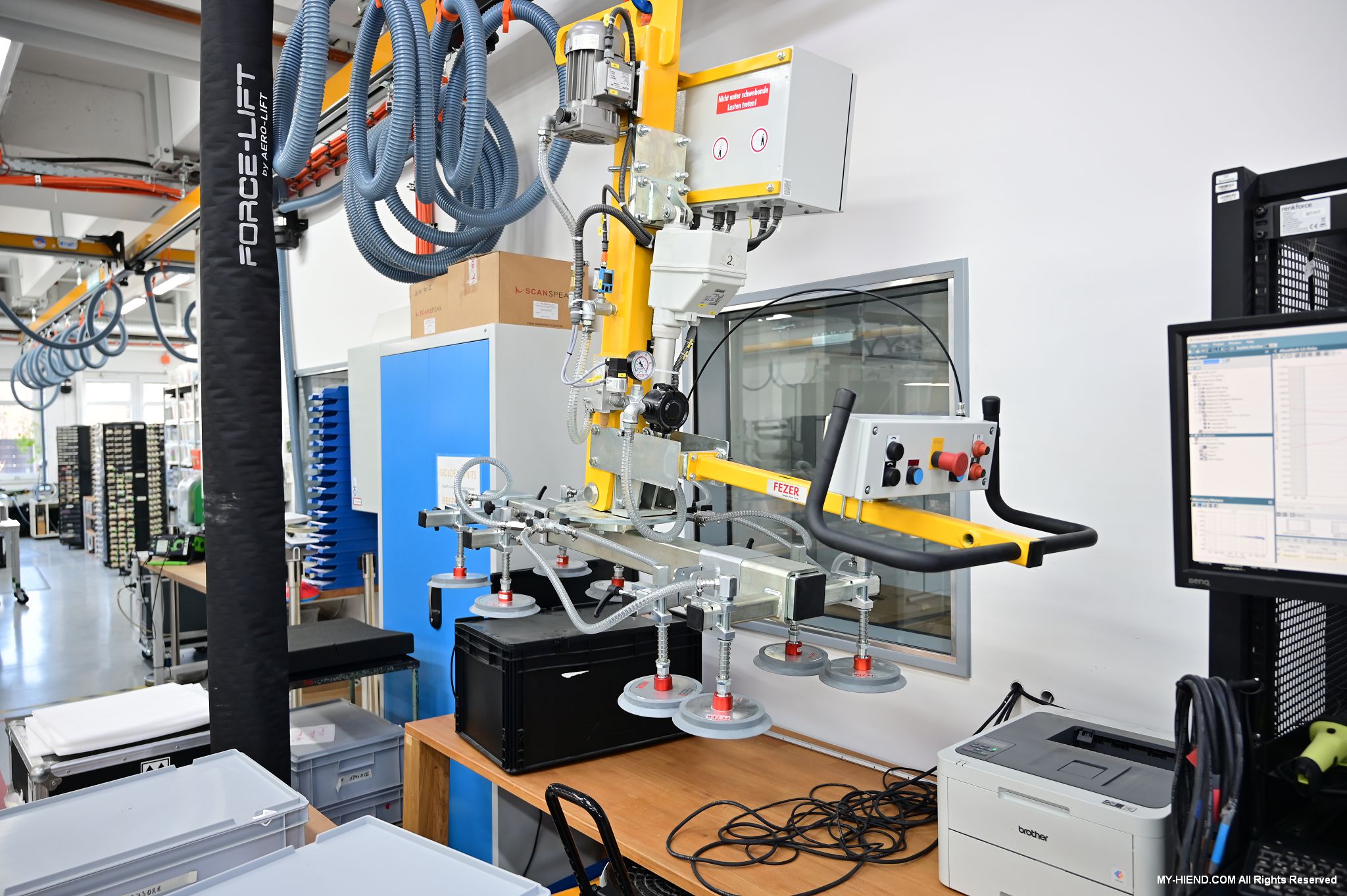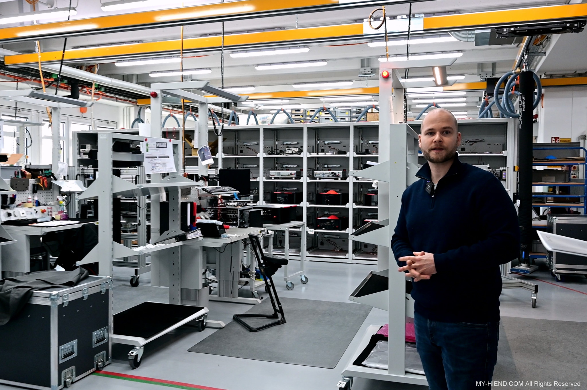 辦公區域接著我們進入總部一樓的生產區域,專門打造的音響室也在這裡。在這裡主要從事組裝生產、品管測試、產品熟化、試聽、包裝與出貨等部份,另外還有維修部門。重新整新後動線更為流暢,環境乾淨明亮,並增添了許多輔助的現代化機器設備來搬運或是組裝器材,畢竟Burmester的器材都具有一定的重量。這台由德國FEZER (Albert Fezer Maschinenfabrik GmbH)公司製造的真空搬運機 (Vacuum Lifter),這些真空搬運機並與預先安裝好在天花板的軌道結合,如此一來器材就可以在工廠內輕鬆的移動。