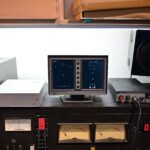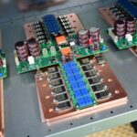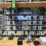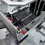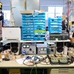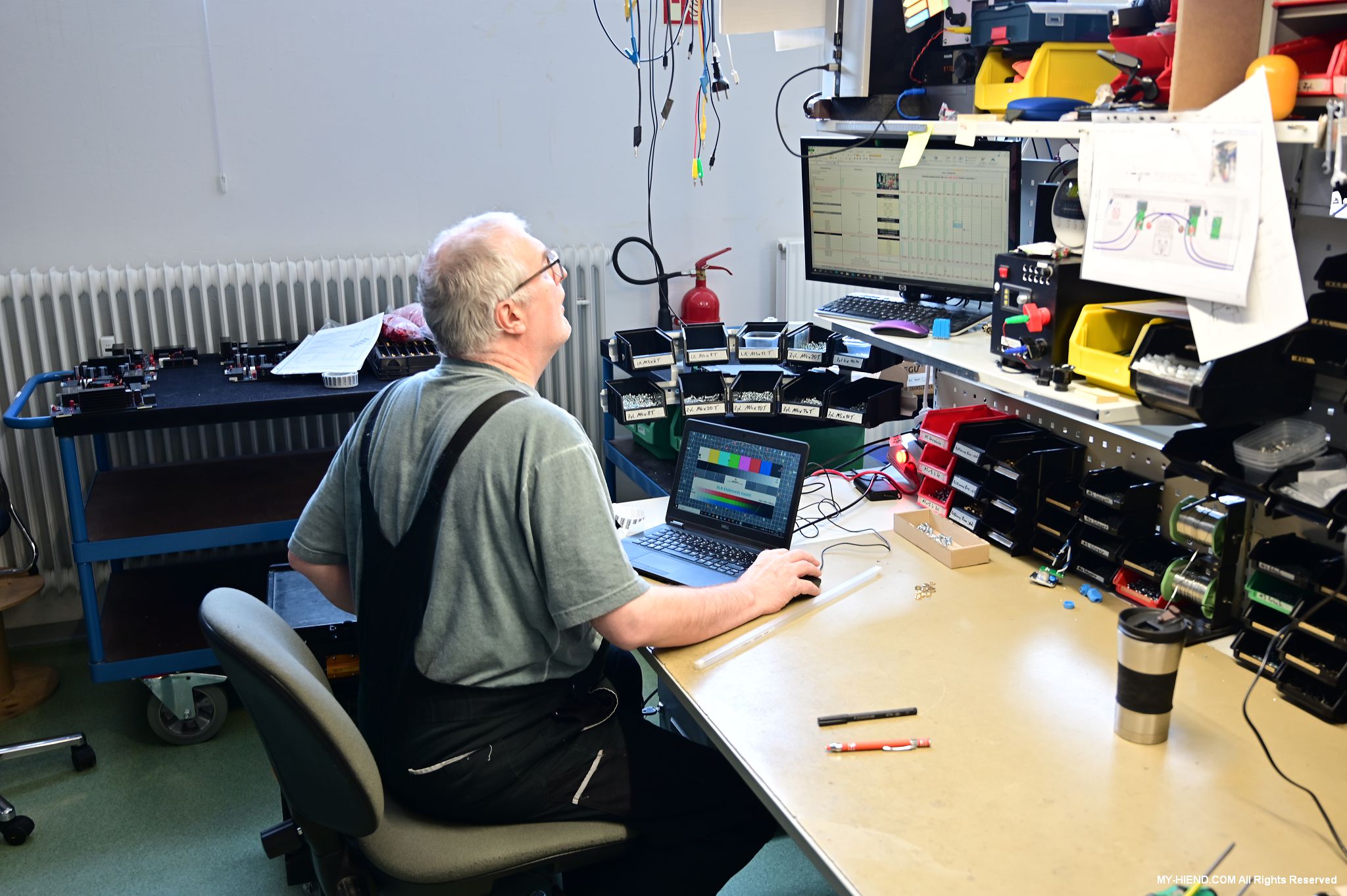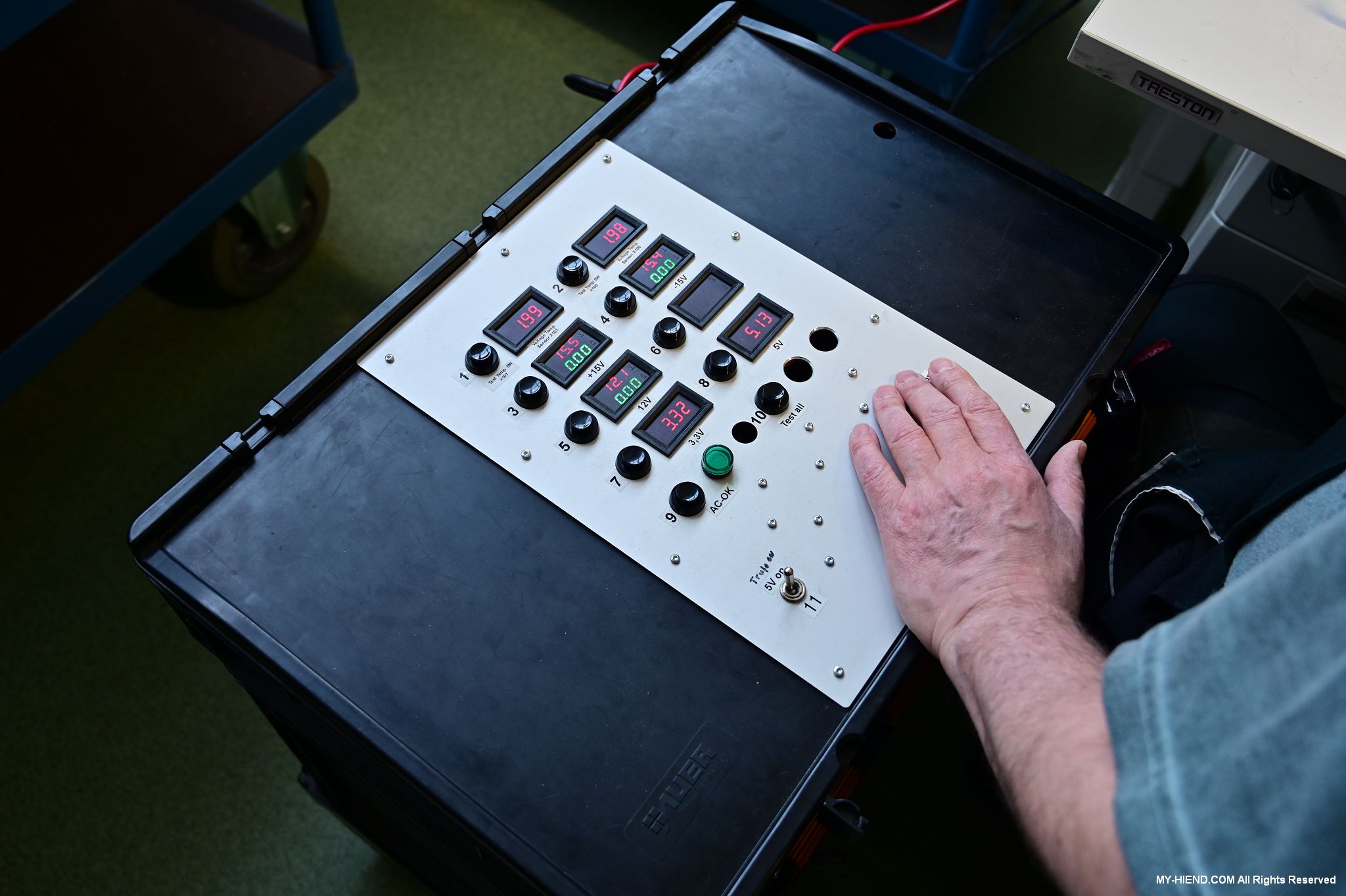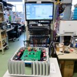 電子線路板組裝完成後,就要進行測試了,例如這個是在測試後級的模組,會有一個硬體的測試環境,例如供應電源,訊號之輸入與輸出,然後連接到測試儀器與電腦,必需完成該模組的各項測試數據要求