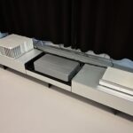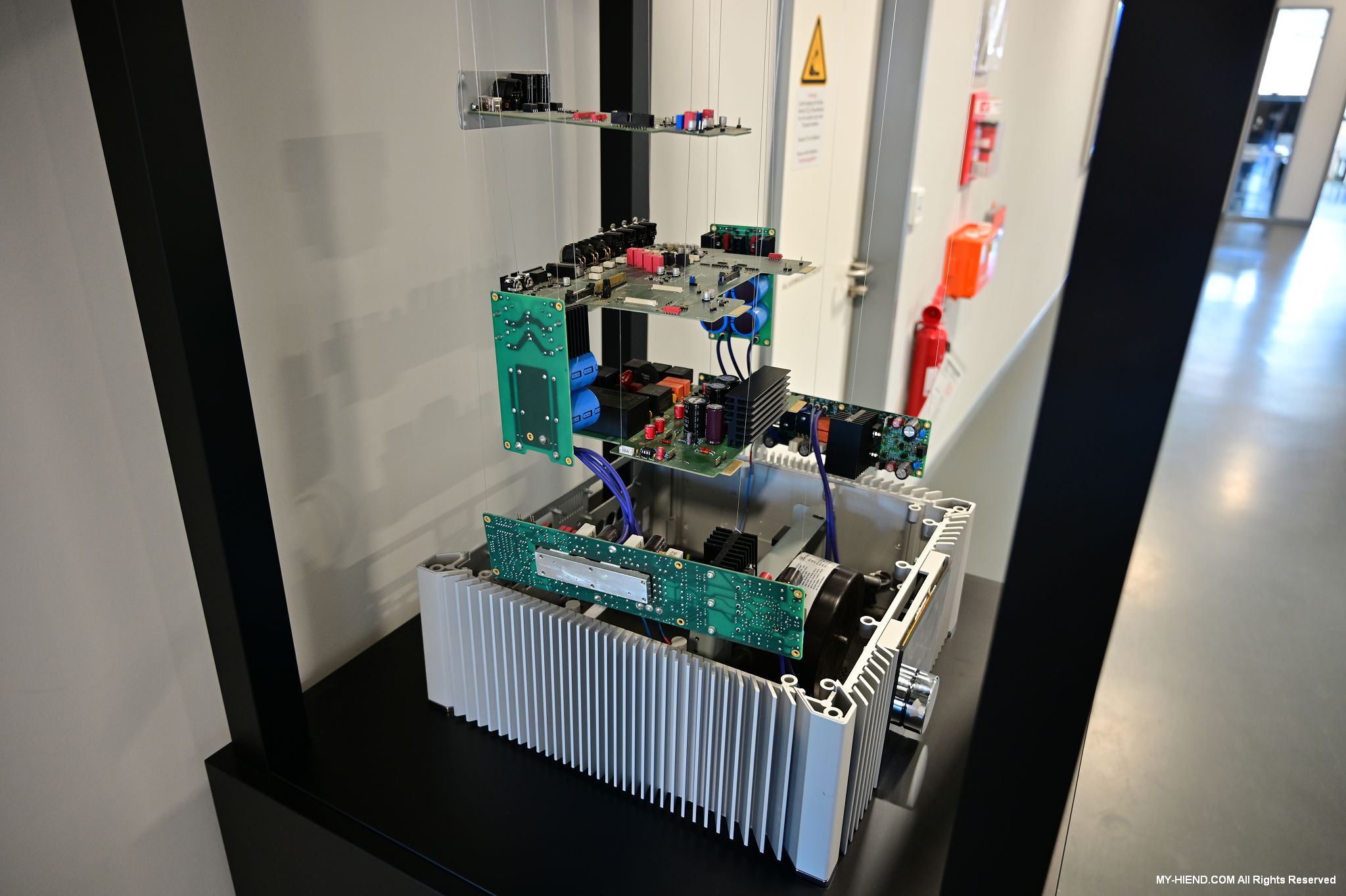 二樓畫分了許多間辦公室與會議室、還有非常漂亮開放式的員工餐廳,走道或是每一間辦公室裡、甚至員工餐廳都可見Burmester的產品在其中,也有一些非Burmester但具有特別意義的東西,如創辦人Dieter Burmester先生擁有的Fender吉他與Orange擴大機,Burmester最新串流綜擴232的實體爆炸模型也非常有意思,其他還有經典的808前級、909後級、911後級,順便一提,Burmester的產品都以數字命名,其中一個命名邏輯為代表該產品研發的時間,例如909就是1990年9月研發出來的,之後新一代的就加上MK1、MK2….,可見得Burmester對其每一樣產品都非常有信心,也是另一個永續概念的呈現。