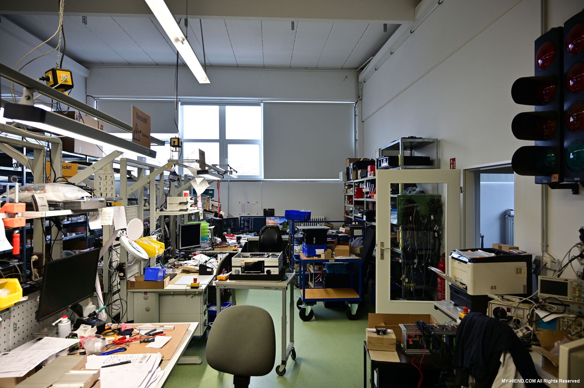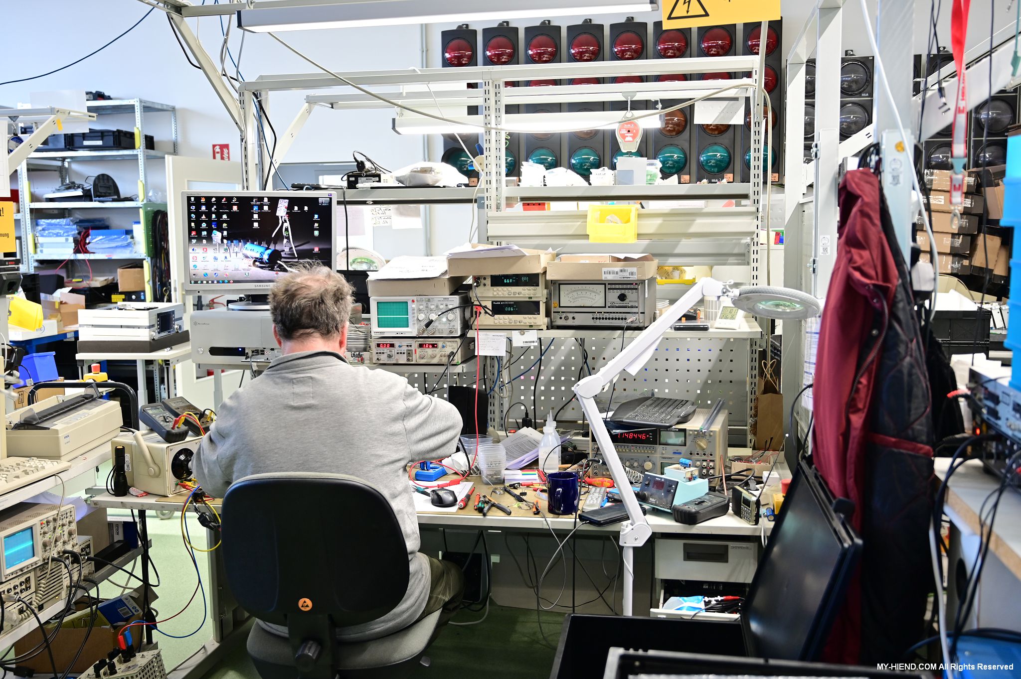 在BLB裡,看到許多供應給Burmester線路等相關組件自然是意料中事,目測現場大約佔了95%以上,那其他5%是甚麼? 其實BLB也幫其他公司研發與生產以充份利用工廠的產能,其中包括遊艇音響(Yacht Audio),交通號誌管理系統(Traffic Light Management System)、銀行或企業的出入管制系統(Access Control System)…等等,這面牆上就裝滿了交通號誌以進行研發與測試之用。