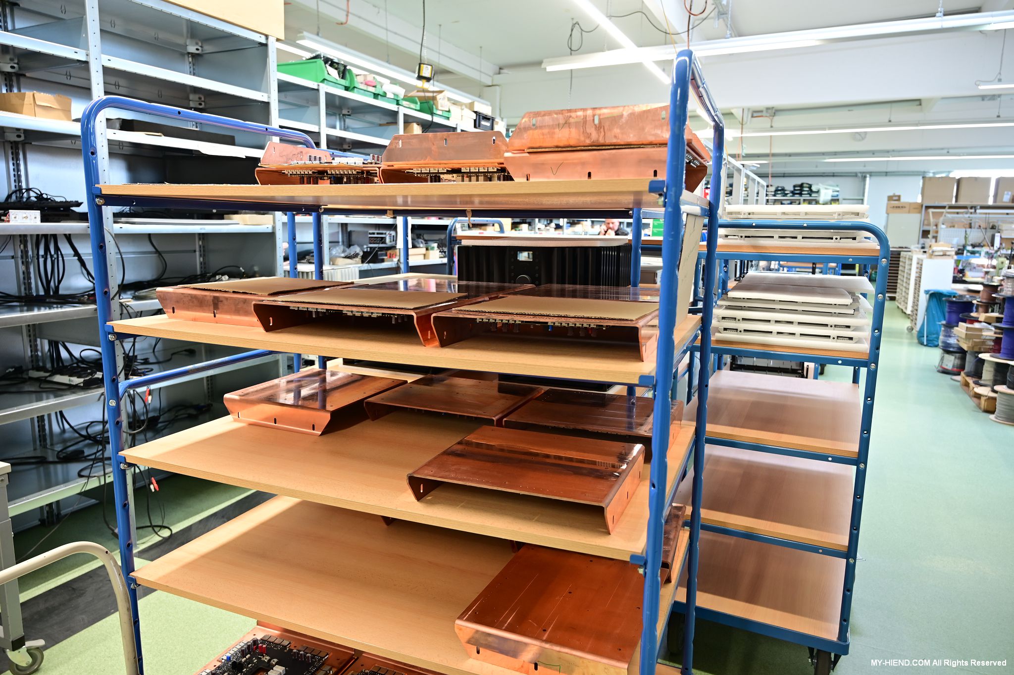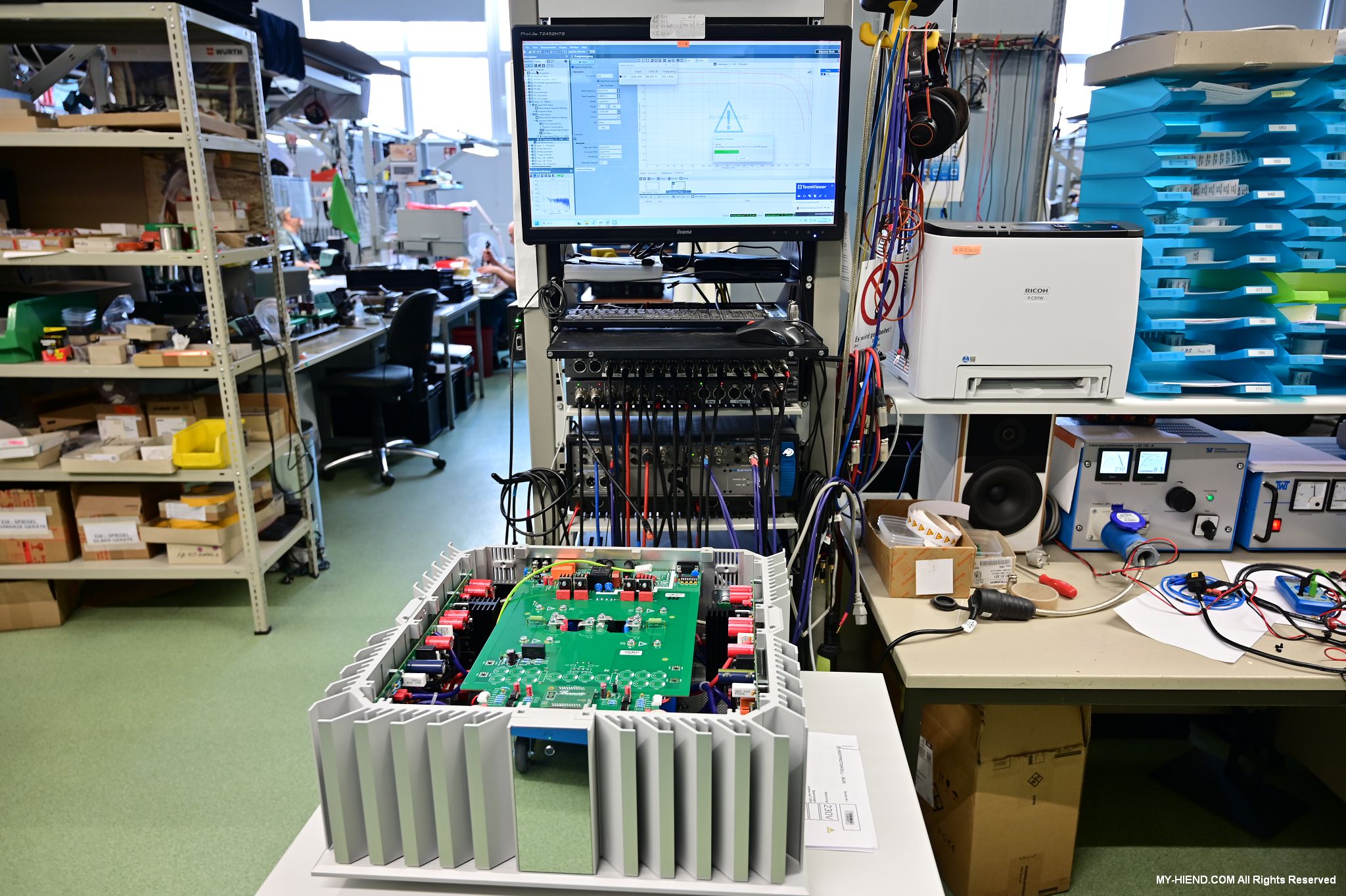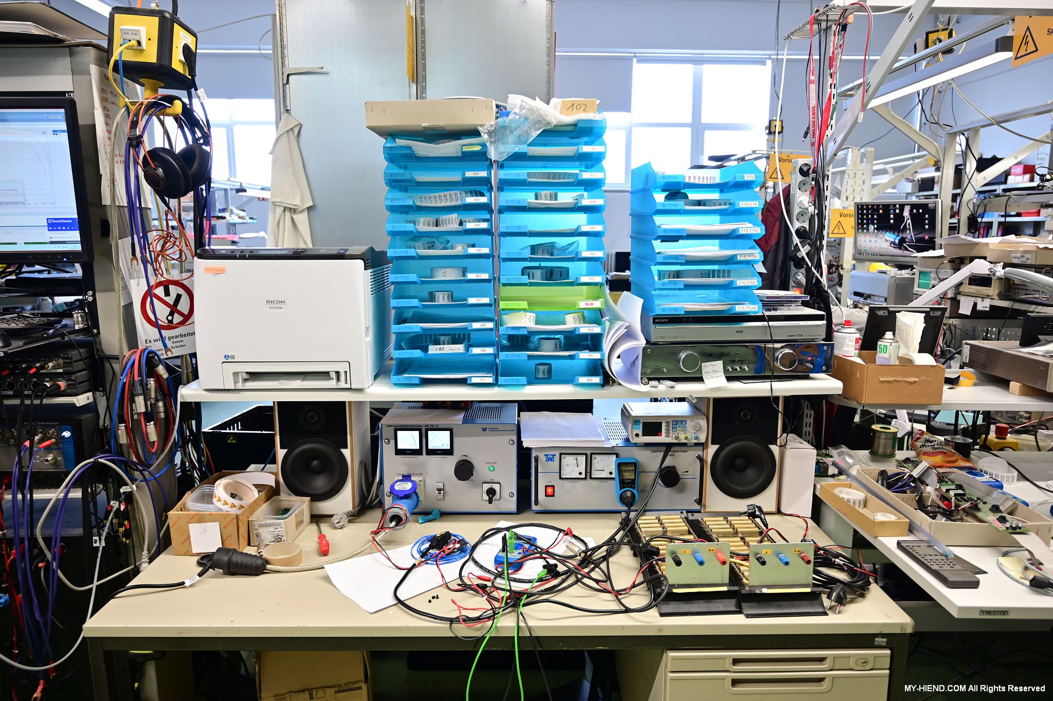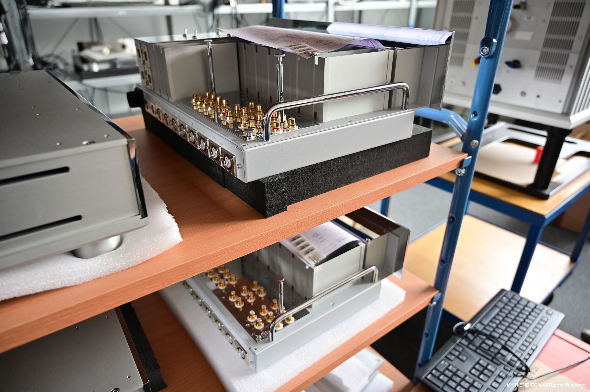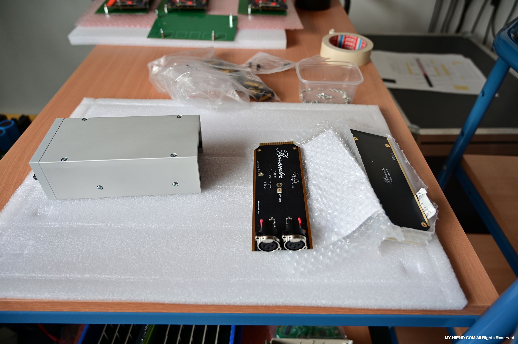 這區目前正全力生產Burmester 232綜擴,每一台232大約需要一整天的時間組裝,組裝好後就會進行測量,共有300個檢測項目都需通過,然後接著放到架上進行熟化約100個小時與壓力測試(Stress Test),都通過後就會進行實際聆聽,最後就是清潔跟 包裝出貨了。