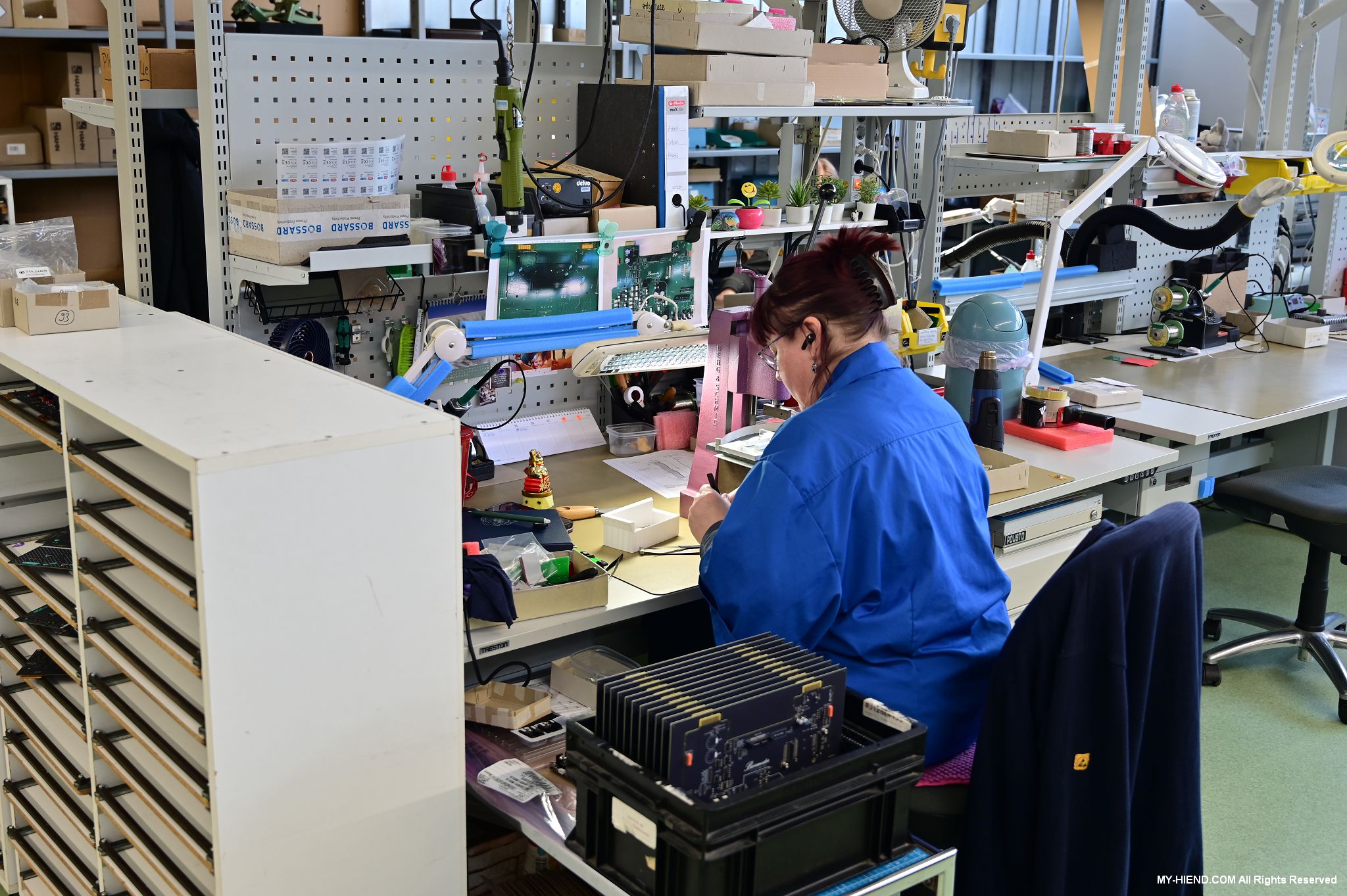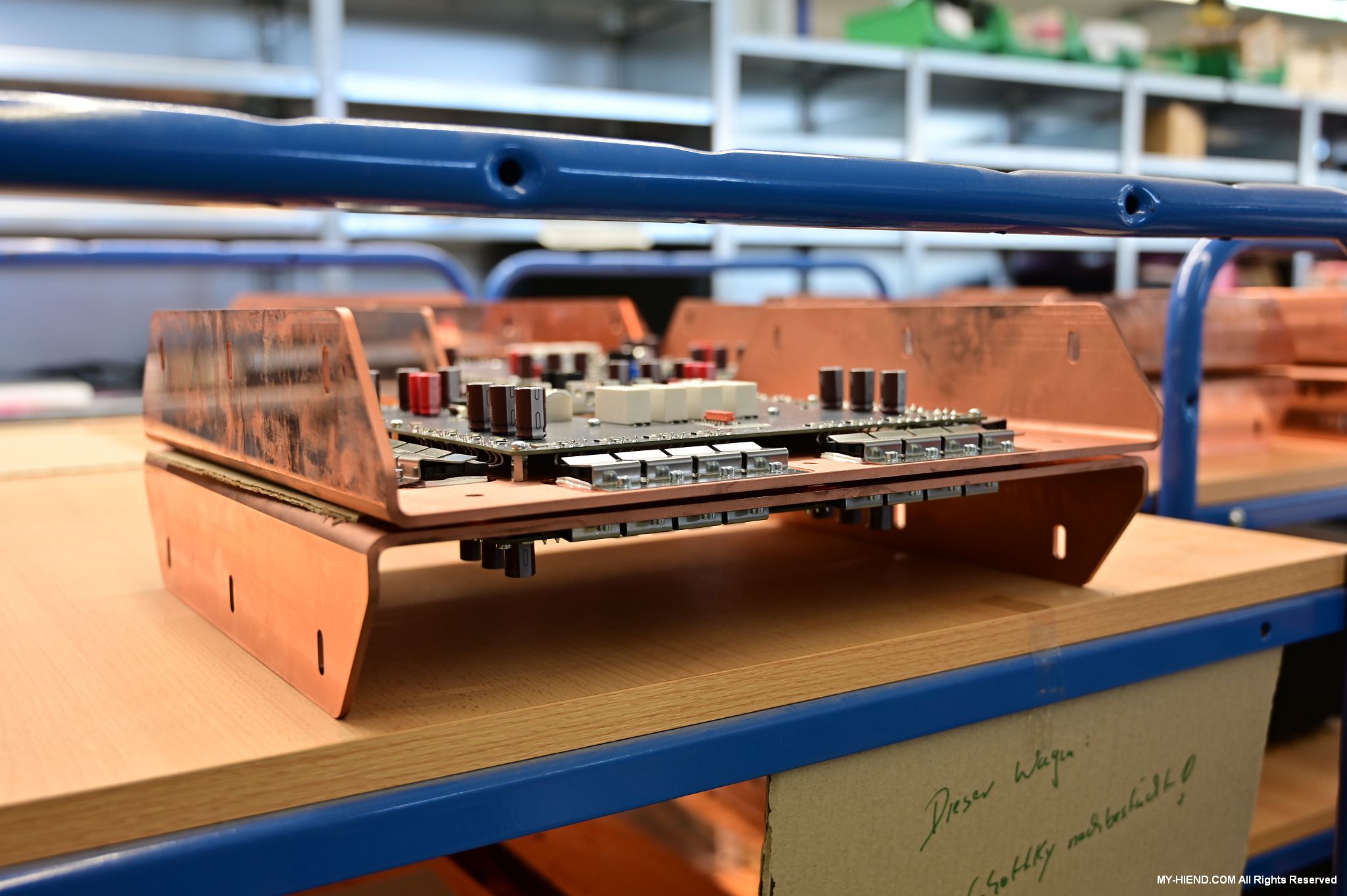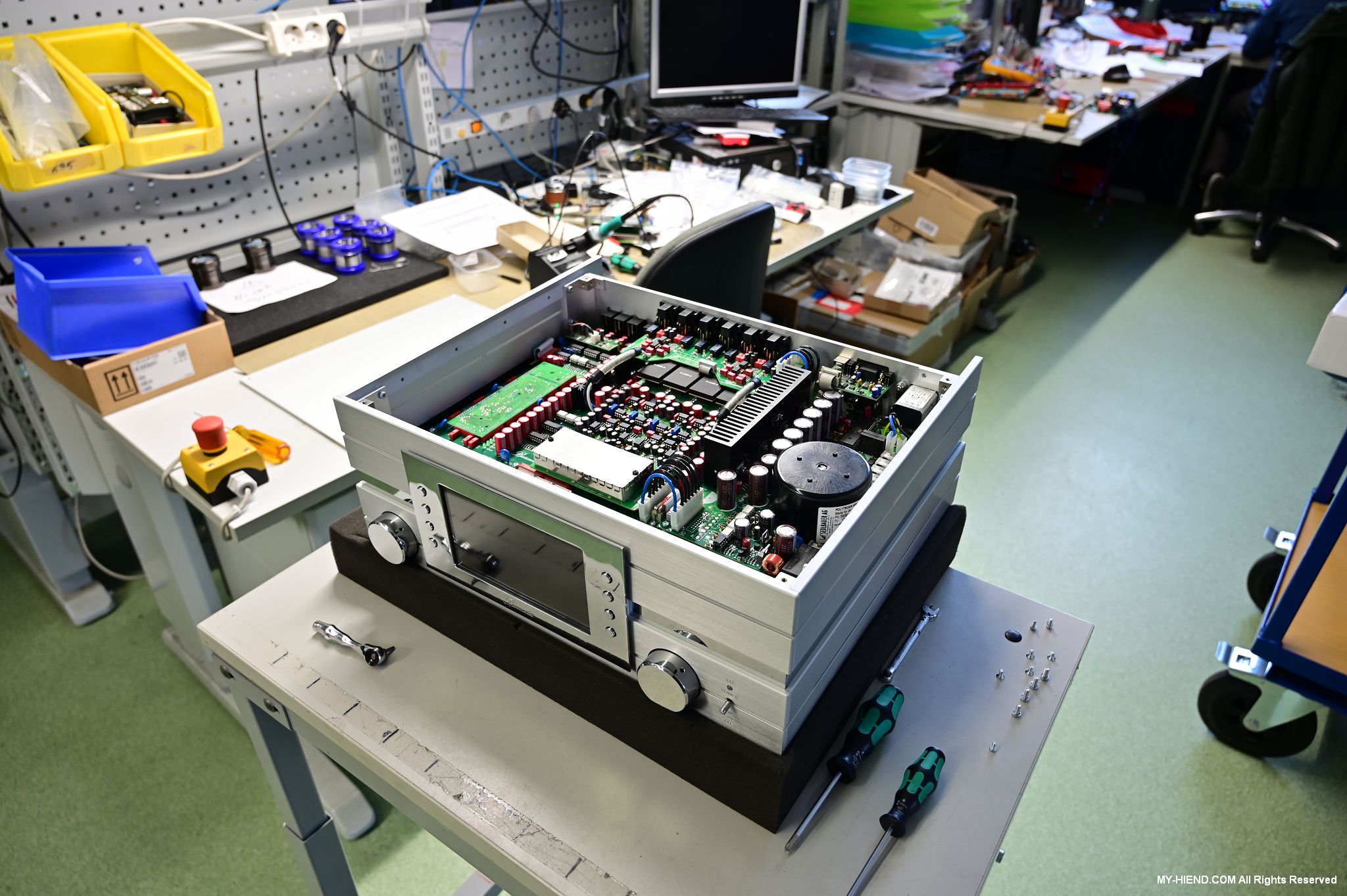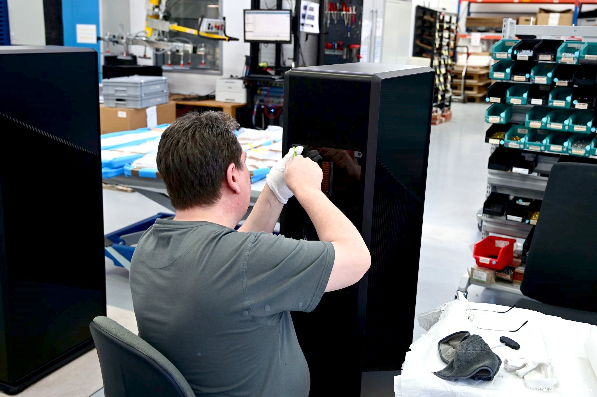 這區目前正全力生產Burmester 232綜擴,每一台232大約需要一整天的時間組裝,組裝好後就會進行測量,共有300個檢測項目都需通過,然後接著放到架上進行熟化約100個小時與壓力測試(Stress Test),都通過後就會進行實際聆聽,最後就是清潔跟 包裝出貨了。
