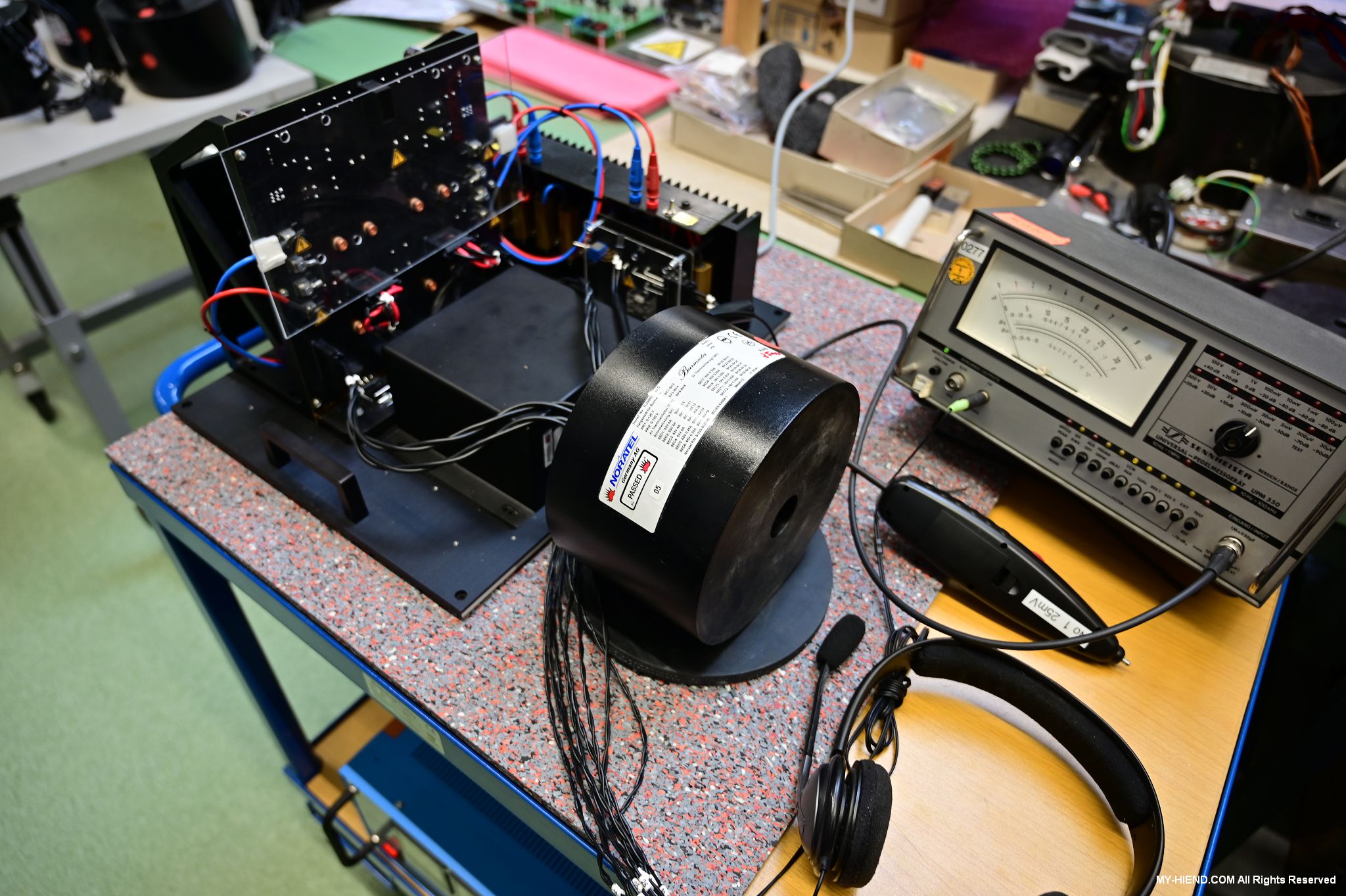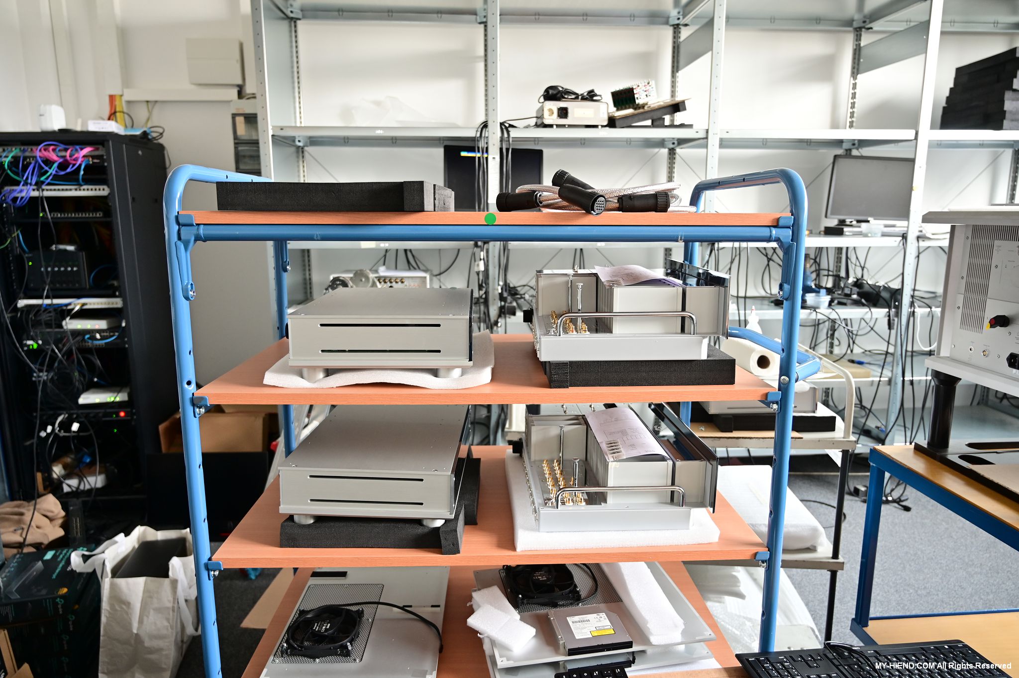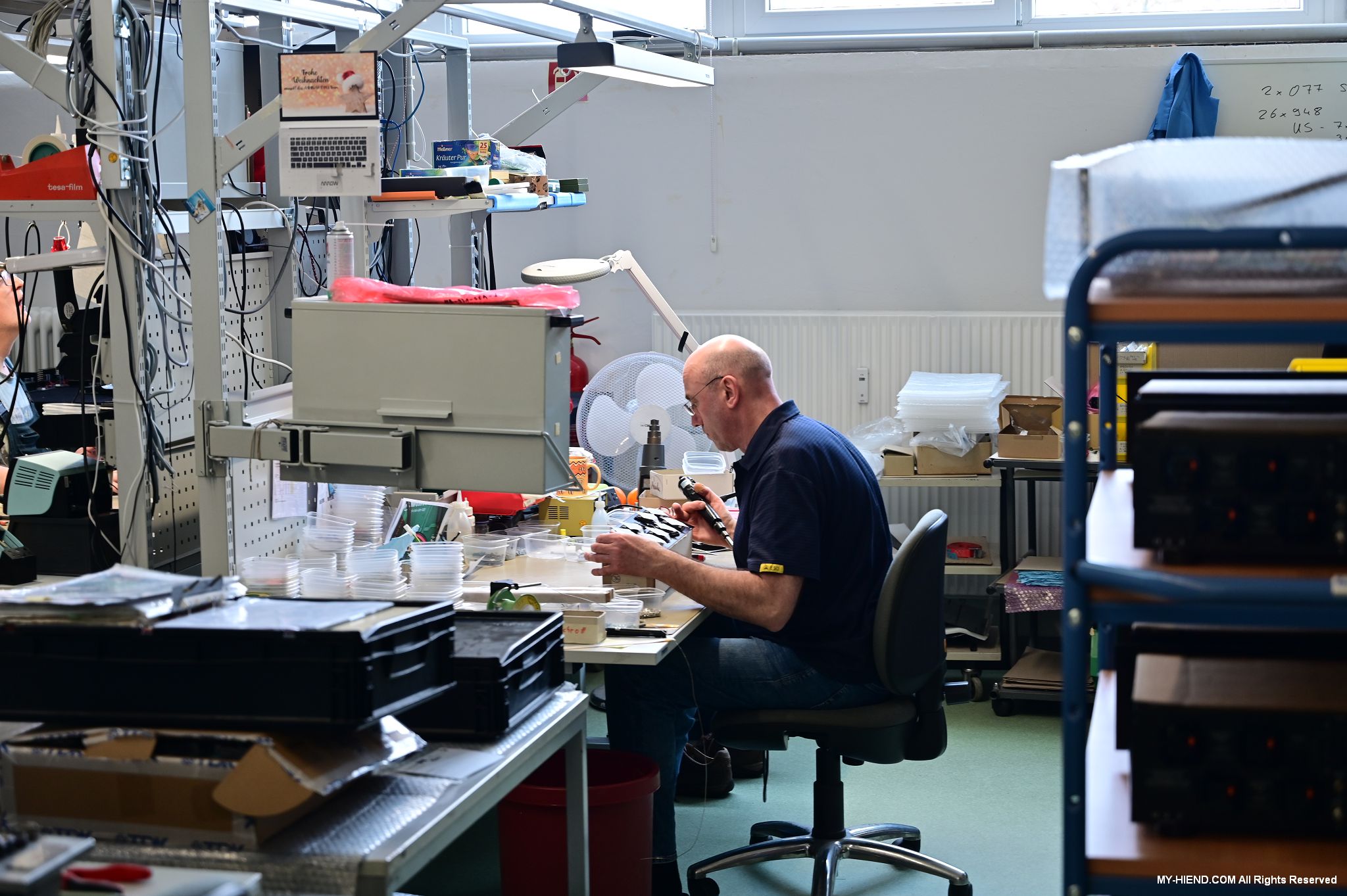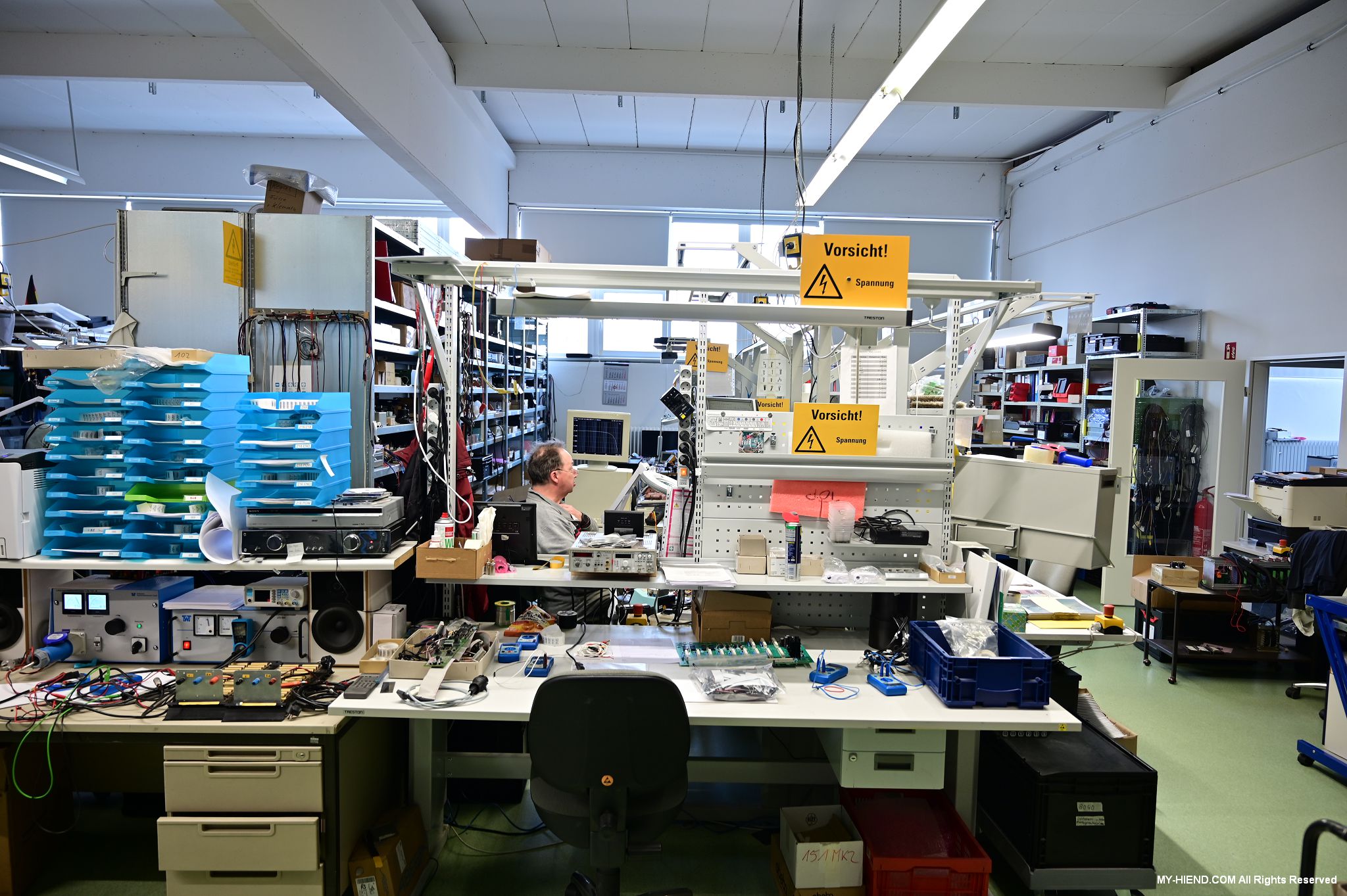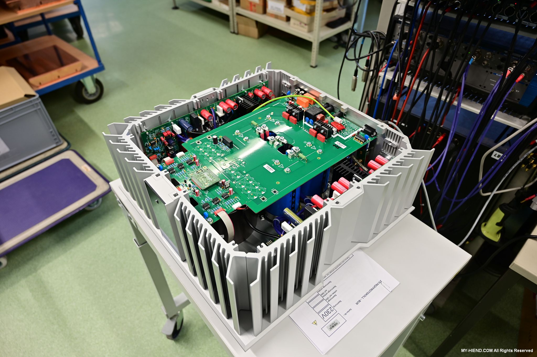 這區目前正全力生產Burmester 232綜擴,每一台232大約需要一整天的時間組裝,組裝好後就會進行測量,共有300個檢測項目都需通過,然後接著放到架上進行熟化約100個小時與壓力測試(Stress Test),都通過後就會進行實際聆聽,最後就是清潔跟 包裝出貨了。