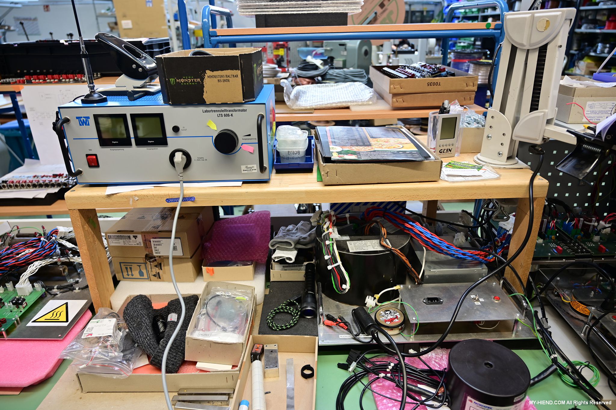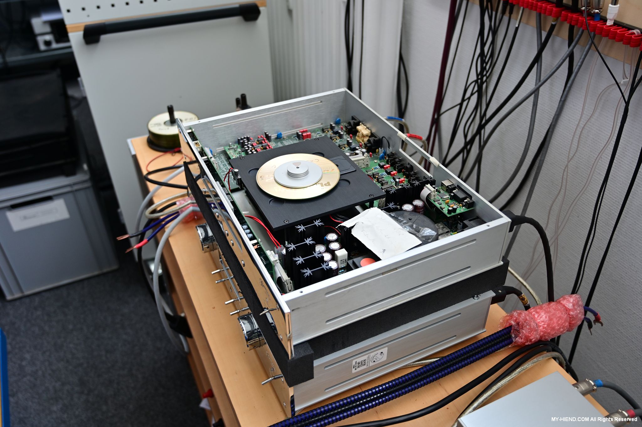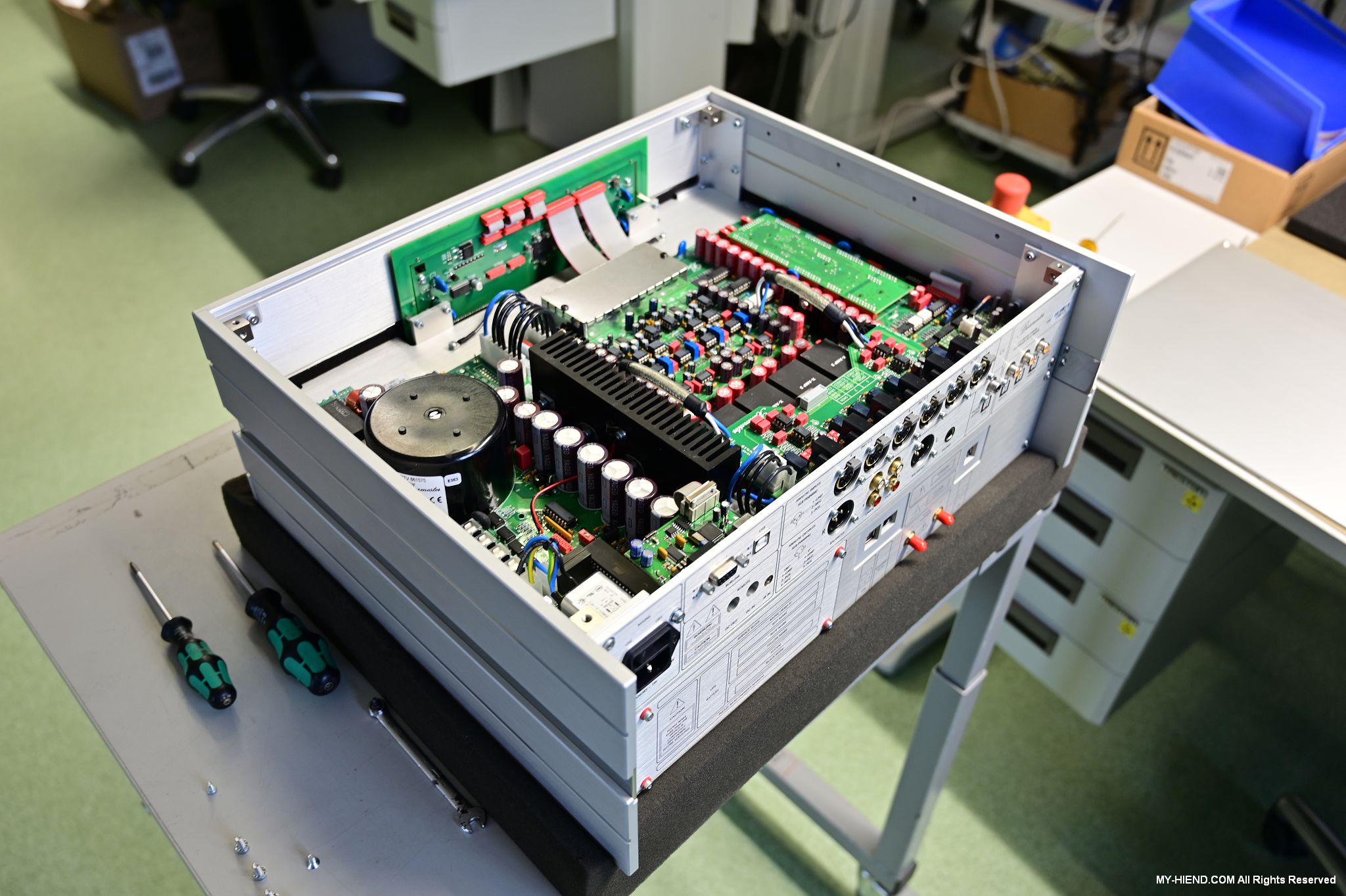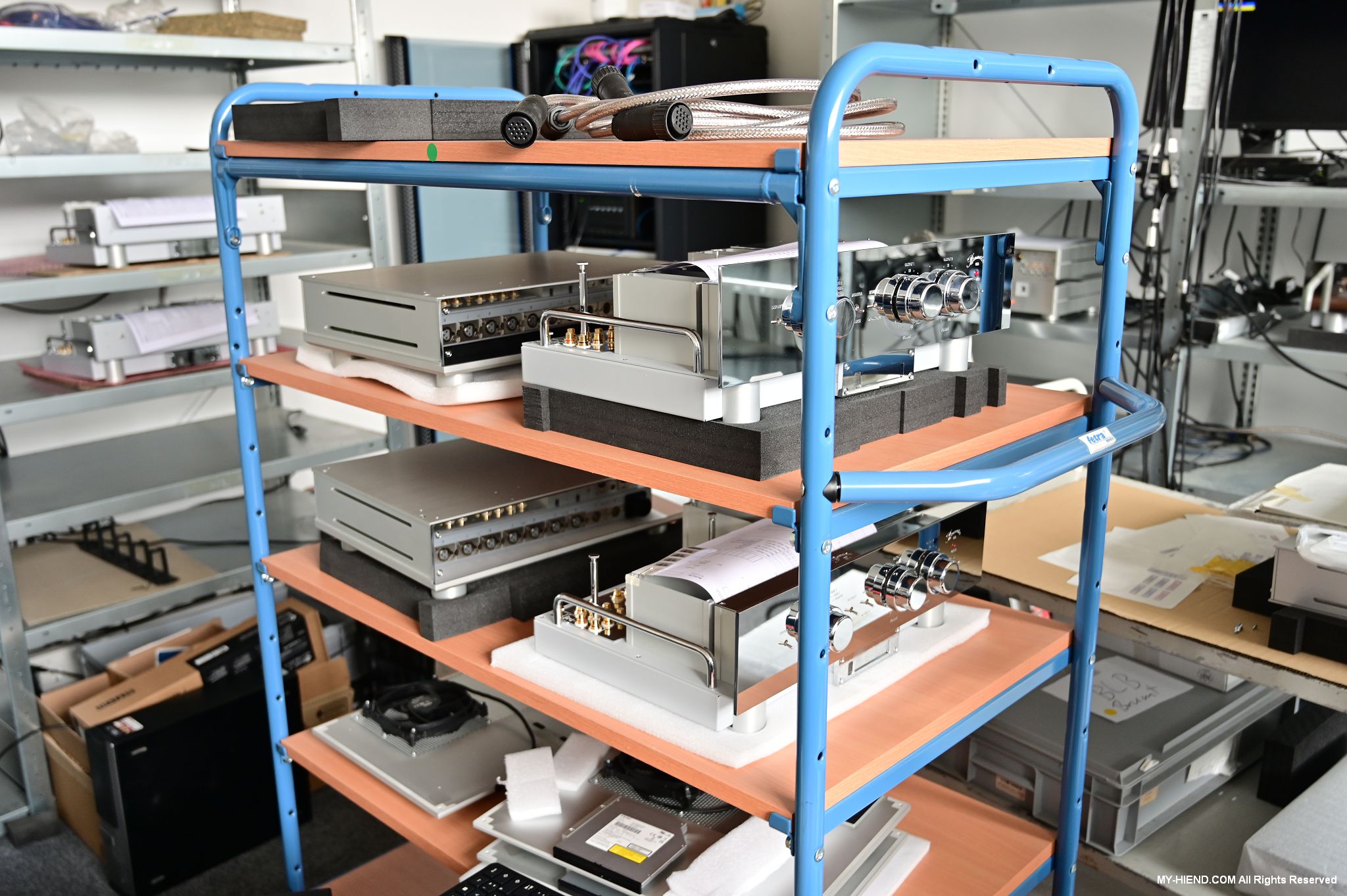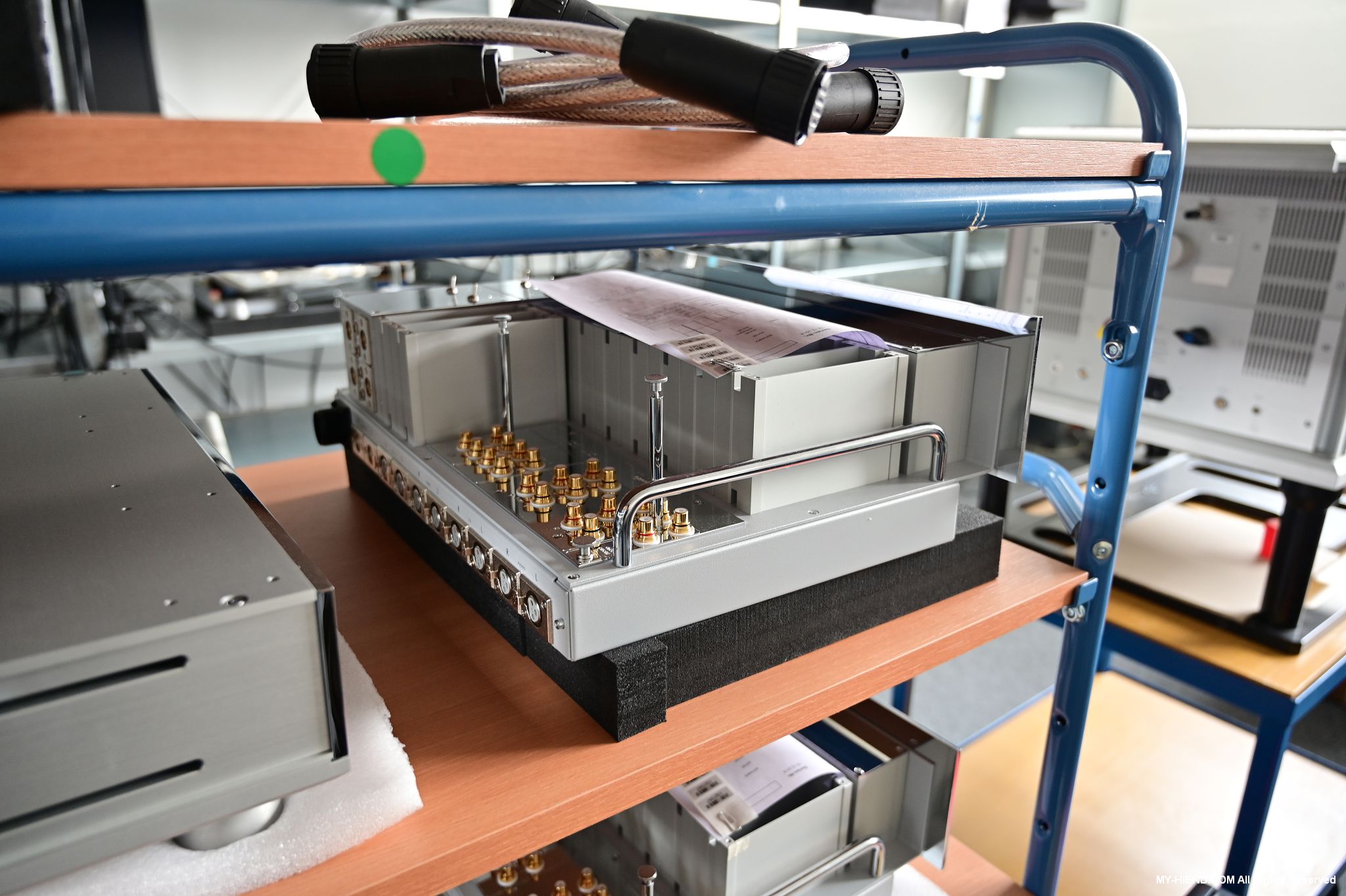 這區目前正全力生產Burmester 232綜擴,每一台232大約需要一整天的時間組裝,組裝好後就會進行測量,共有300個檢測項目都需通過,然後接著放到架上進行熟化約100個小時與壓力測試(Stress Test),都通過後就會進行實際聆聽,最後就是清潔跟 包裝出貨了。