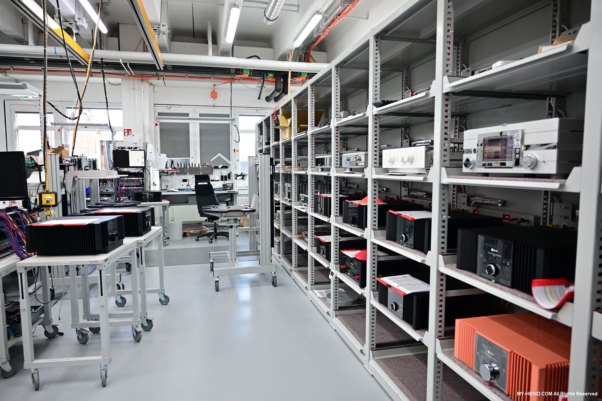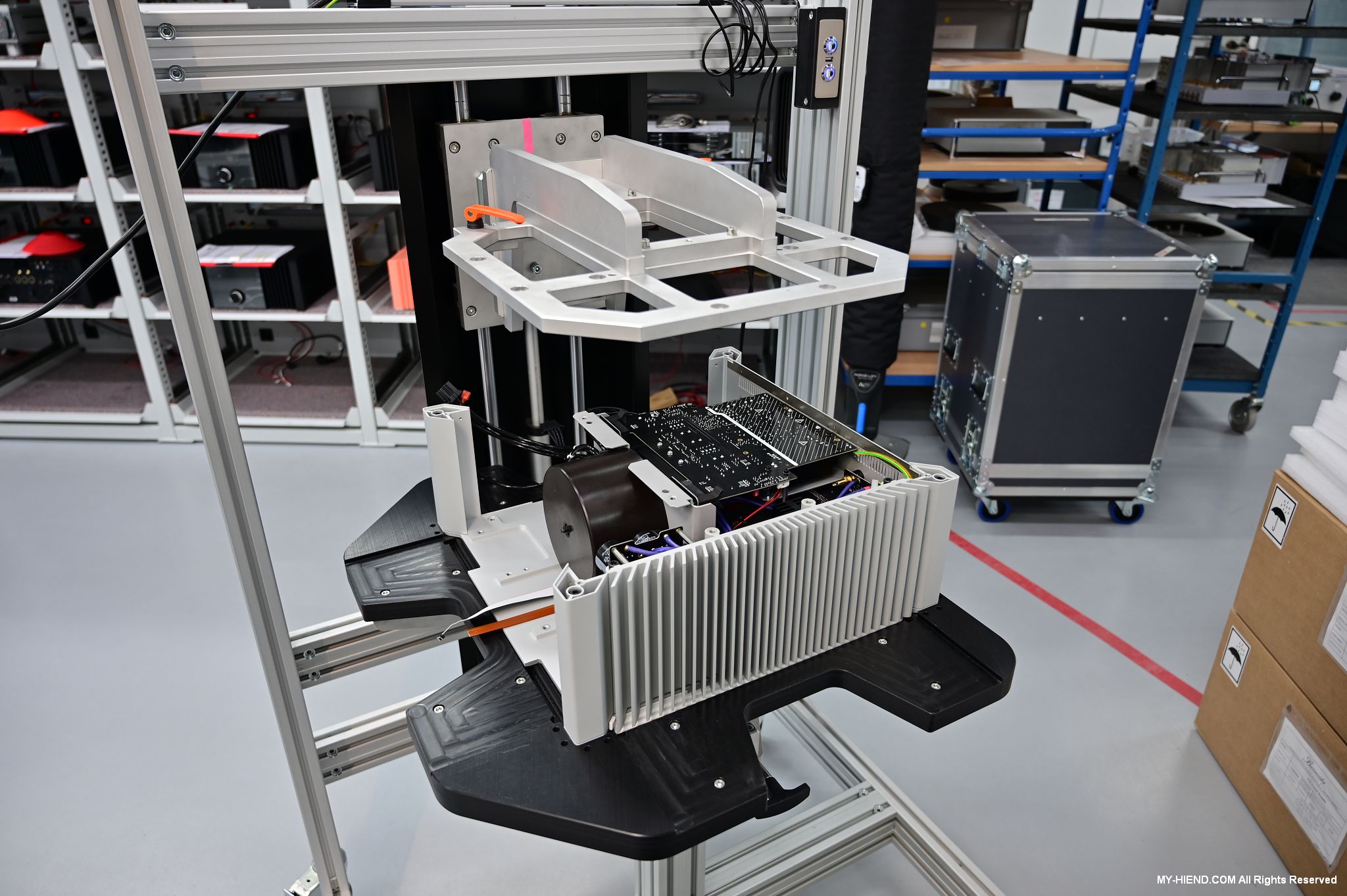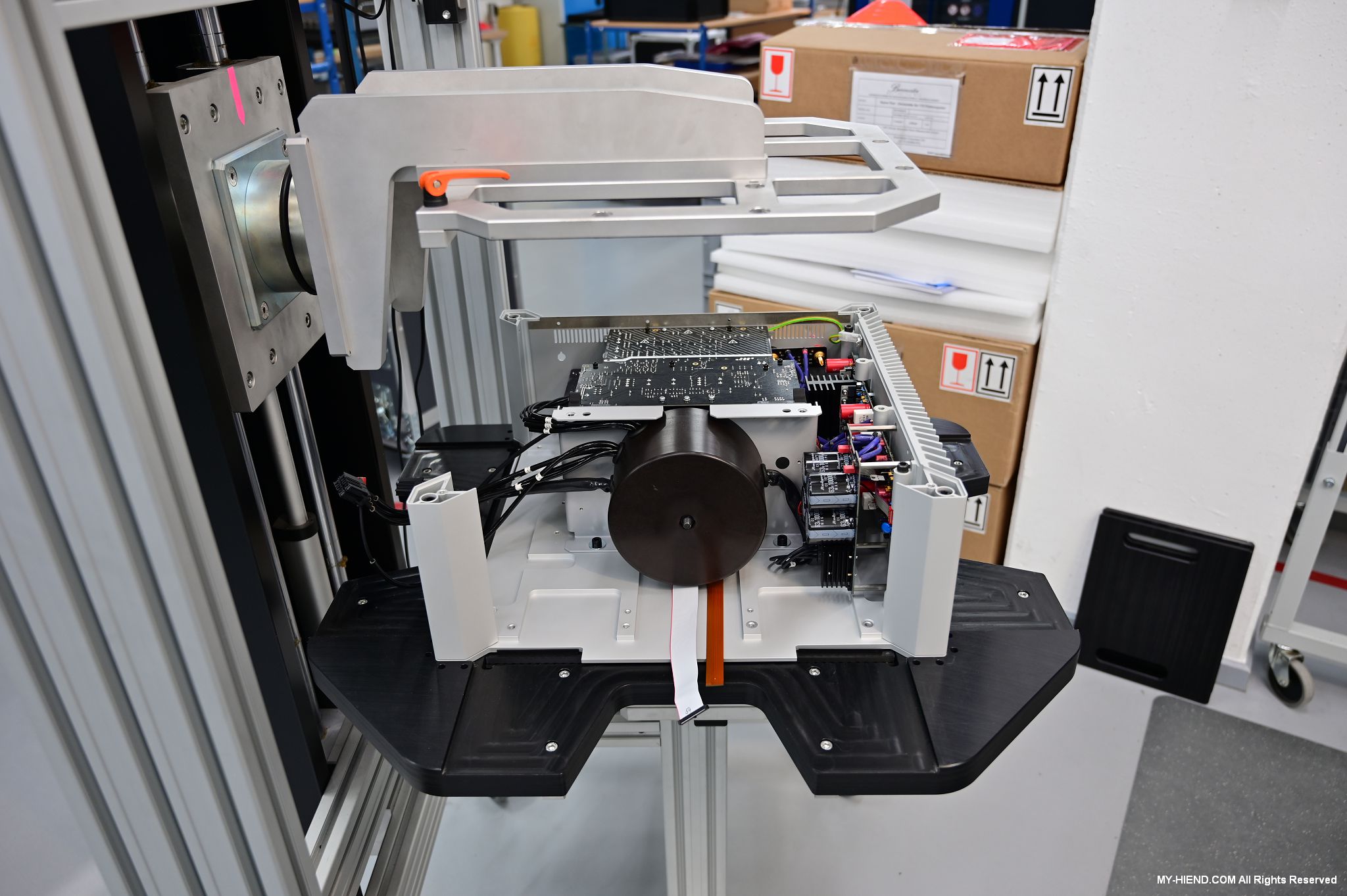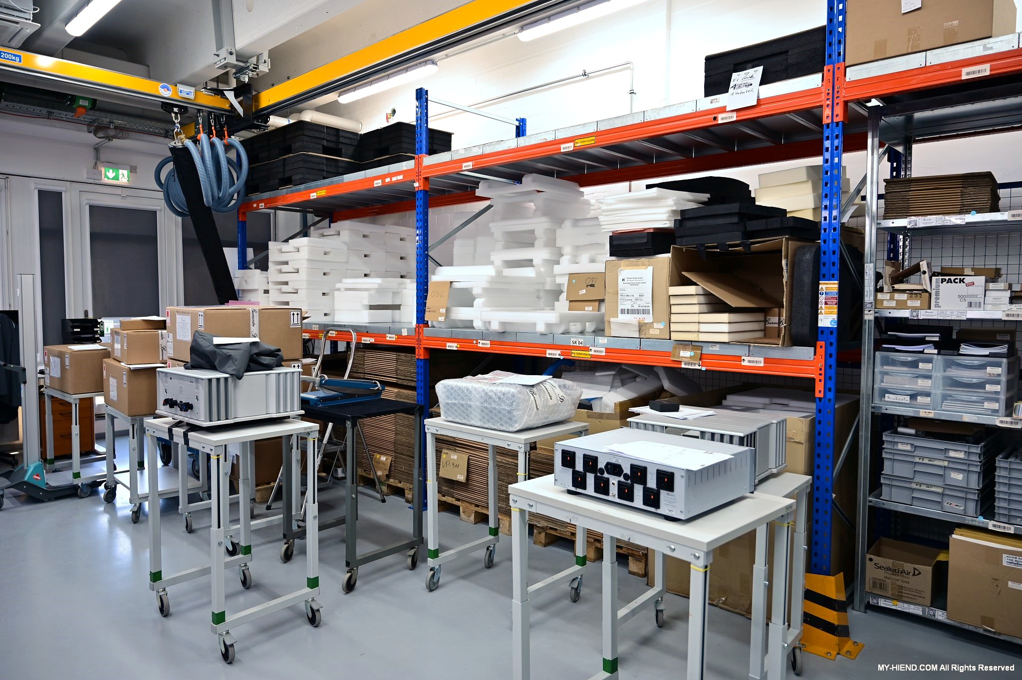 辦公區域接著我們進入總部一樓的生產區域,專門打造的音響室也在這裡。在這裡主要從事組裝生產、品管測試、產品熟化、試聽、包裝與出貨等部份,另外還有維修部門。重新整新後動線更為流暢,環境乾淨明亮,並增添了許多輔助的現代化機器設備來搬運或是組裝器材,畢竟Burmester的器材都具有一定的重量。這台由德國FEZER (Albert Fezer Maschinenfabrik GmbH)公司製造的真空搬運機 (Vacuum Lifter),這些真空搬運機並與預先安裝好在天花板的軌道結合,如此一來器材就可以在工廠內輕鬆的移動。