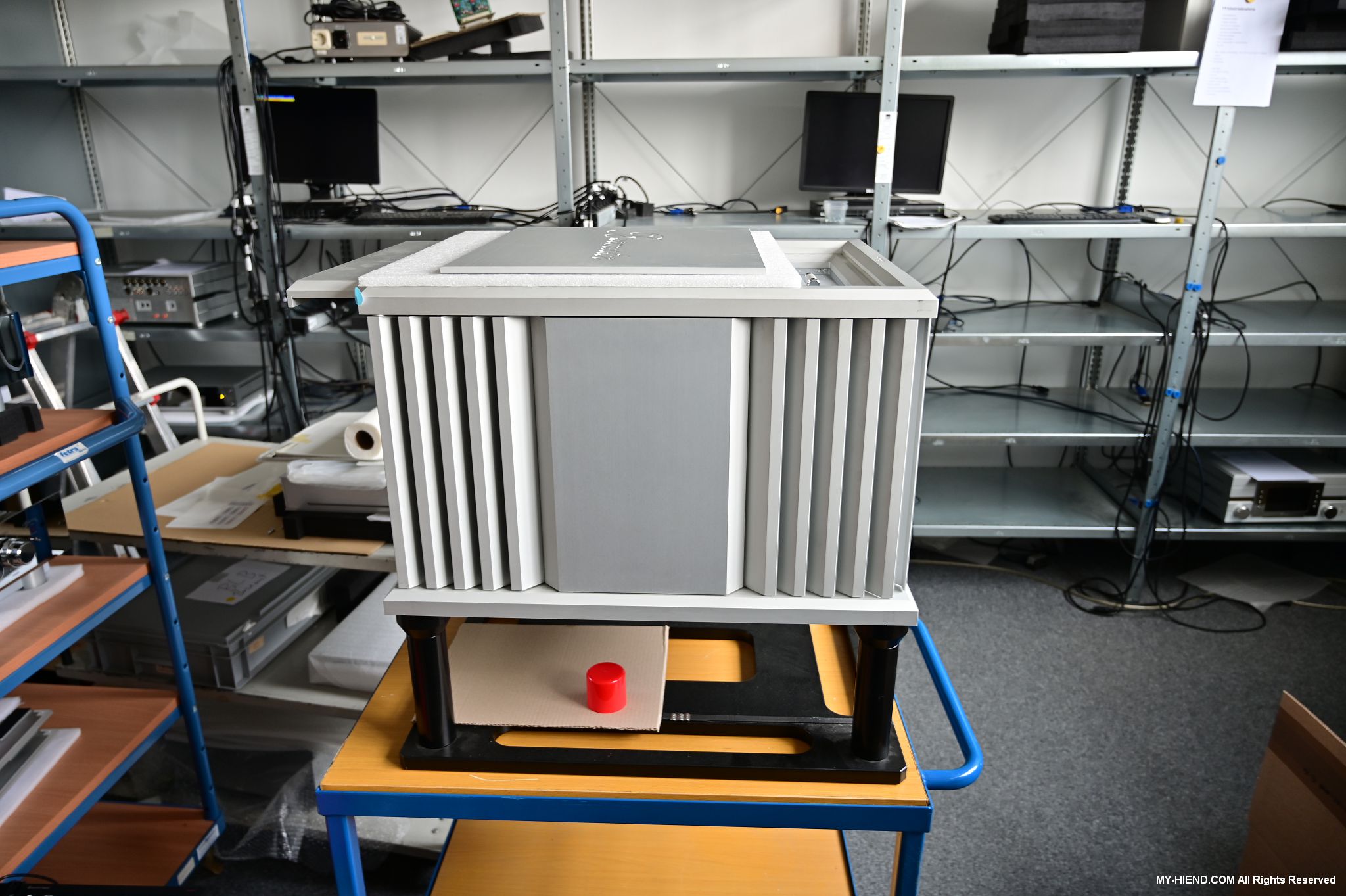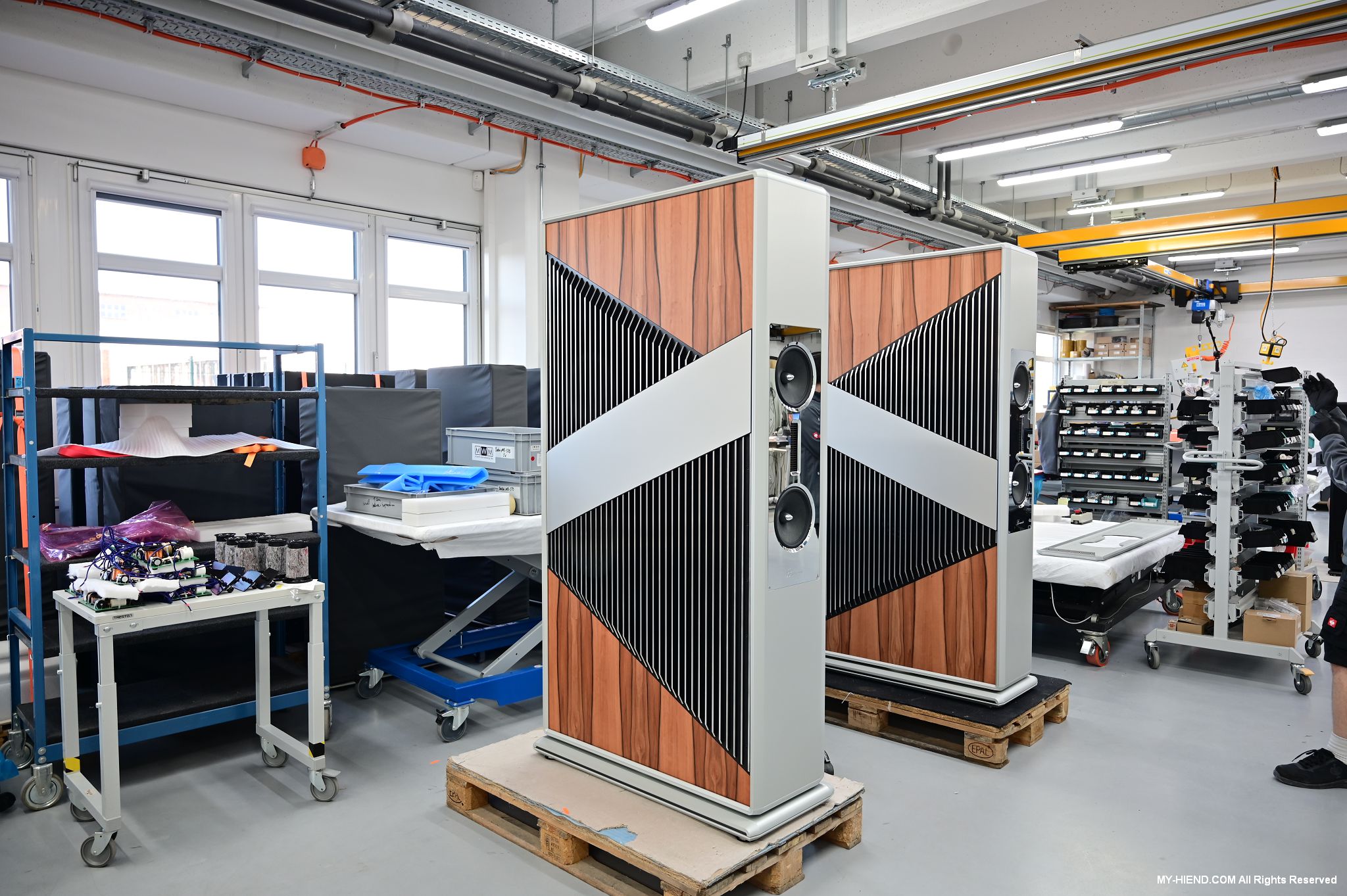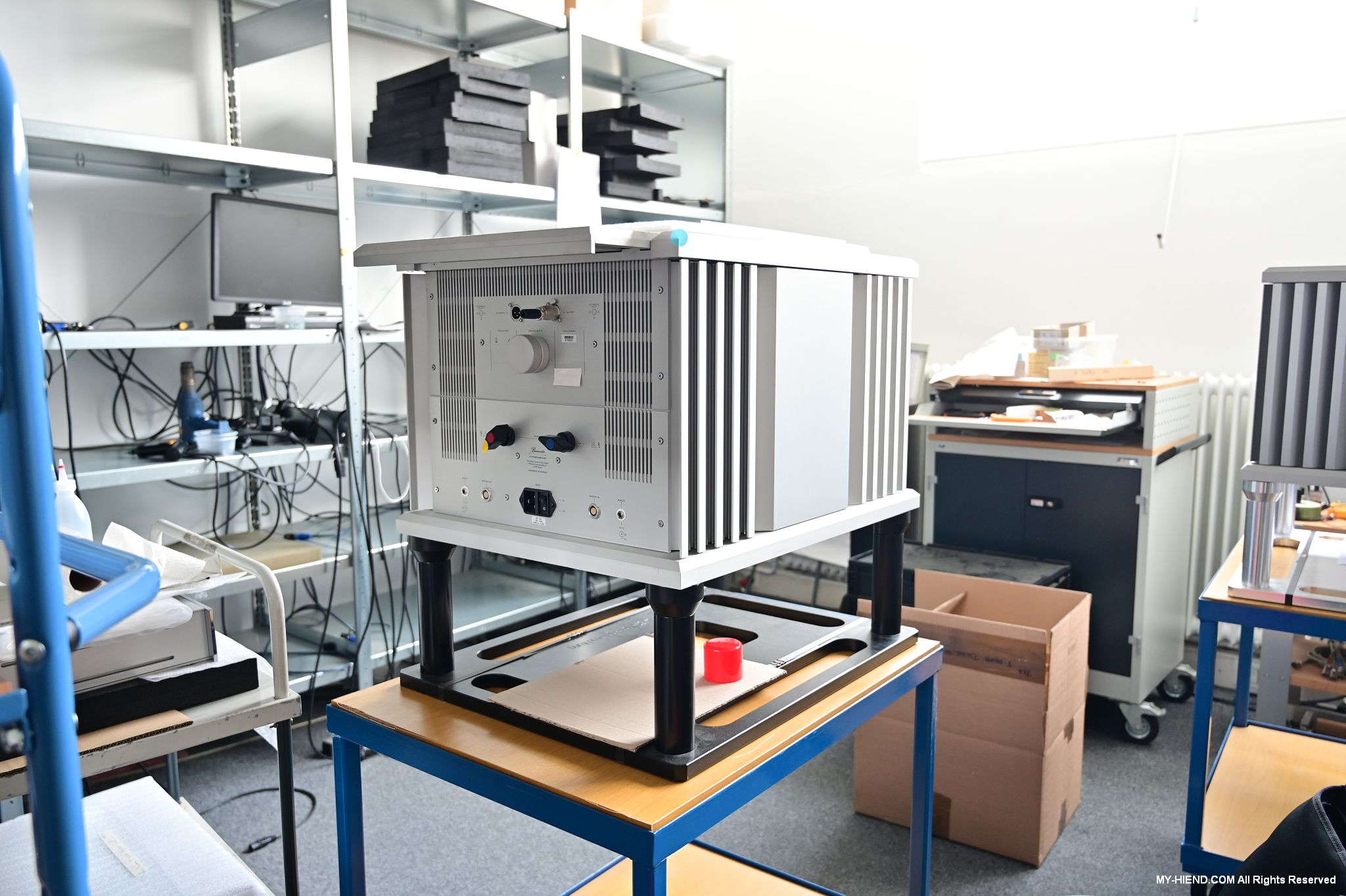 辦公區域接著我們進入總部一樓的生產區域,專門打造的音響室也在這裡。在這裡主要從事組裝生產、品管測試、產品熟化、試聽、包裝與出貨等部份,另外還有維修部門。重新整新後動線更為流暢,環境乾淨明亮,並增添了許多輔助的現代化機器設備來搬運或是組裝器材,畢竟Burmester的器材都具有一定的重量。這台由德國FEZER (Albert Fezer Maschinenfabrik GmbH)公司製造的真空搬運機 (Vacuum Lifter),這些真空搬運機並與預先安裝好在天花板的軌道結合,如此一來器材就可以在工廠內輕鬆的移動。