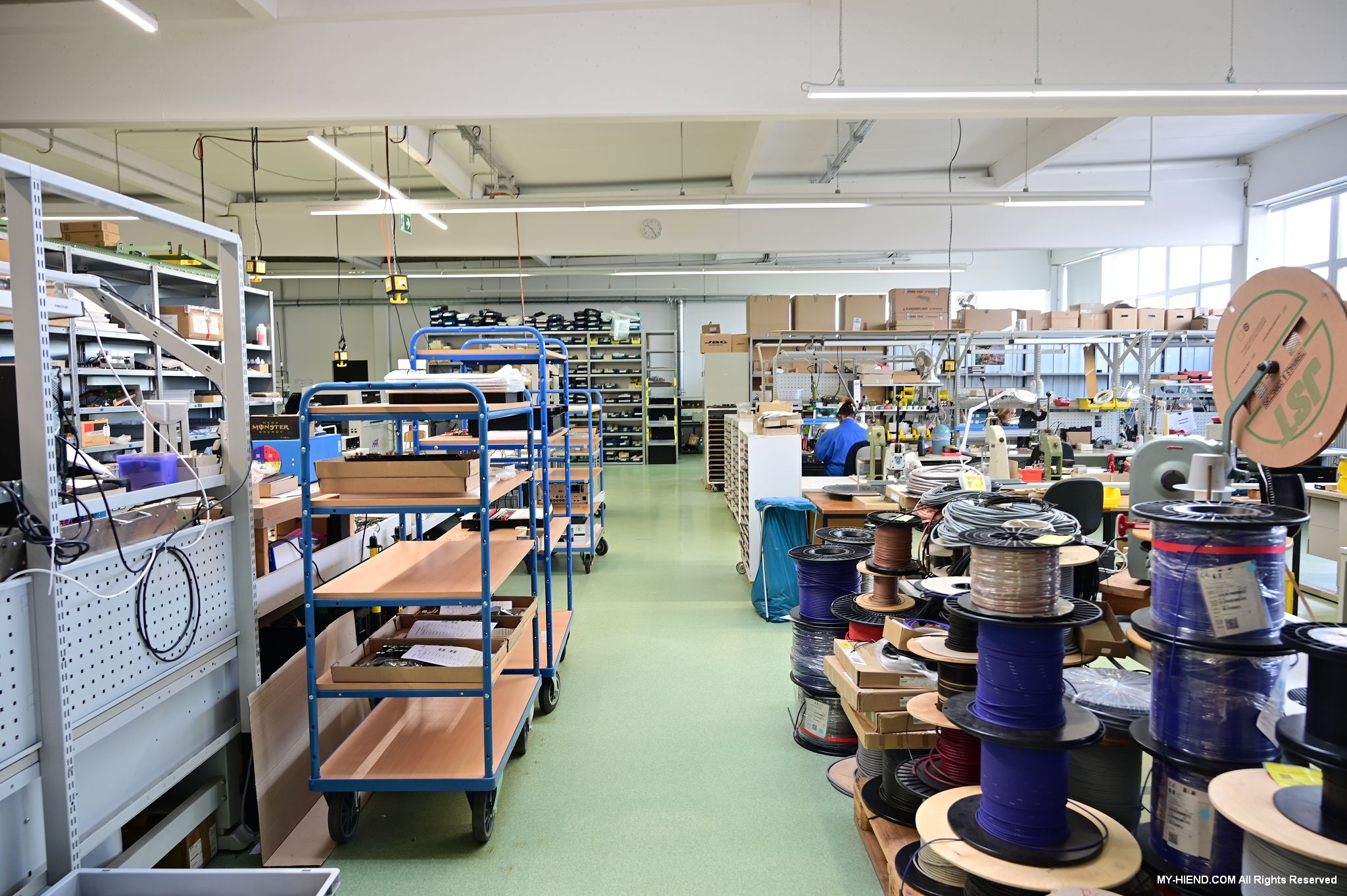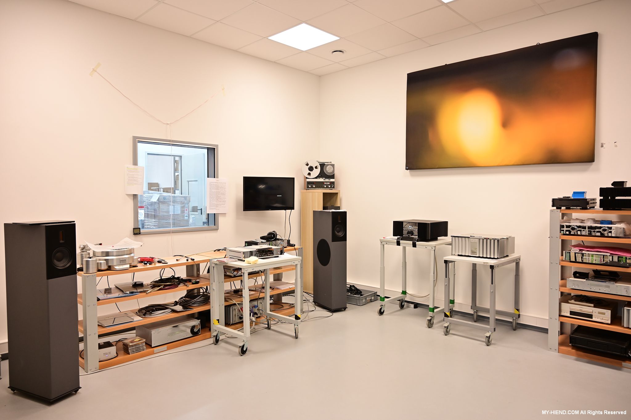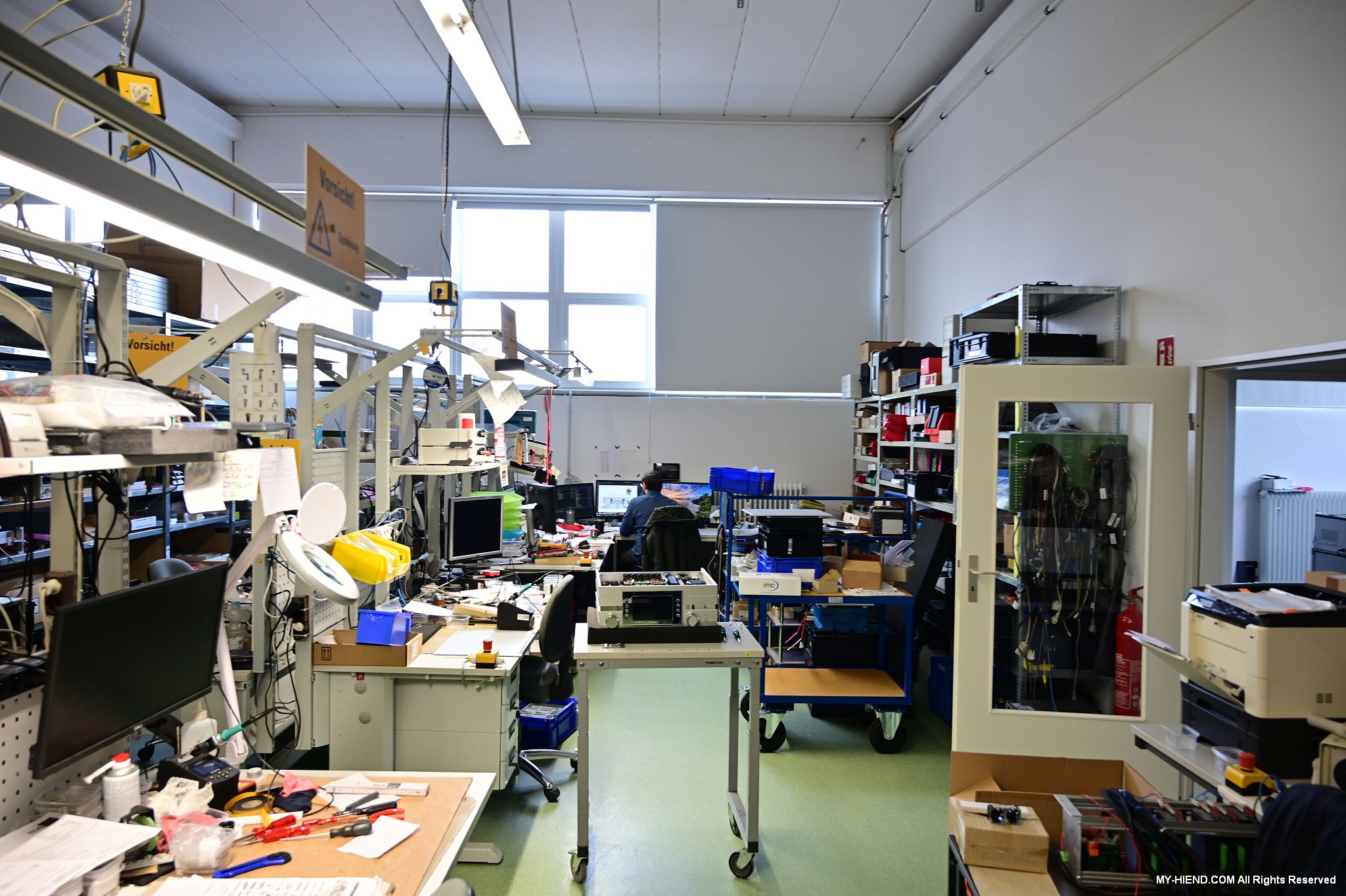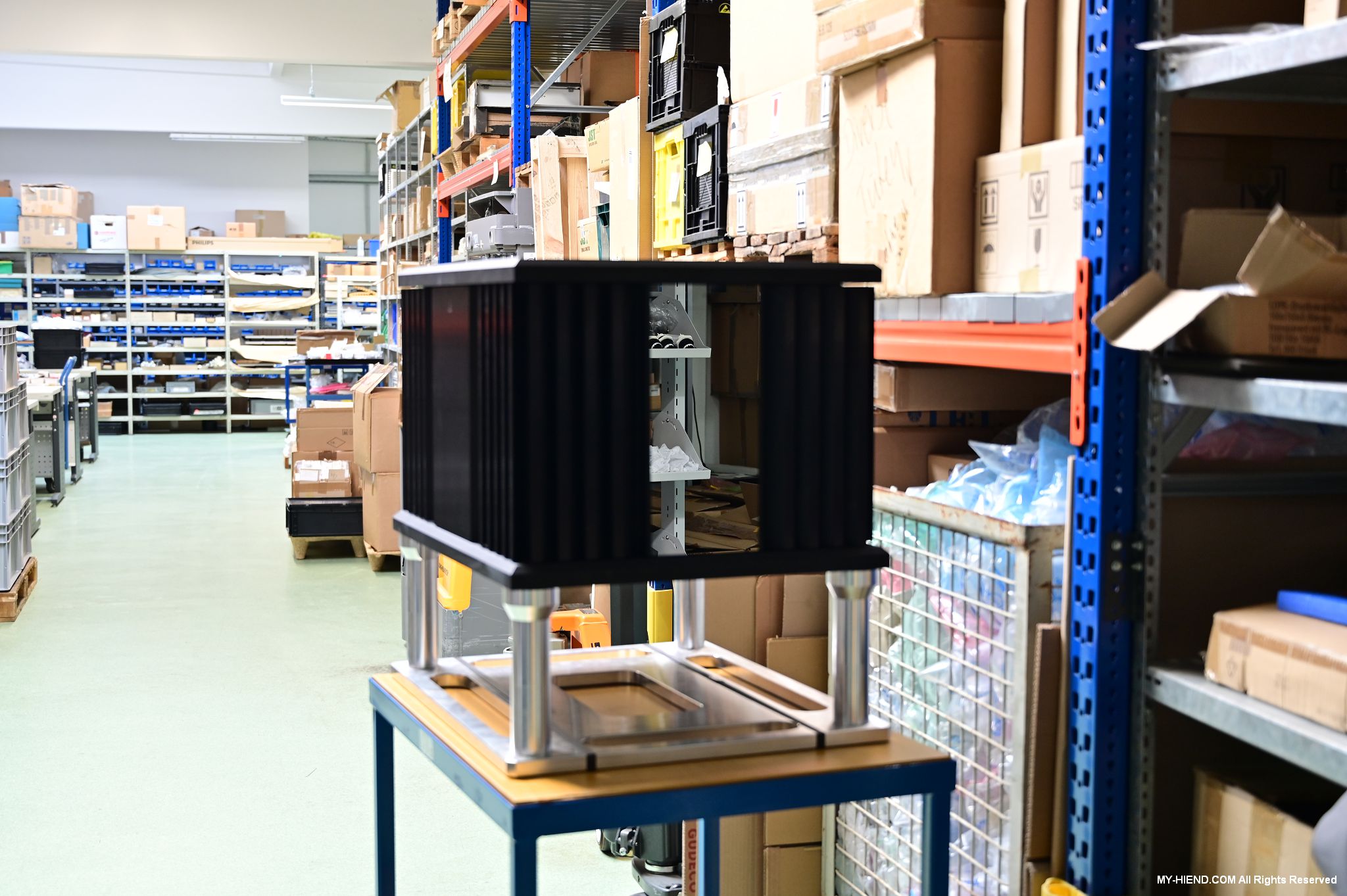 辦公區域接著我們進入總部一樓的生產區域,專門打造的音響室也在這裡。在這裡主要從事組裝生產、品管測試、產品熟化、試聽、包裝與出貨等部份,另外還有維修部門。重新整新後動線更為流暢,環境乾淨明亮,並增添了許多輔助的現代化機器設備來搬運或是組裝器材,畢竟Burmester的器材都具有一定的重量。這台由德國FEZER (Albert Fezer Maschinenfabrik GmbH)公司製造的真空搬運機 (Vacuum Lifter),這些真空搬運機並與預先安裝好在天花板的軌道結合,如此一來器材就可以在工廠內輕鬆的移動。