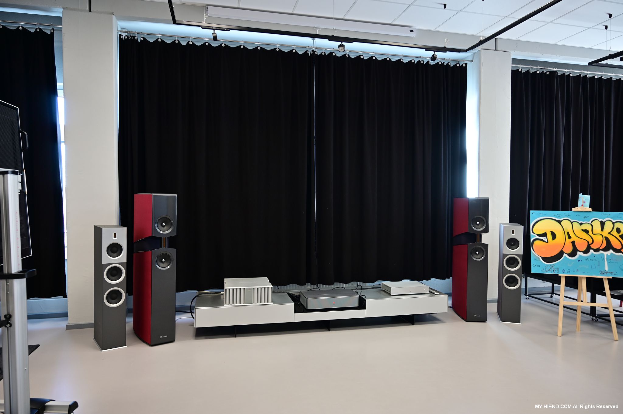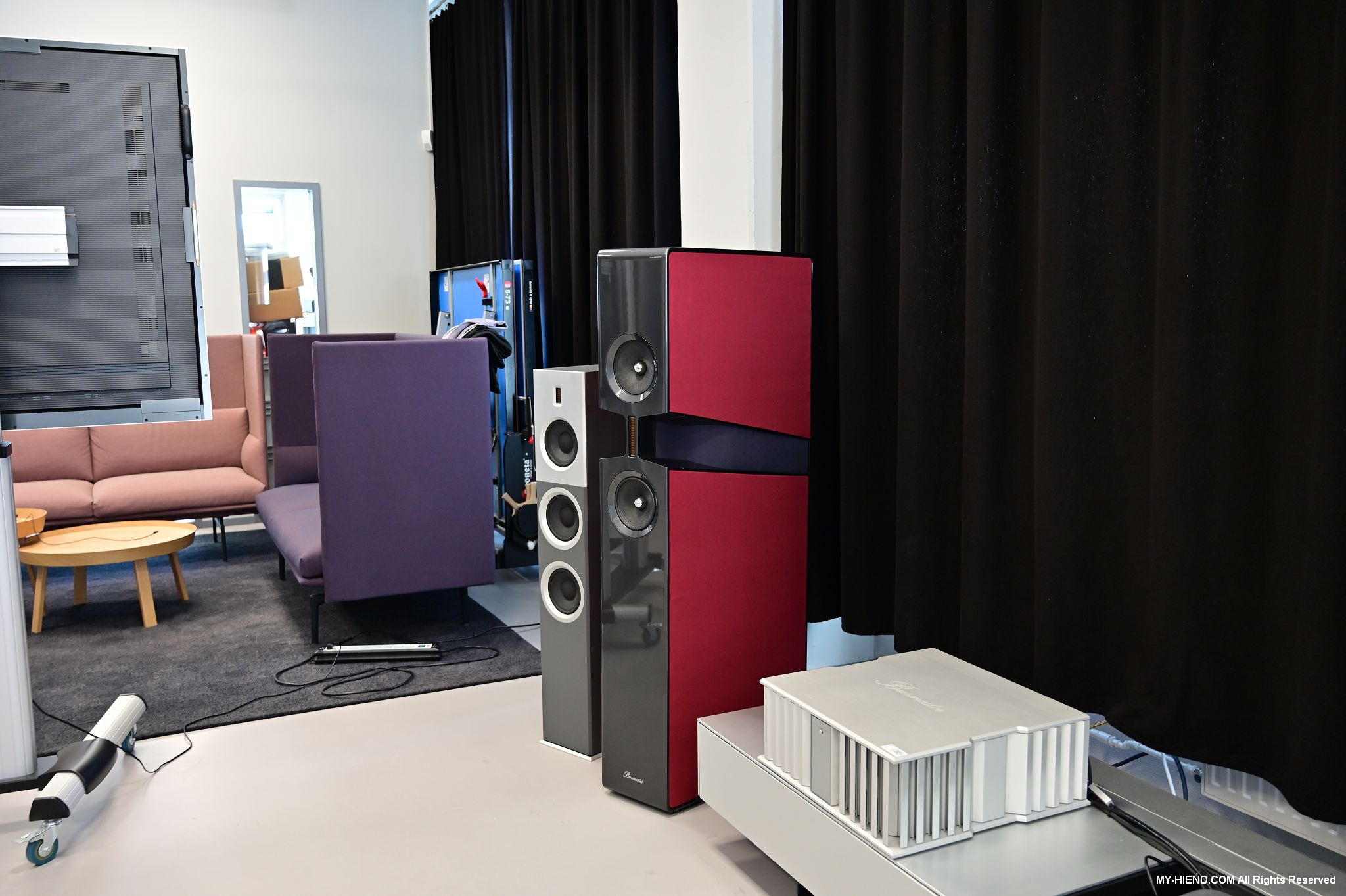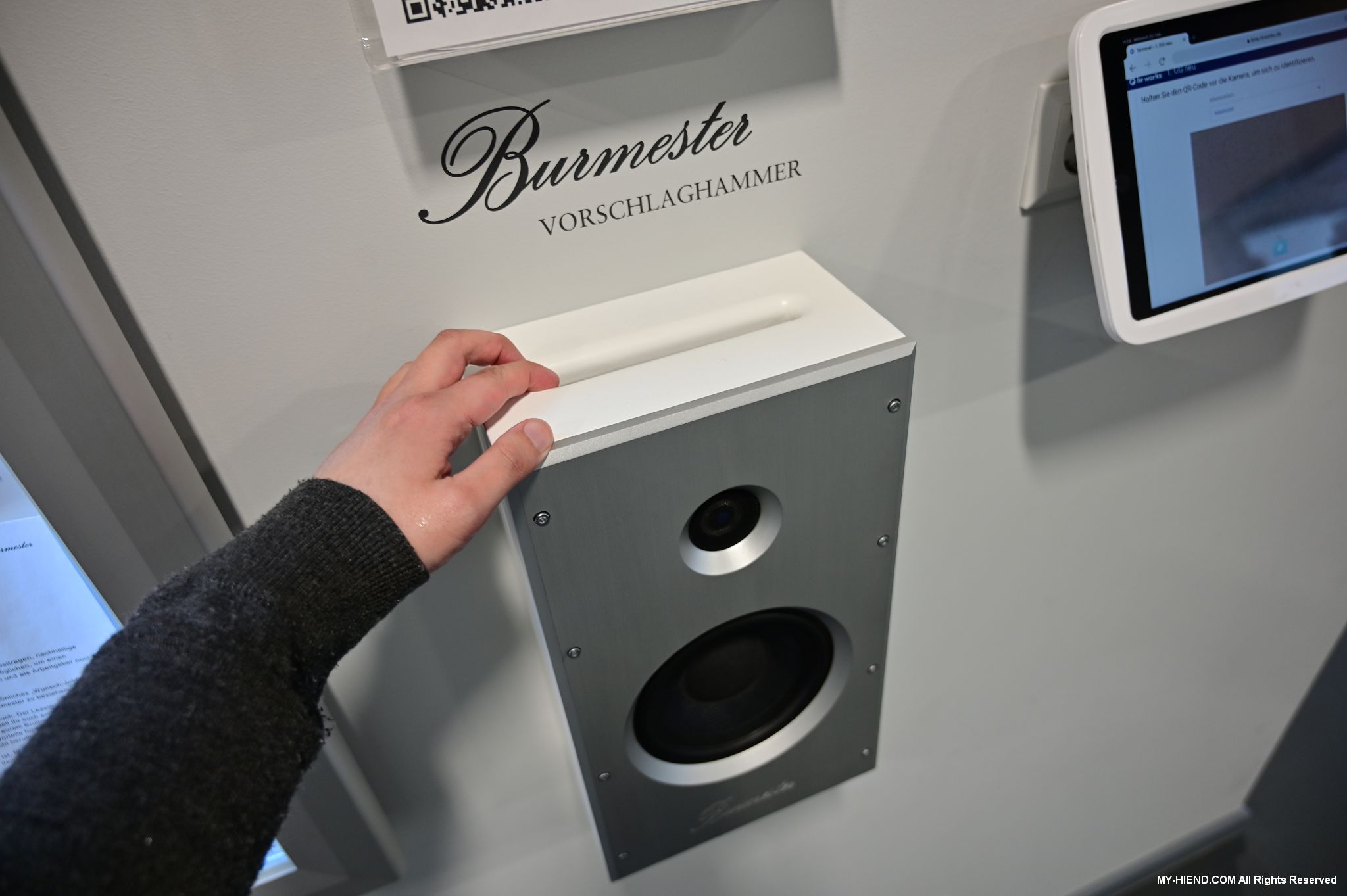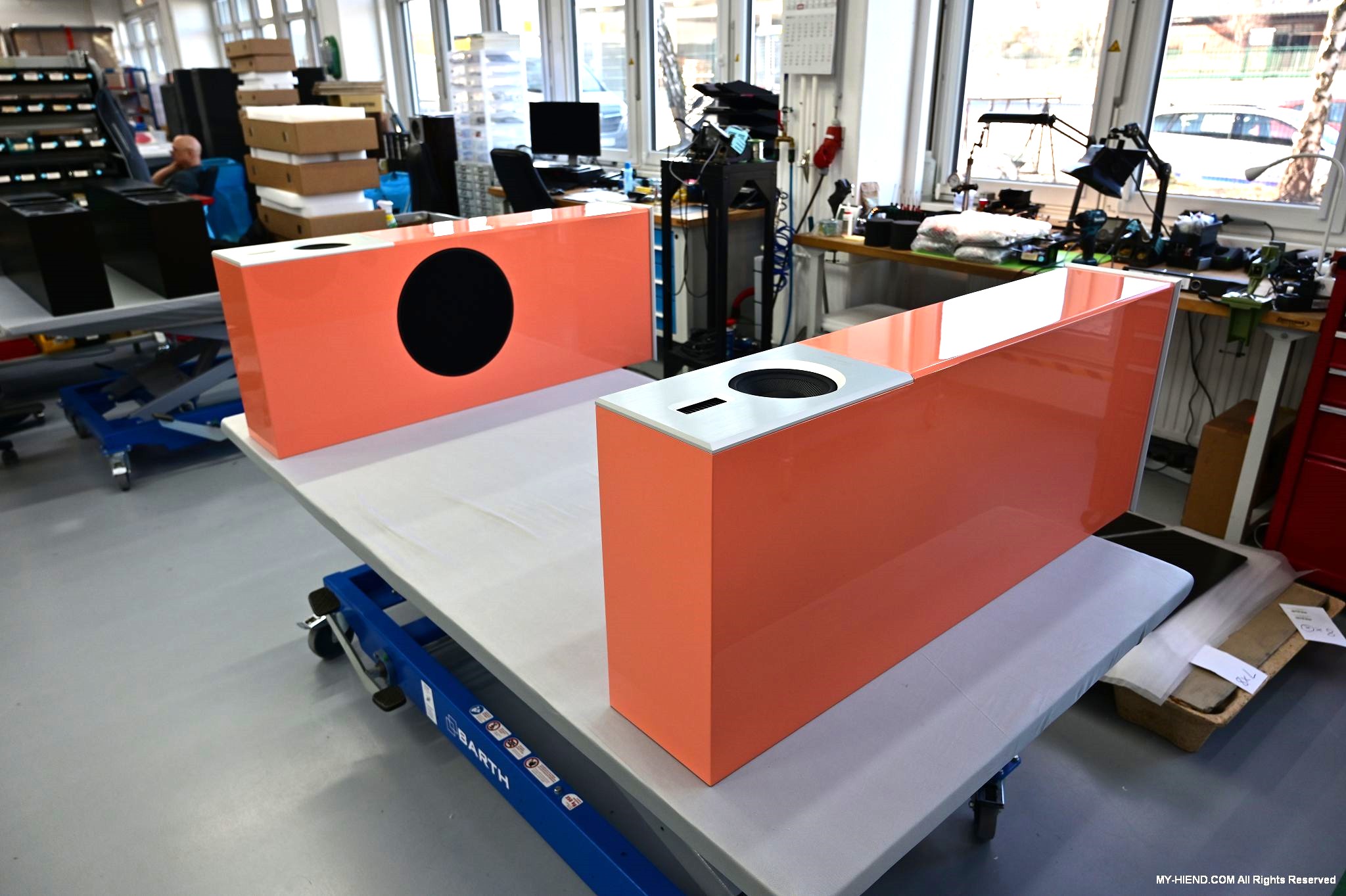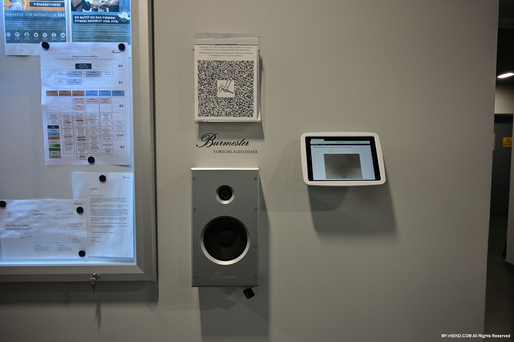 接著我們就前往Burmester新完工的總部,位置沒變,為在原地重新裝潢,Burmester總部離柏林市中心相當近,整棟建築共有兩層,總面積達3,400平方公尺 (1,028.5坪),一樓主要是工廠與音響室,二樓是辦公室,到訪時要進行登記並換參觀證,這裡有著很完善的管理,二樓辦公室入口接待處很貼心的在電子看板上顯示歡迎Simon跟我(Leo)到訪。總部負責導覽的是客服經理Phillipe Marseille先生。接待處展示了B38喇叭的各種外觀設計,有跟藝術家合作的,有不同材質的,不同表面處理方式的,各式客訂服務(Bespoke)是Burmester近來重要的發展主軸之一,可以滿足用家的各種對外觀的偏好需求。