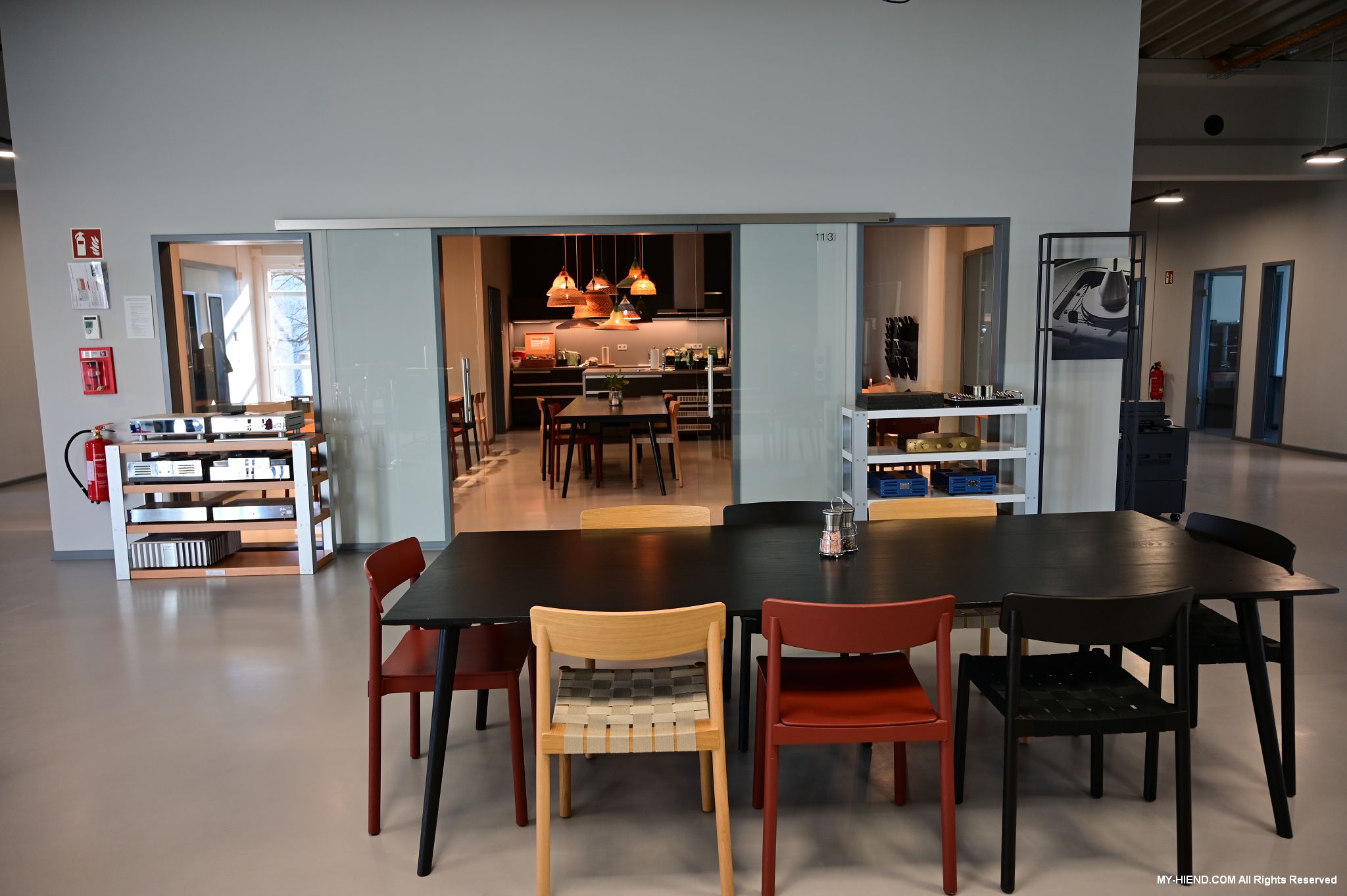 二樓畫分了許多間辦公室與會議室、還有非常漂亮開放式的員工餐廳,走道或是每一間辦公室裡、甚至員工餐廳都可見Burmester的產品在其中,也有一些非Burmester但具有特別意義的東西,如創辦人Dieter Burmester先生擁有的Fender吉他與Orange擴大機,Burmester最新串流綜擴232的實體爆炸模型也非常有意思,其他還有經典的808前級、909後級、911後級,順便一提,Burmester的產品都以數字命名,其中一個命名邏輯為代表該產品研發的時間,例如909就是1990年9月研發出來的,之後新一代的就加上MK1、MK2….,可見得Burmester對其每一樣產品都非常有信心,也是另一個永續概念的呈現。