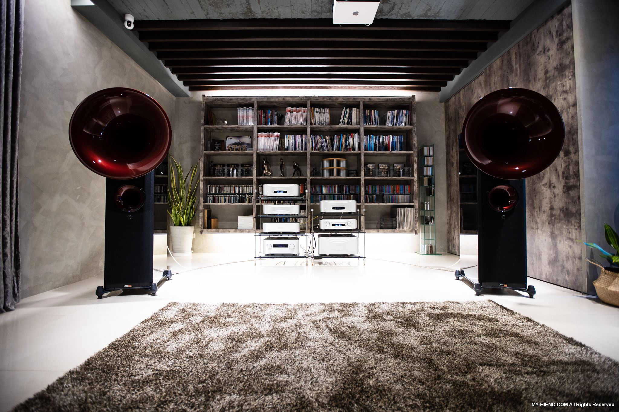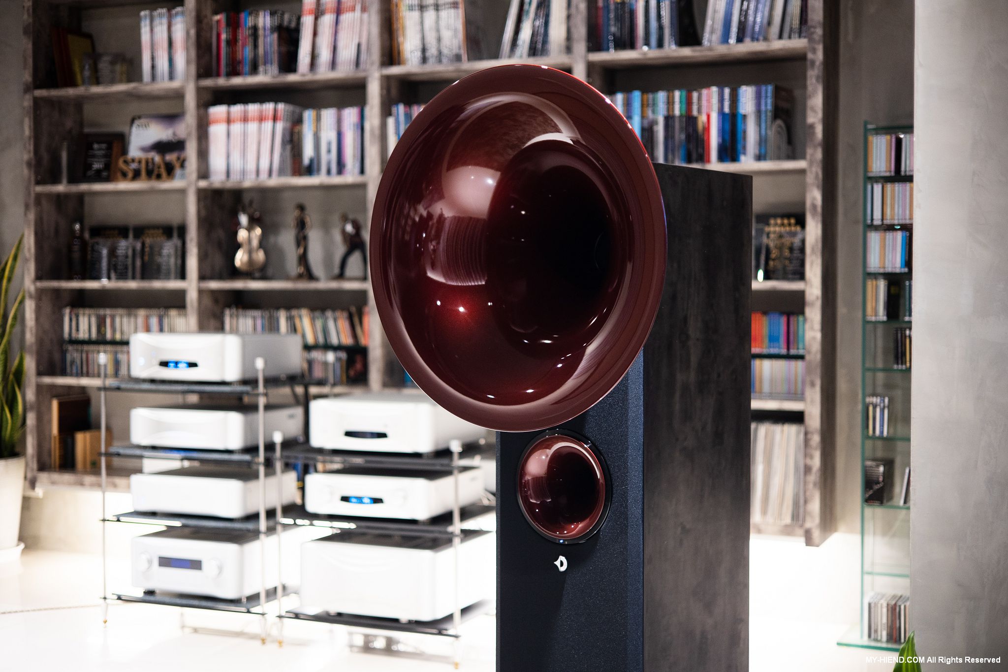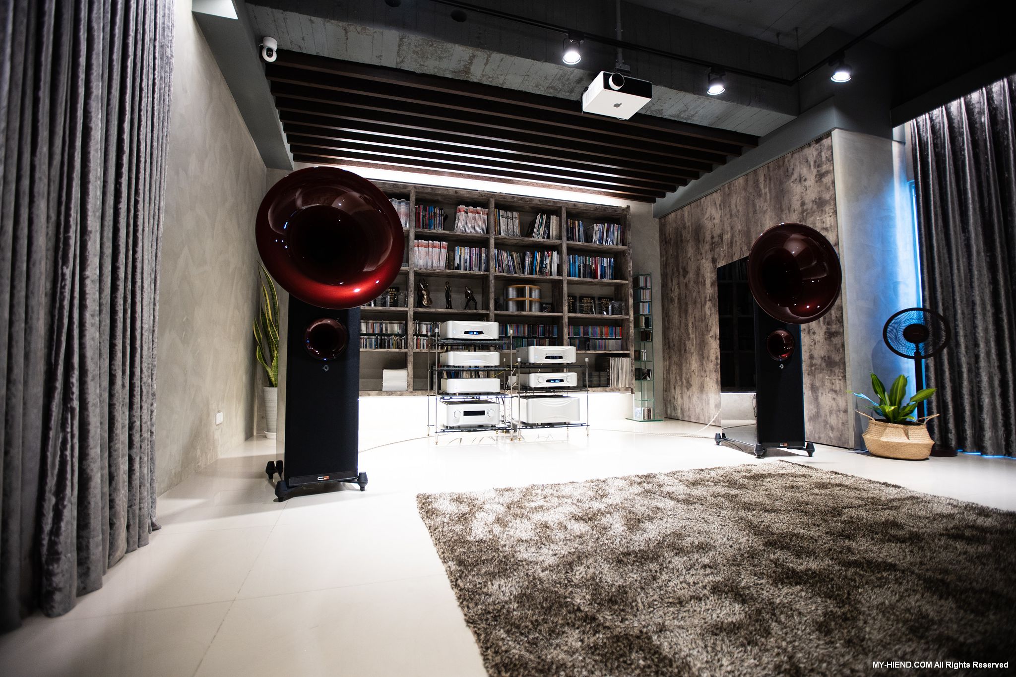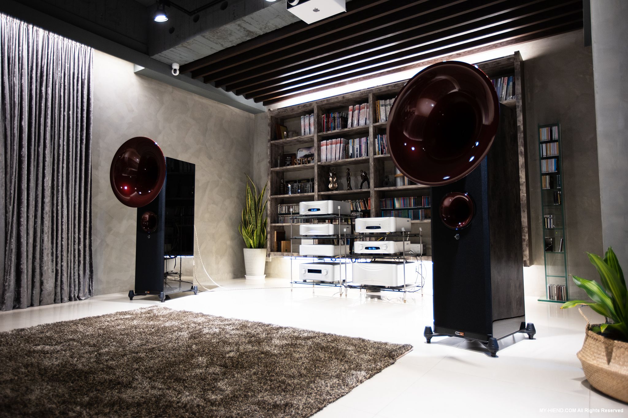 當天搭配的喇叭是Avantgarde DUO SD,採用全主動式版本,代理商勝旗音響搭配一部Esoteric Grandioso C1X solo前級擴大機提供更好的訊號品質與音量控制。Avantgarde DUO SD號角喇叭是極高效率且非常直接的聲音表現,對於音樂細節的揭露能力很強,全主動式設計讓訊源端的原始聲音不被搭配的擴大機影響音色或因搭配不良產生劣化,但這也使得訊源角色更加吃重,是很好的考驗機會。