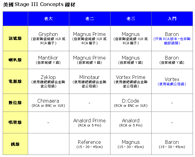 美國Stage III成立於1996年,為音響線材設計的創新者,是第1家使用浮動純銀絲帶結合空氣為電介質技術來生產線材的廠商。所有Stage III的產品都是在美國純手工打造,並使用美國最高品質的元件與原料,因此您可以發現Stage III的產品會有很多不同於市場上的地方,Stage III的線材是機器無法生產出來的,必須要靠非常高技巧的人力來實現Stage III對線材的設計理念。 Stage III 的導體 所有Stage III的導體都使用高純度的純銀,純銀的傳導特性比純銅好上許多。導體的形狀也會影響到聲音傳輸的準確性,Stage III的導體為獨家AeroStrand的形狀,平坦、單芯與純銀的組合進一步實現了以空氣為電介質的可能性。平坦的導體設計也能讓傳輸交叉的干擾降低,傳輸表面的增加也實現了全頻段更能完美的傳導,此外也降低了集膚效應所造成的失真。 Stage III A.S.P.參考級系列的導體AeroStrand Ultra更為精進,使用了最適比例銀與鈀的合金,鈀雖然不是最好的傳輸導體,但其對電磁的低度敏感對訊號的精確傳輸有大大的助益,聲音更為純淨、自然、富有音樂性。 Stage III的極低溫處理 所有Stage III的導體與端子都經過電腦控制逐級降到攝氏零下190度的低溫,費時近48小時的處理,以讓原始製造過程中的金屬結晶分子排列成為相同的相位,讓其更具一致性與減少不同方向性所帶來的失真。 Stage III的電介質 Stage III的一個設計目標就是要讓來自線材本身所造成的失真達到最小,然而所有跟導體接觸的任何材質幾乎都會造成失真。因此Stage III所使用的AeroStrand導體設計可讓其跟隔離層的接觸面積低於3%,大部份都是跟絕緣隔離特性最好的空氣所接觸,並且是完全密封,不會跟外面的空氣與濕氣接觸,所有的封口都是手工使用分子奈米液體所密封。這樣的設計也讓Stage III的線身富有彈性,使用上極為方便。Stage III A.S.P.參考級系列進一步更盡可能的將空氣排出,以接近真空的狀態達到最完美的電介質可能,失真進一步降到最低。AeroStrand導體安置在高等級的鐵弗龍空氣管(PTFE、PET或FEP)當中。 Stage III的幾合結構 Stage III一個重要的理念就是不讓空氣中的電磁干擾進到線材中影響到訊號的傳輸,而不是事後用主動或被動的處理方式來解決這問題,這會對聲音的品質造成影響,Stage III獨家的多導體、正負各自組合的幾合結構設計可讓訊號的傳輸達到非常純淨,不同的線材都有自己最佳的幾合設計。 Stage III的屏蔽 Stage III採用獨家J-Level Trisilencer的屏蔽設計,幾乎可隔絕所有對導體的干擾,屏蔽的材料包括鍍鎳的銅、密拉(一種聚酯薄膜)及具有傳導性的含碳編織尼龍,為了擁有更好的屏蔽隔離EMI/RF,A.S.P.參考級系列更使用了軍用及醫療級H.D.A.高密度排列的金屬箔片,隔絕了所有可能的電磁干擾。 Stage III的端子 所有的連接端子Stage III也非常講究與重視,訊號線的端子部份,主要使用美國XHADOW的產品,喇叭線的純銀Y插則是Stage III使用跟導體一樣的規格所自己製作的。金屬使用慢速擠壓、並經過極冷與極熱的分子重新排列,讓其與AeroStrand導體一樣擁有很好的特性,香蕉插則是使用純銅鍍上厚金。此外端子與導體的接合為無錫高壓的方式,因為無論再好的錫都會讓聲音品質受到影響或劣化,只有在某些跟訊號傳導無關的地方才可能會使用錫焊。電源線的公母頭則使用來自Furutech與Wattgate高等級經過低溫處理的產品。 請接下一頁↓ 請接下一頁↓ A.S.P. REFERENCE CHIMAERA AES/EBU 數位線 自heartsnow帶旗艦數位線來後,這次重頭戲是最新的旗艦電源線Kraken,Kraken的實力雖然早就心裡有個底,不過實際感受還是震撼了一下,這就是一條真正的老大電源線,給你的就是全頻段完整的提升,雖然聆聽的時間並沒有很長,無法了解其其他的特性,不過我想那不重要,因為再聽下去若是越來越著迷,那事情可就跟Kraken一樣,會好大一條了! 其他還試了較入門階的喇叭線與訊號線,另外還有USB線 全文報導 (MY-HIEND電子雜誌創刊號)