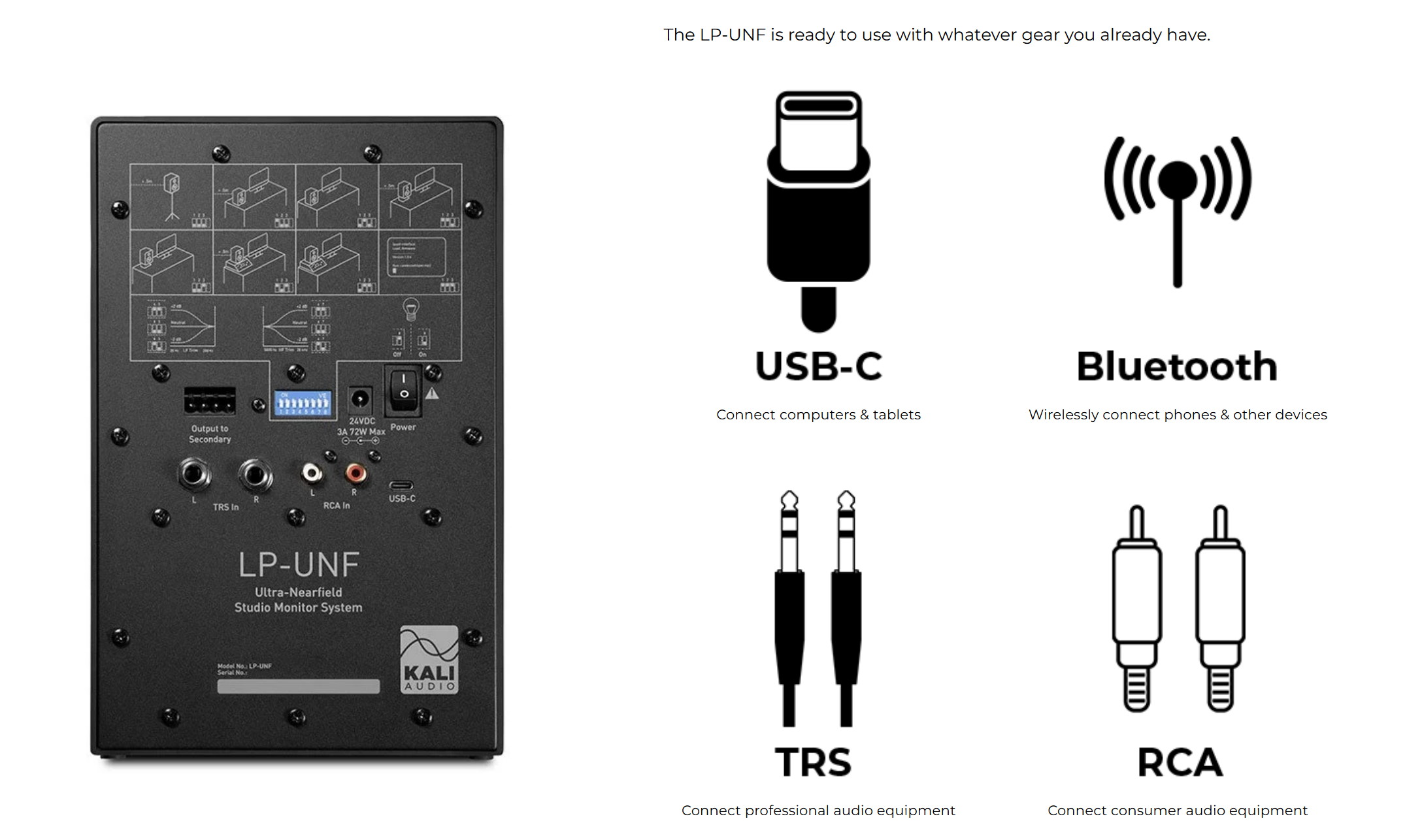 LP-UNF採用了與Kali最暢銷的LP-6和LP-8 V2相同的諸多技術,運用3D成像波導技術,營造出細節豐富、栩栩如生的立體結像,使所有細節都能在清晰呈現,位於前方的獨特的流體力學造型反射孔能有效消除多餘的駐波,用家還可以貼牆擺放。LP-UNF的4.5吋長衝程低音單體擁有強勁的低音表現,高低音各為40W的獨立擴大機驅動,低頻下潛至39Hz,低頻失真低於2%。LP-UNF具有USB與無線藍芽、RCA與TRS等數位與類比輸入,用家可以輕鬆享受來自各個播放設備的音樂。