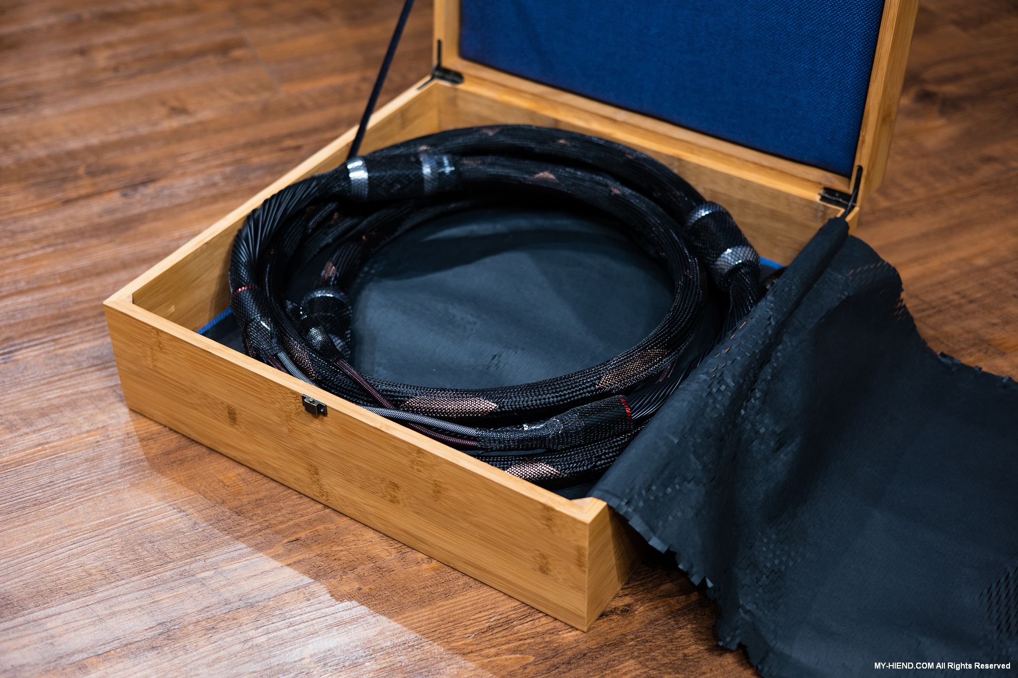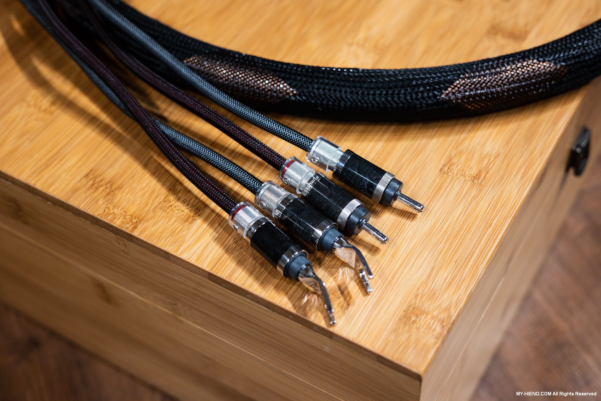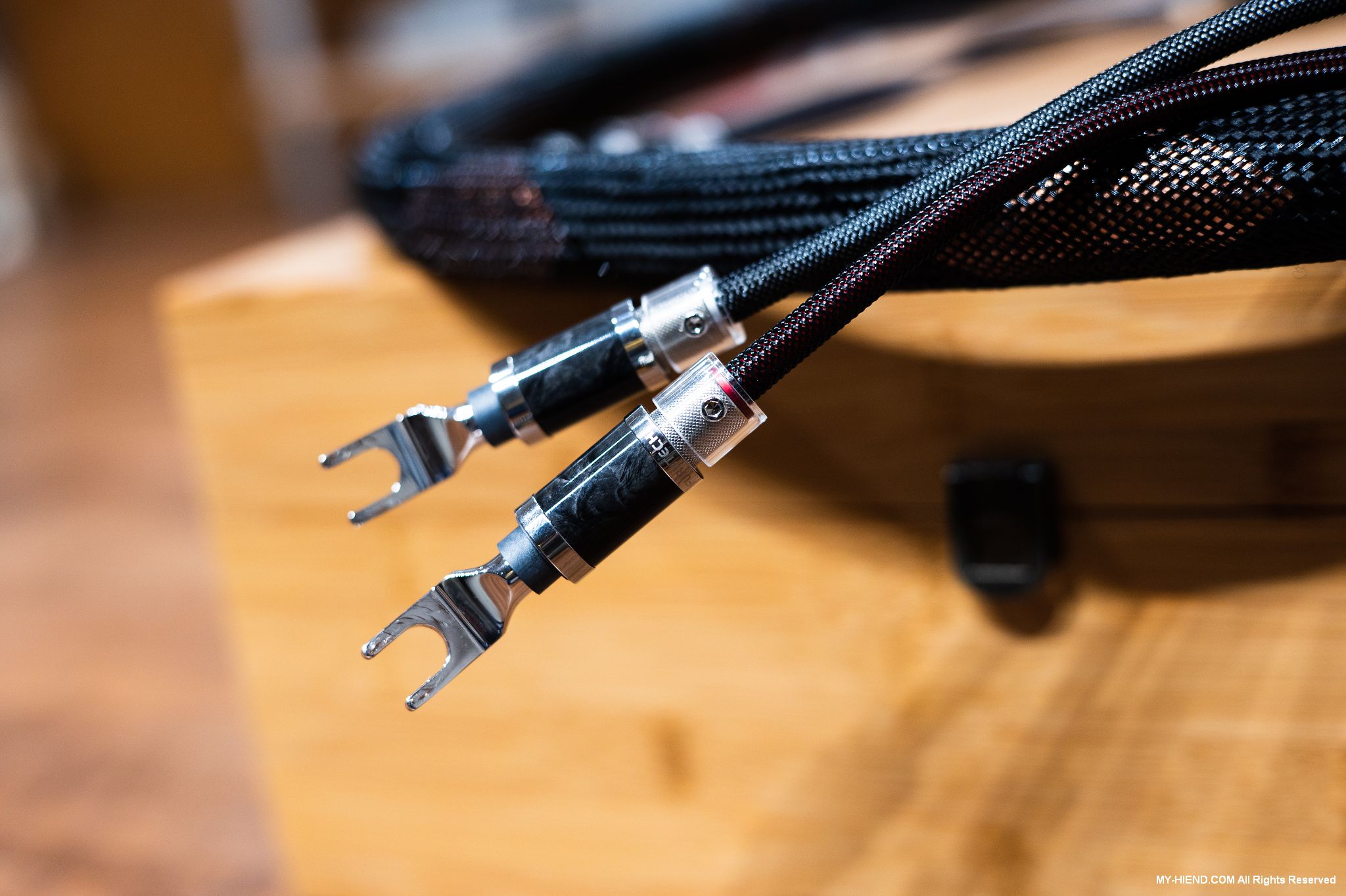 Furutech Project V1-S旗艦喇叭線的外盒採用重量十足的木製包裝,打開後上下疊著一對精美而低調的喇叭線,線材整體顏色大多是深色與黑色,從外觀上看得到碳纖維阻尼環與完整的包覆,端子連接頭上看得出使用獨家NCF材質,NCF是由奈米級陶瓷與碳纖維粉末製作,能融入運用在各個部位以各種型態出現。線身雖然算是粗,但保持著優異的柔軟性,彎曲時比視覺上看起來更柔和,這對線材一端是Y插、一端是香蕉插,因此在接線時非常方便使用。