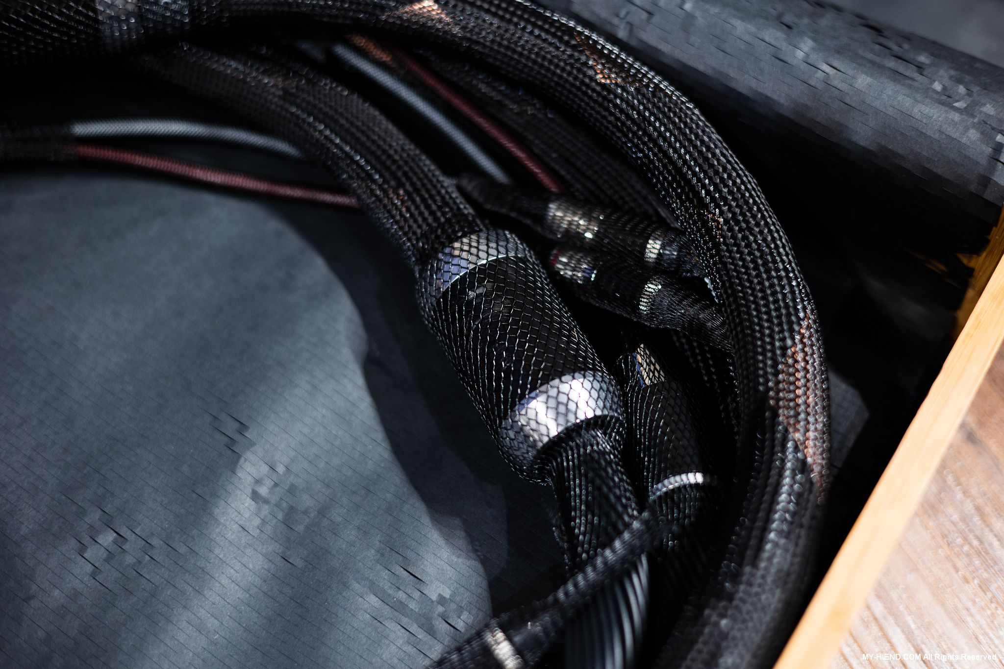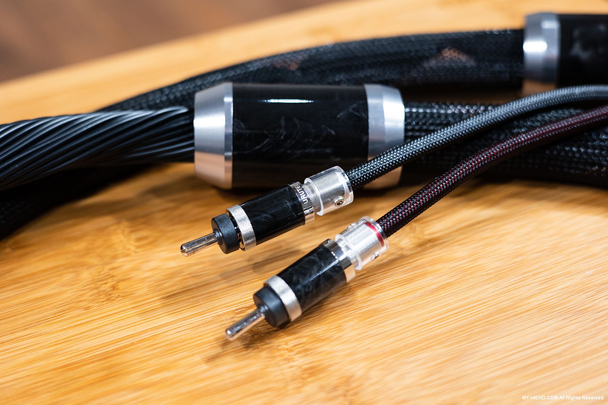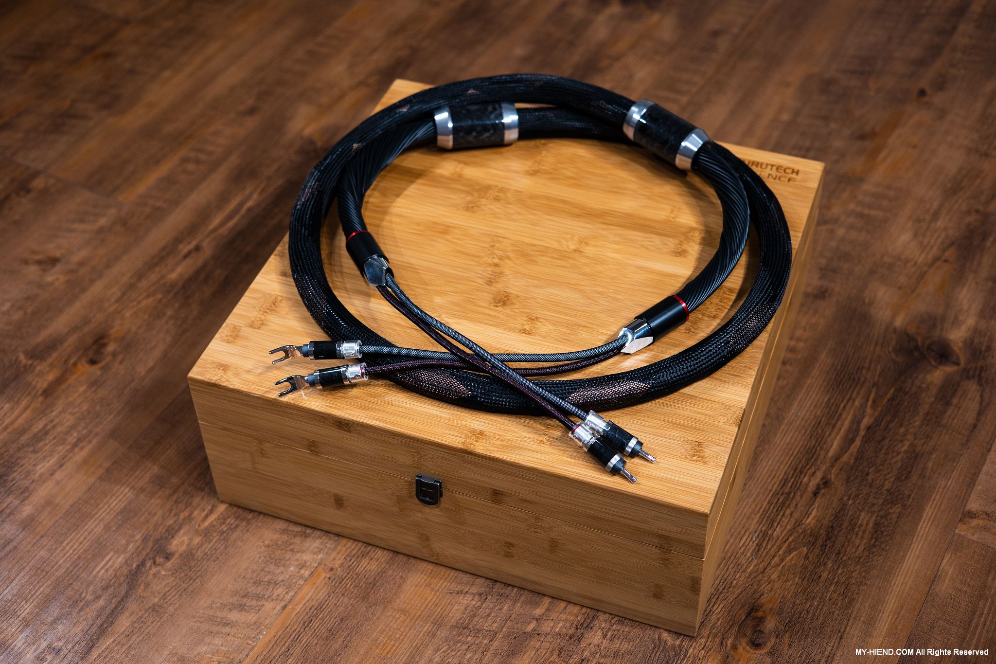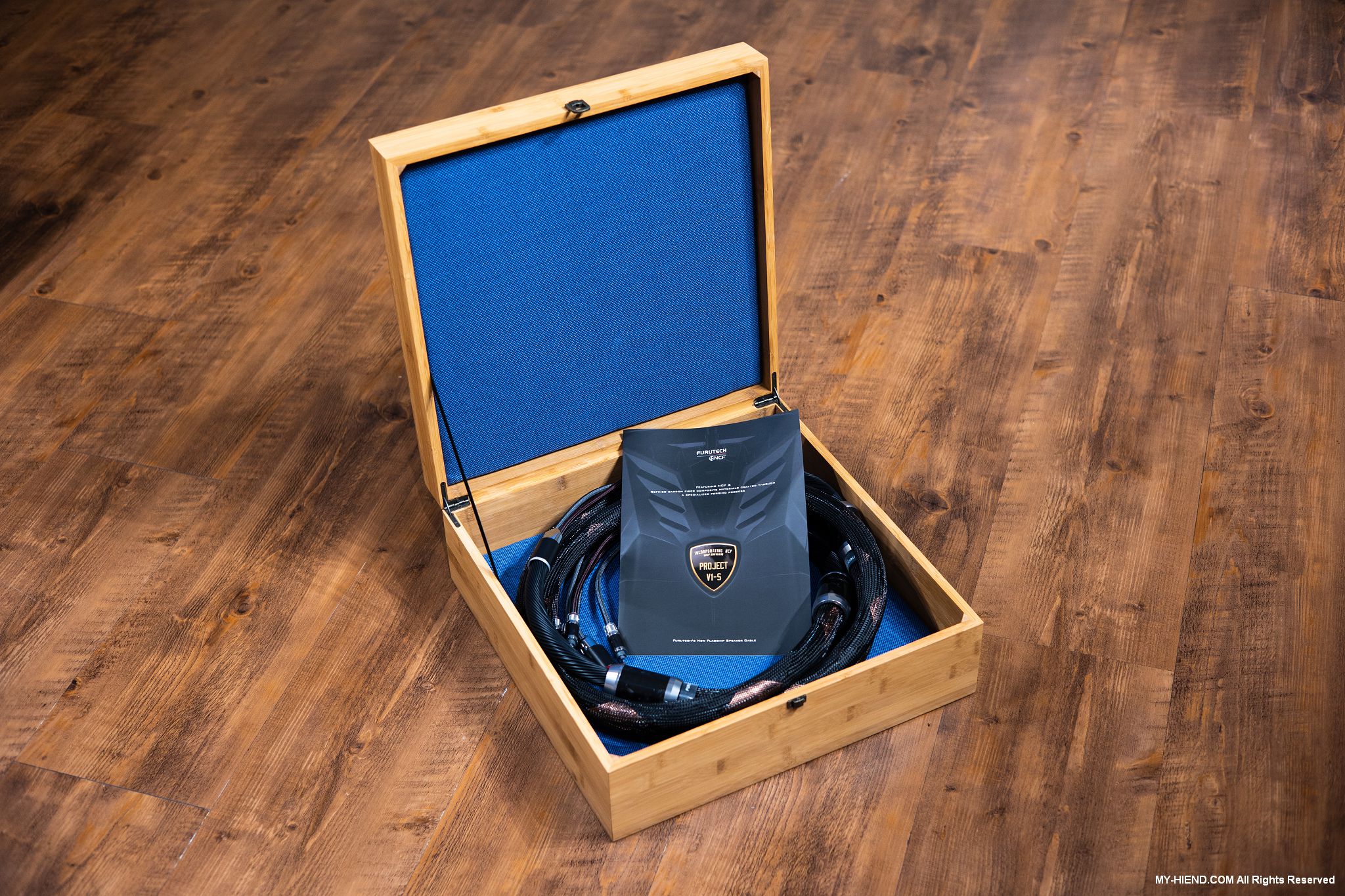 Furutech Project V1-S旗艦喇叭線的外盒採用重量十足的木製包裝,打開後上下疊著一對精美而低調的喇叭線,線材整體顏色大多是深色與黑色,從外觀上看得到碳纖維阻尼環與完整的包覆,端子連接頭上看得出使用獨家NCF材質,NCF是由奈米級陶瓷與碳纖維粉末製作,能融入運用在各個部位以各種型態出現。線身雖然算是粗,但保持著優異的柔軟性,彎曲時比視覺上看起來更柔和,這對線材一端是Y插、一端是香蕉插,因此在接線時非常方便使用。