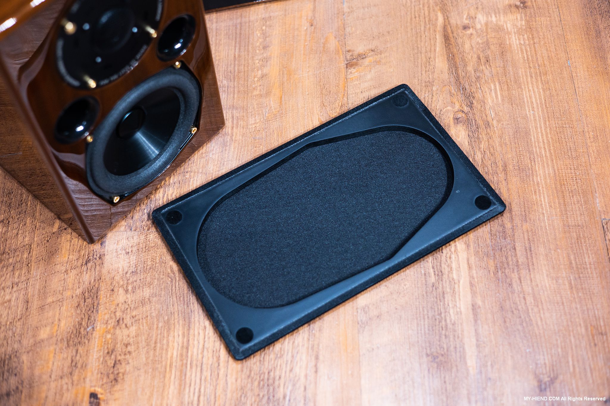 40th周年紀念版的金色標記就在高音單體的外圍,箱體的螺絲也都是採用金色,在這些小細節裡顯示出其獨特的地位,喇叭面網採用隱藏式的磁吸式設計,讓喇叭前面板孔位減少,整體更為完整漂亮。