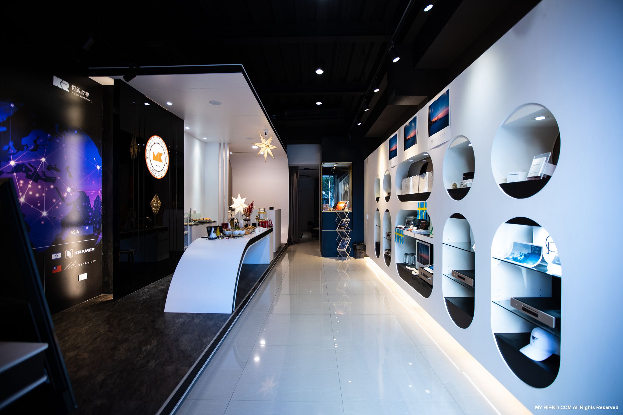 進入後有著寬敞開放的接待區,右側牆面巧妙展示所代理的產品