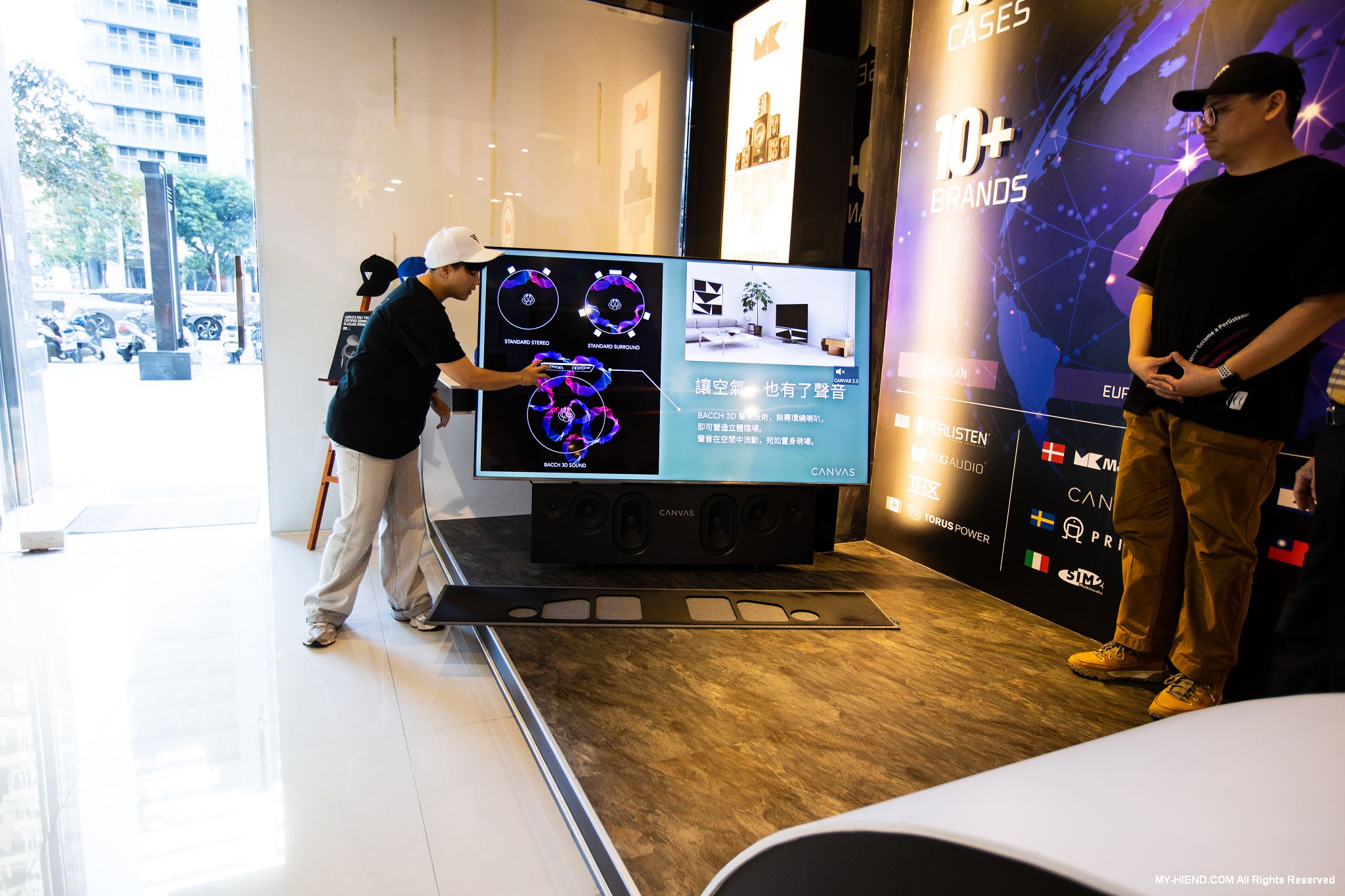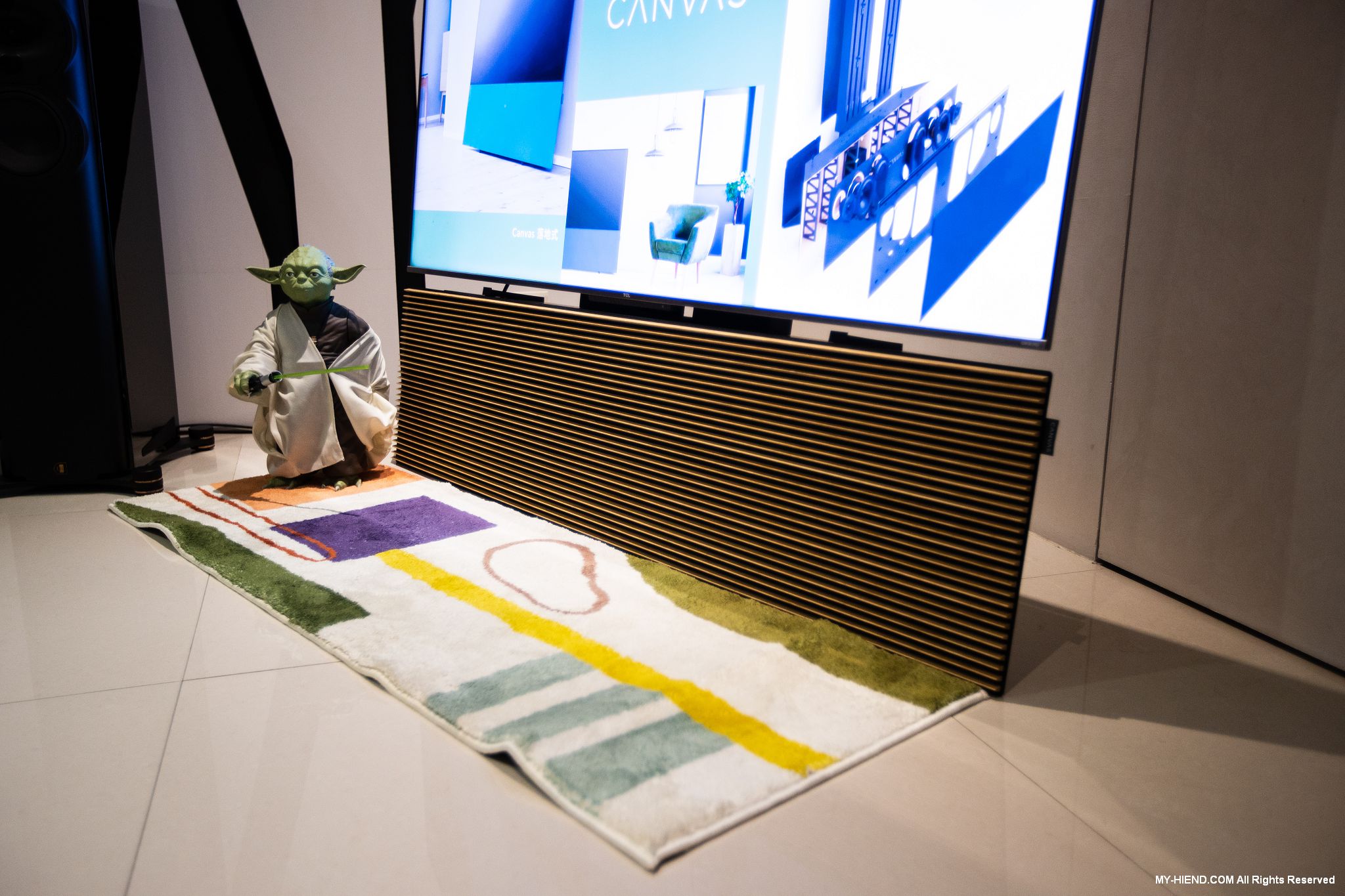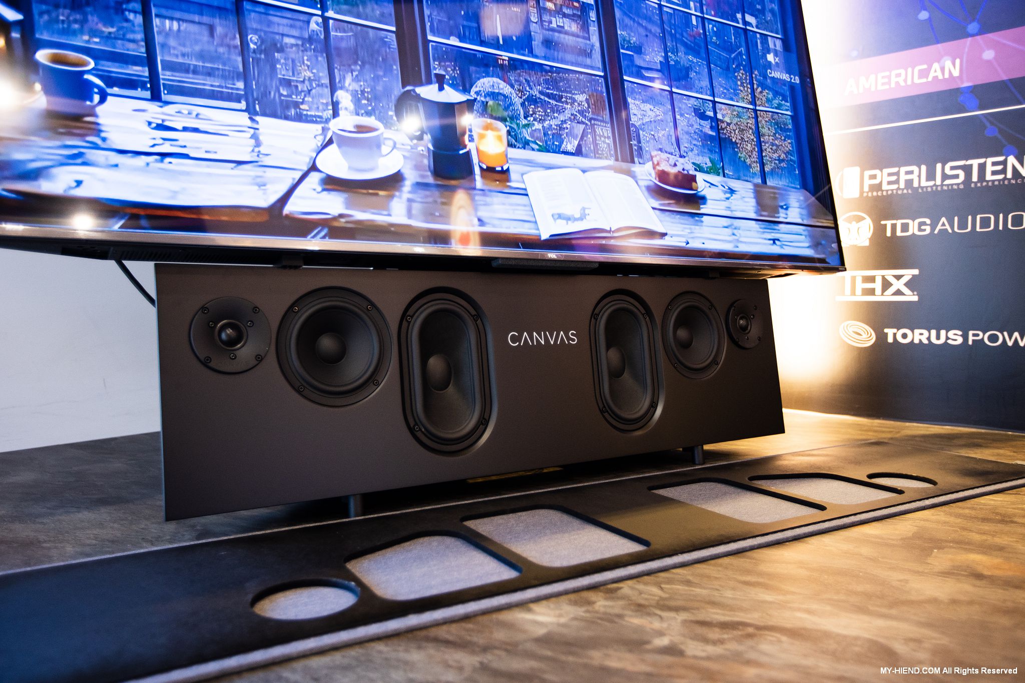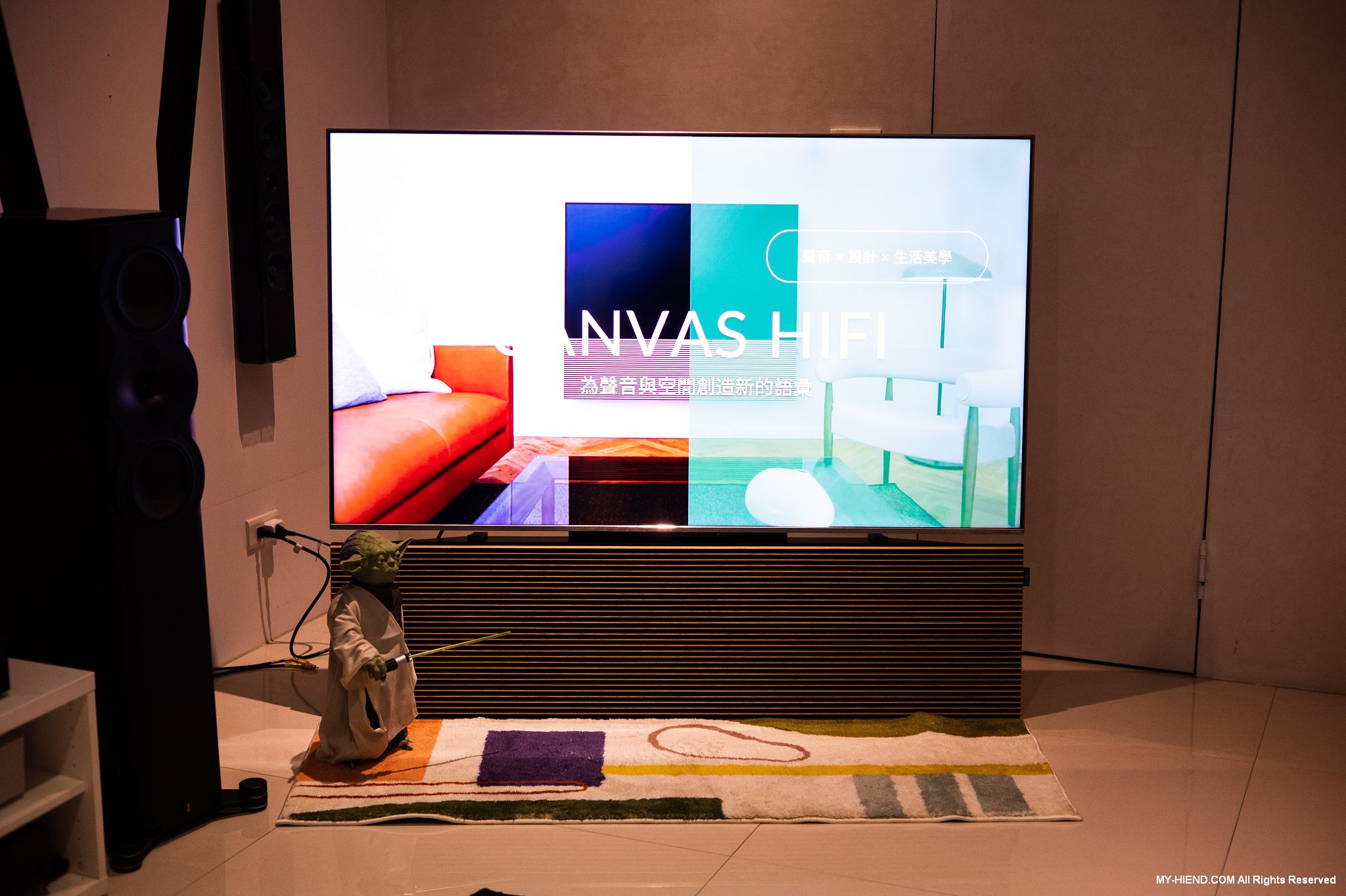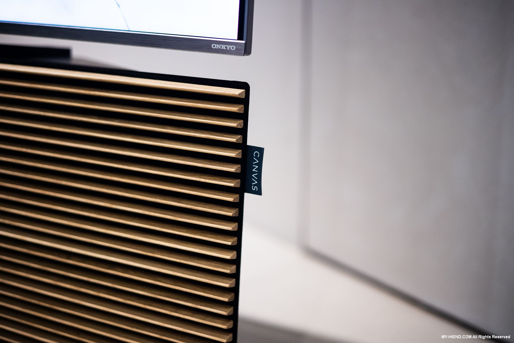 展出新代理來自丹麥CANVAS HIFI的聲霸SoundBar,其雖然性質上屬於SoundBar,但卻是平面而非長條型的設計,可與電視融合成為一體,也可以壁掛使用,客製化面網可依用家家裡環境需求訂製,還有實木柵欄可選,現在就是使用實木柵欄與電視搭配,相當好看,有對應不同電視尺寸的產品可選。聲音方面更是其強項,三音路三單體設計,採用強大的D類擴大機驅動,自家聲學與DSP技術,讓其擁有身歷其境的效果,HDMI eARC、藍芽、Airplay 2、Chromecast介面一應俱全。