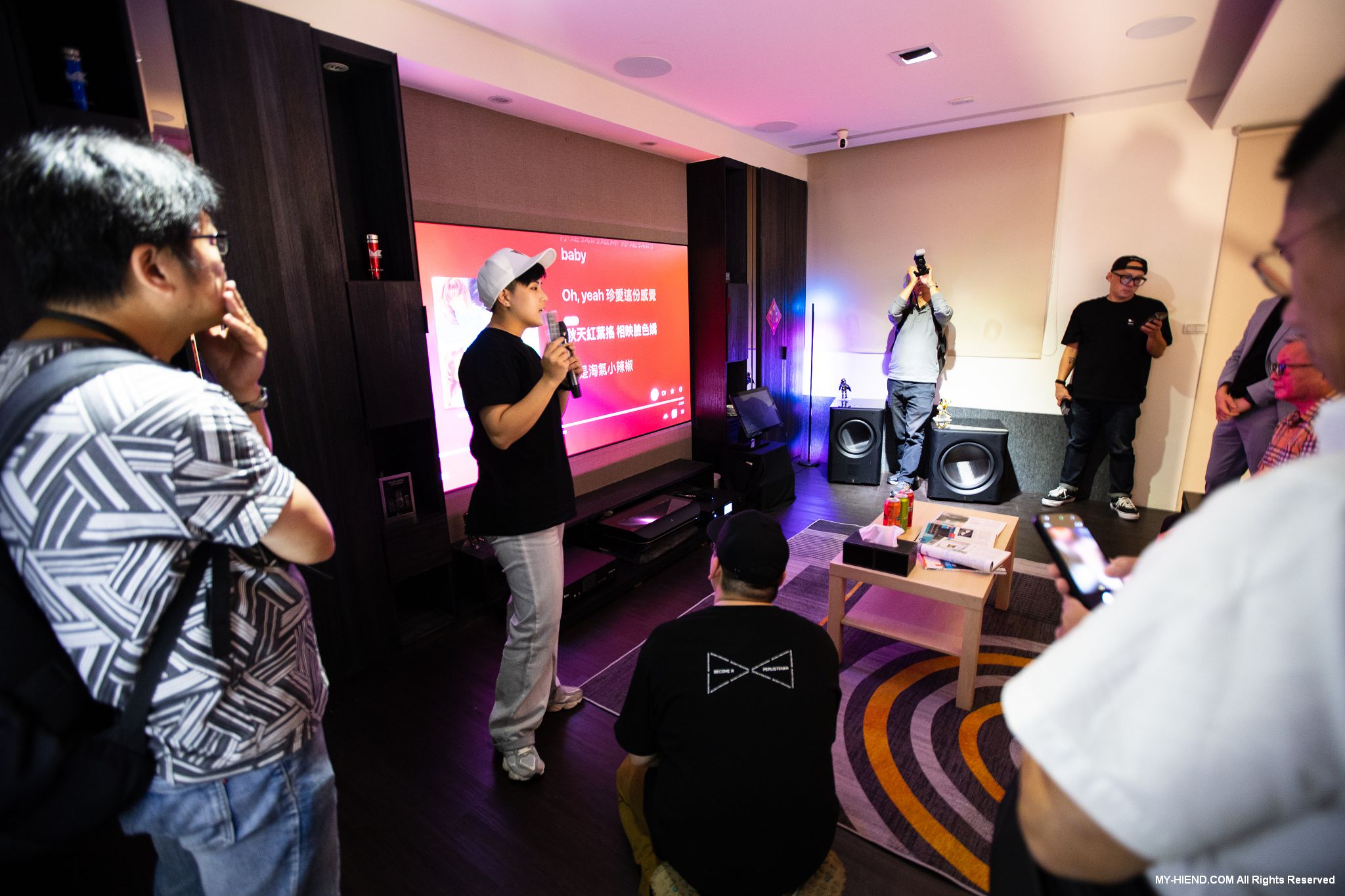 此為家庭娛樂中心的情境模擬,利用崁入式喇叭、吸頂式喇叭來打造隱藏與環境之中的多功能娛樂空間、可以在此與親朋好友歡唱KTV,看電視、看電影,配合情境燈光更有氛圍。