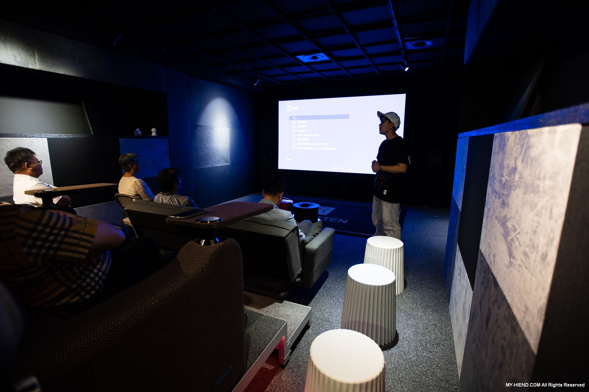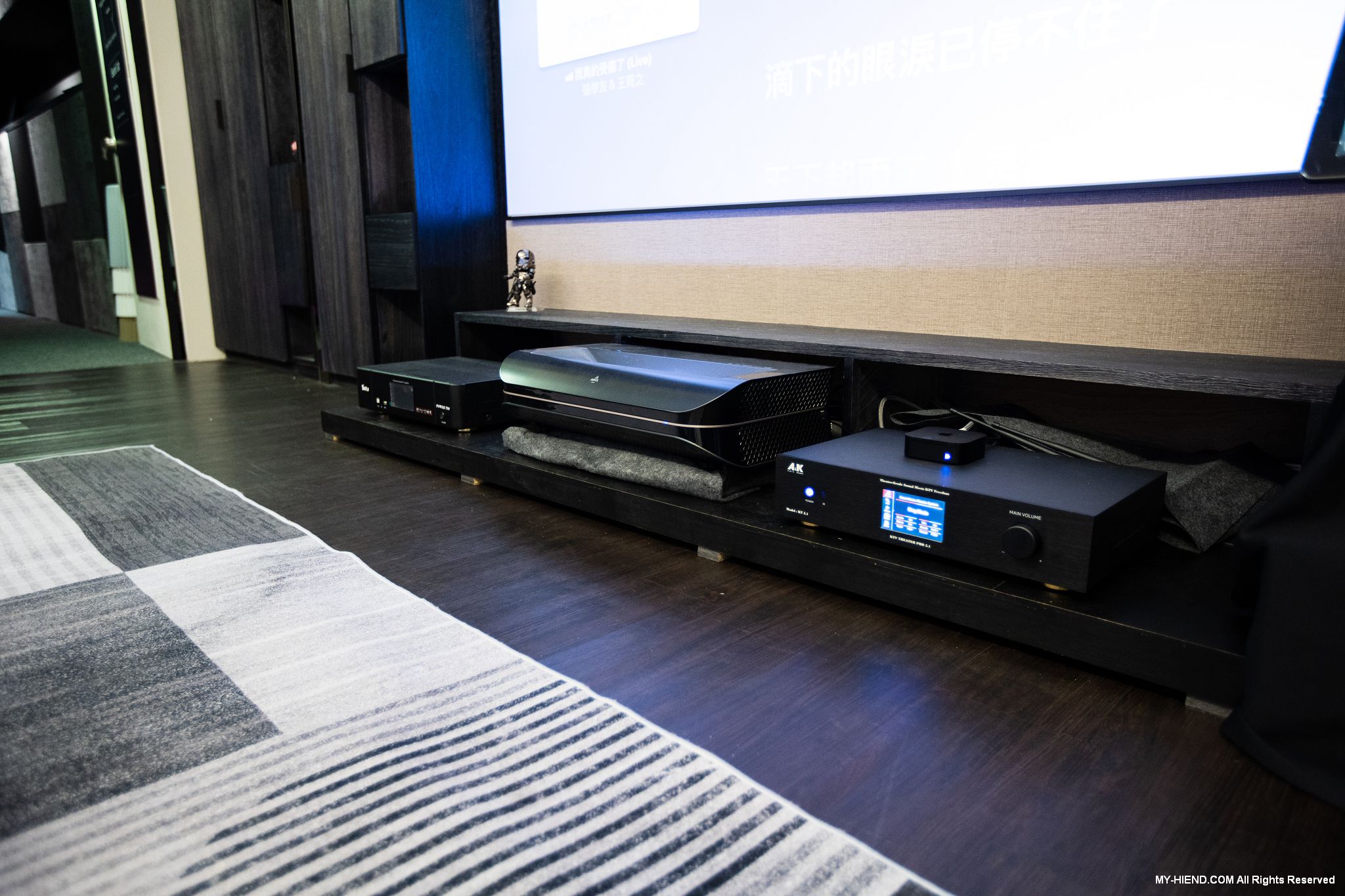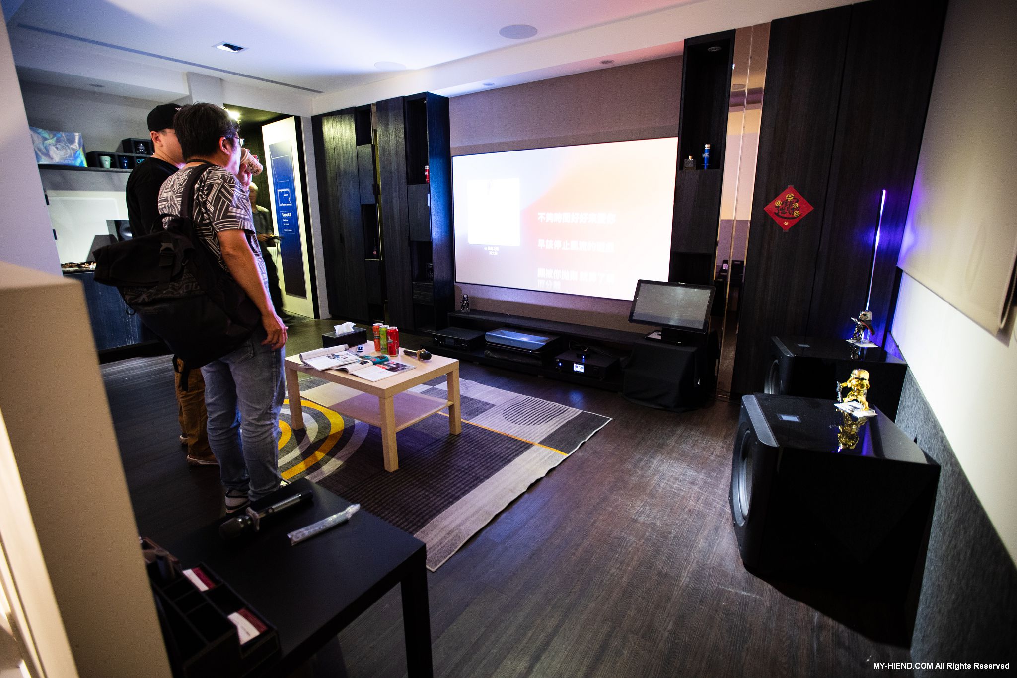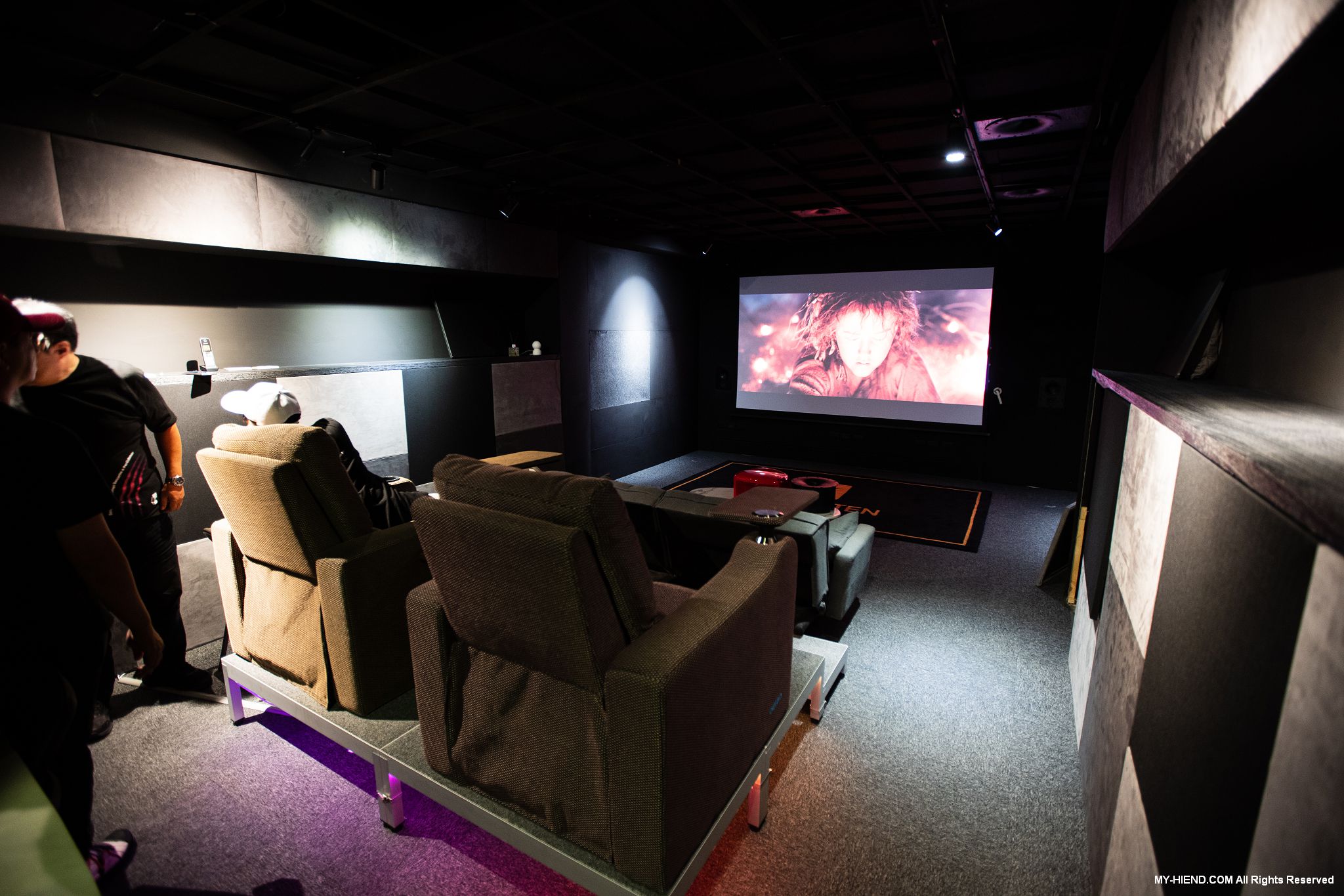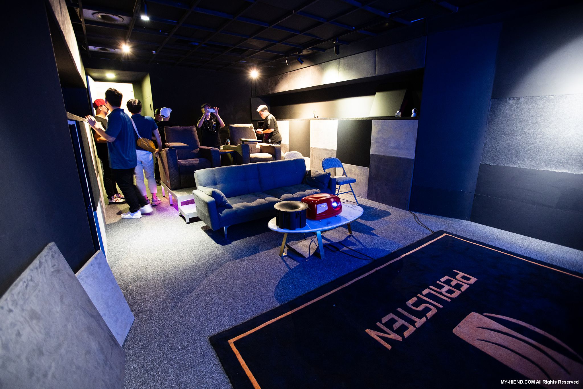 這裡為最High End的私人影院,採用美國上帝之聲Perlisten Audio全系列產品,並首度展示新代理來自義大利專業投影機Domino by SIM2的4K投影機X80。X80是該品牌為紀念經典型號D80推出的劇院投影機,使用RGB三色雷射光源,高達3500 ANSI流明,100% DT.2020超廣色域,外觀更是有著以義大利獨特高奢的設計美學,非常時尚,具有白色、黑色、限量法拉利紅可選。Perlisten採用7.4.4聲道,完全隱藏在空間中,包括3支S3ic主喇叭、4支R4i-LCR聲道、4支R2ic天空聲道及4支D3is超低音,使用瑞典Primare SP25與A35.8 x2前後級,Torus Power RM20電源處理器,整個影音效果讓人大呼過癮。