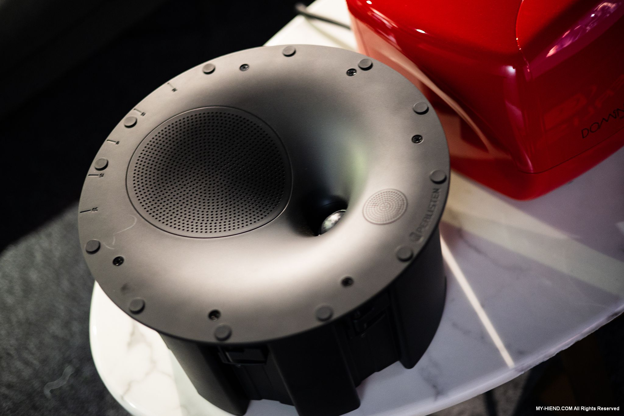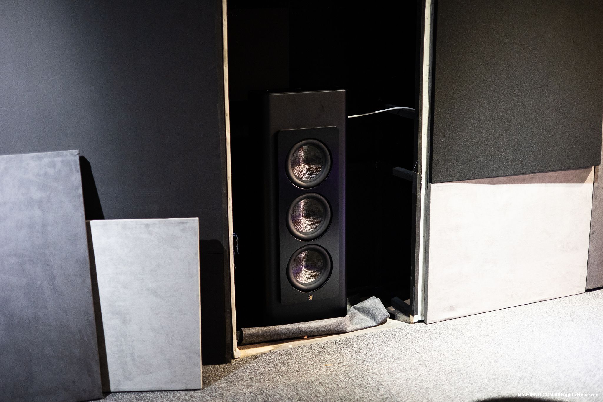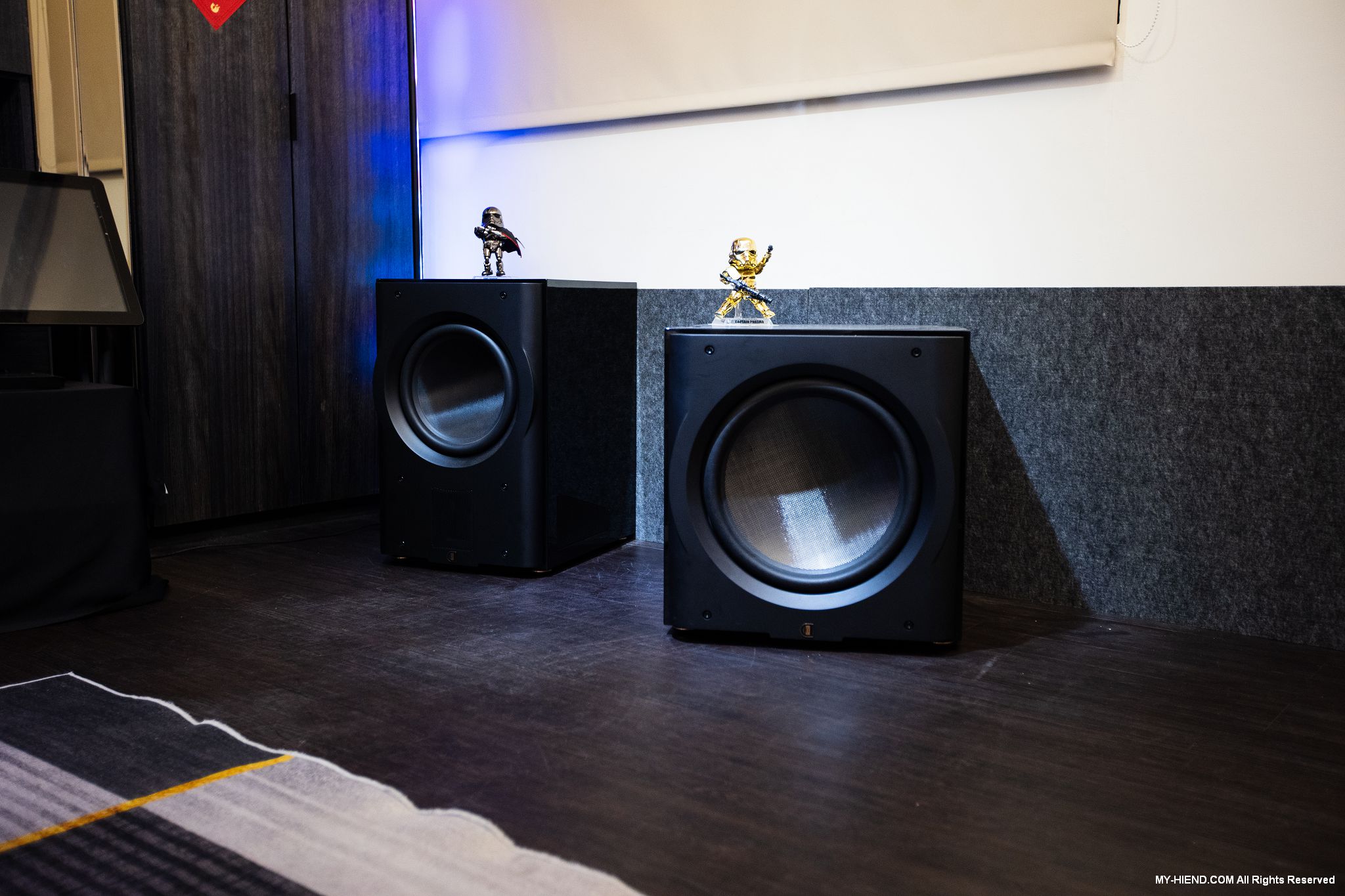 Perlisten D3is超低音共4隻,也隱藏在牆中,3顆8.5″碳纖維振膜低音,1500W內建擴大機,Ti DSP 48-bit DSP處理引擎,自家APP設定調整