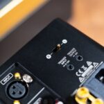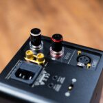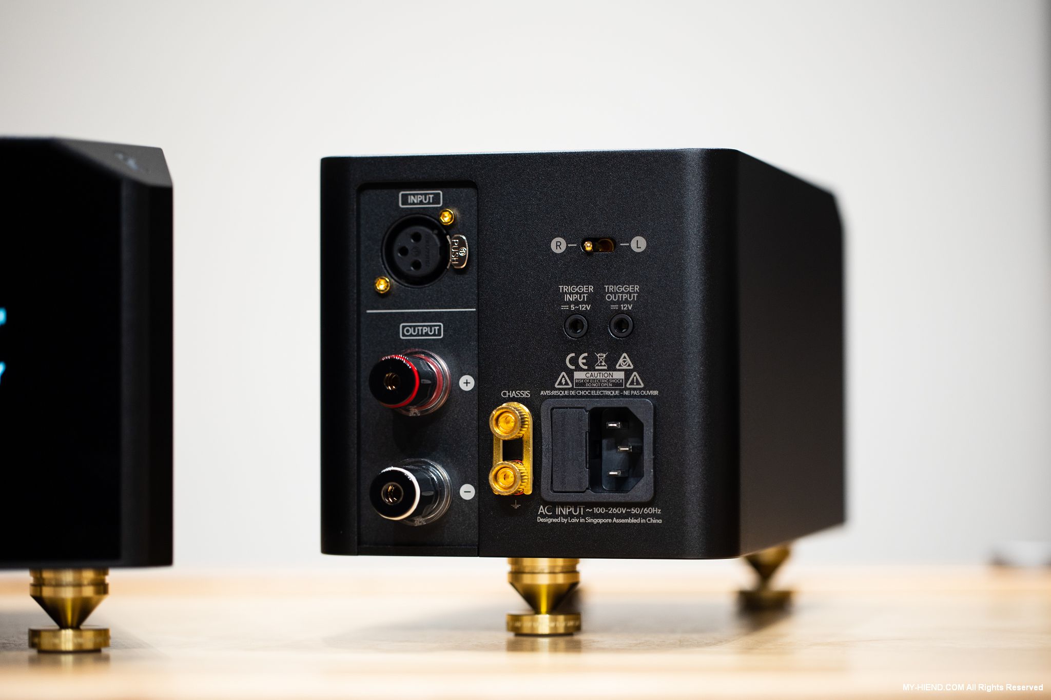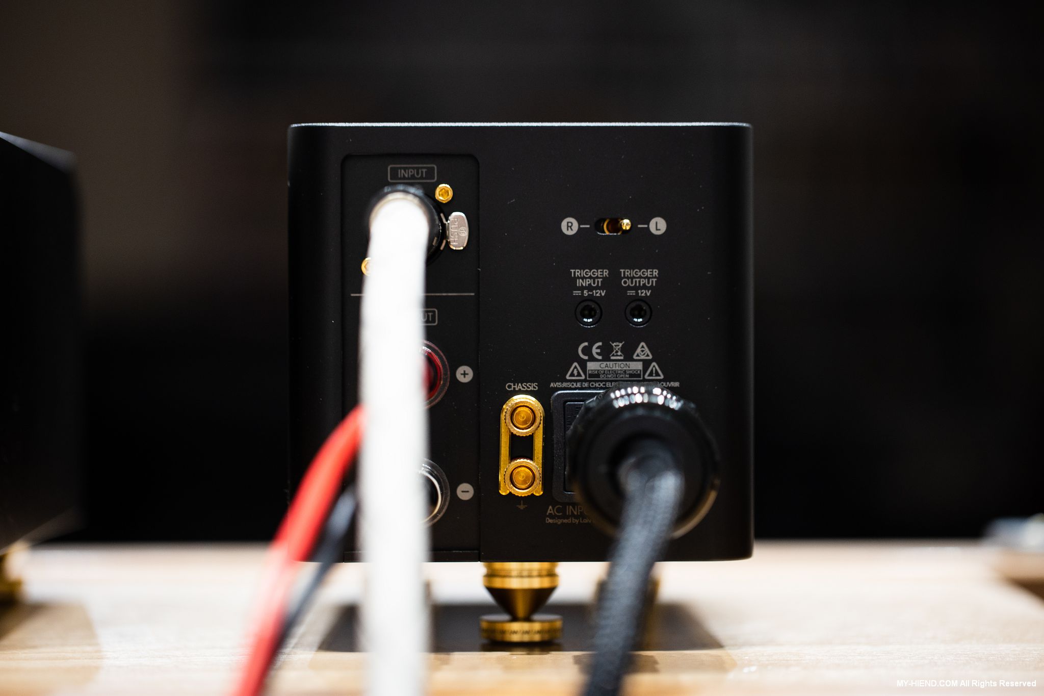 Harmony GaNM的背面,具有XLR類比輸入x1,左右聲道LED顯示切換撥桿,機殼接地與喇叭輸出端子
