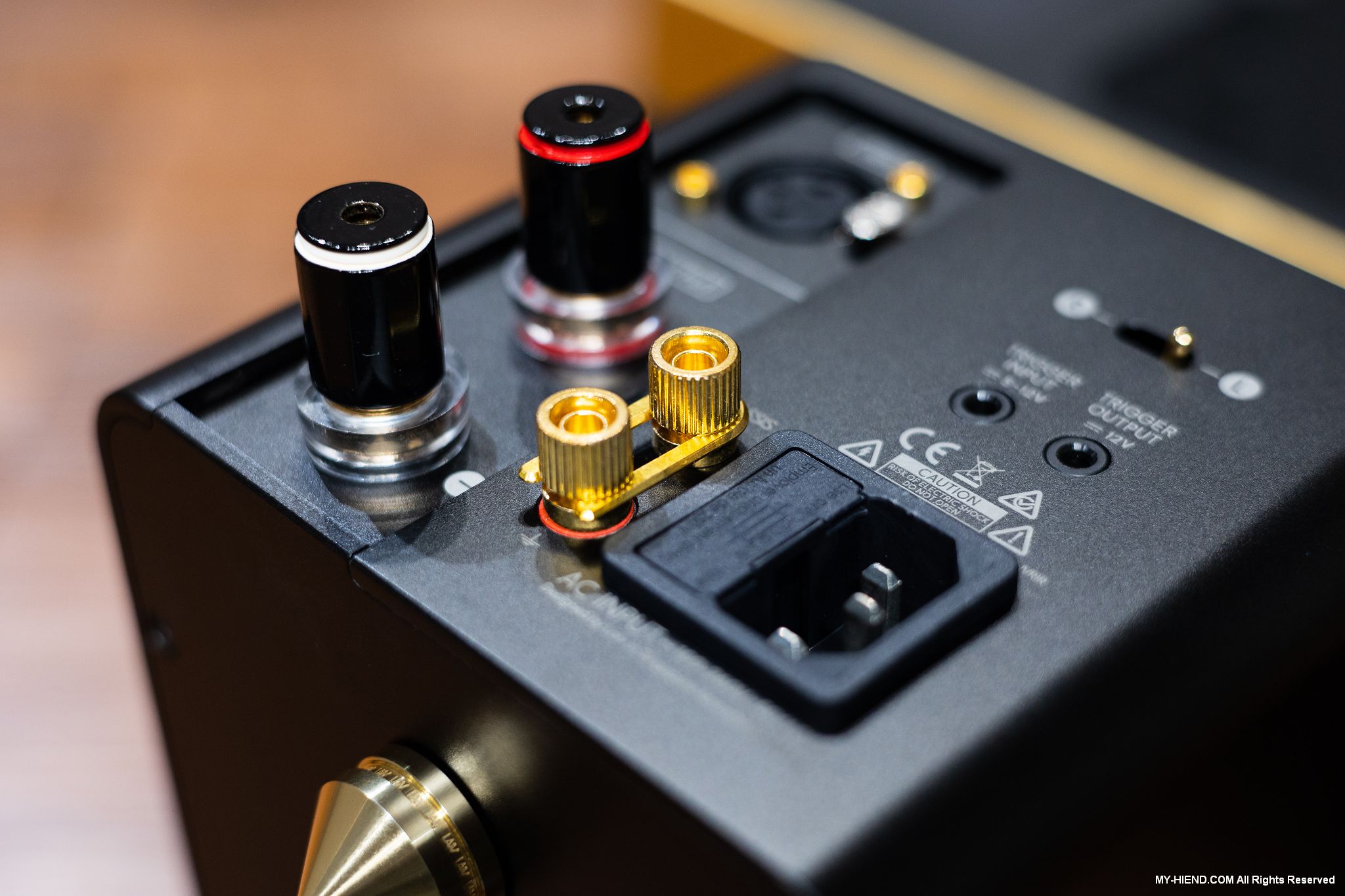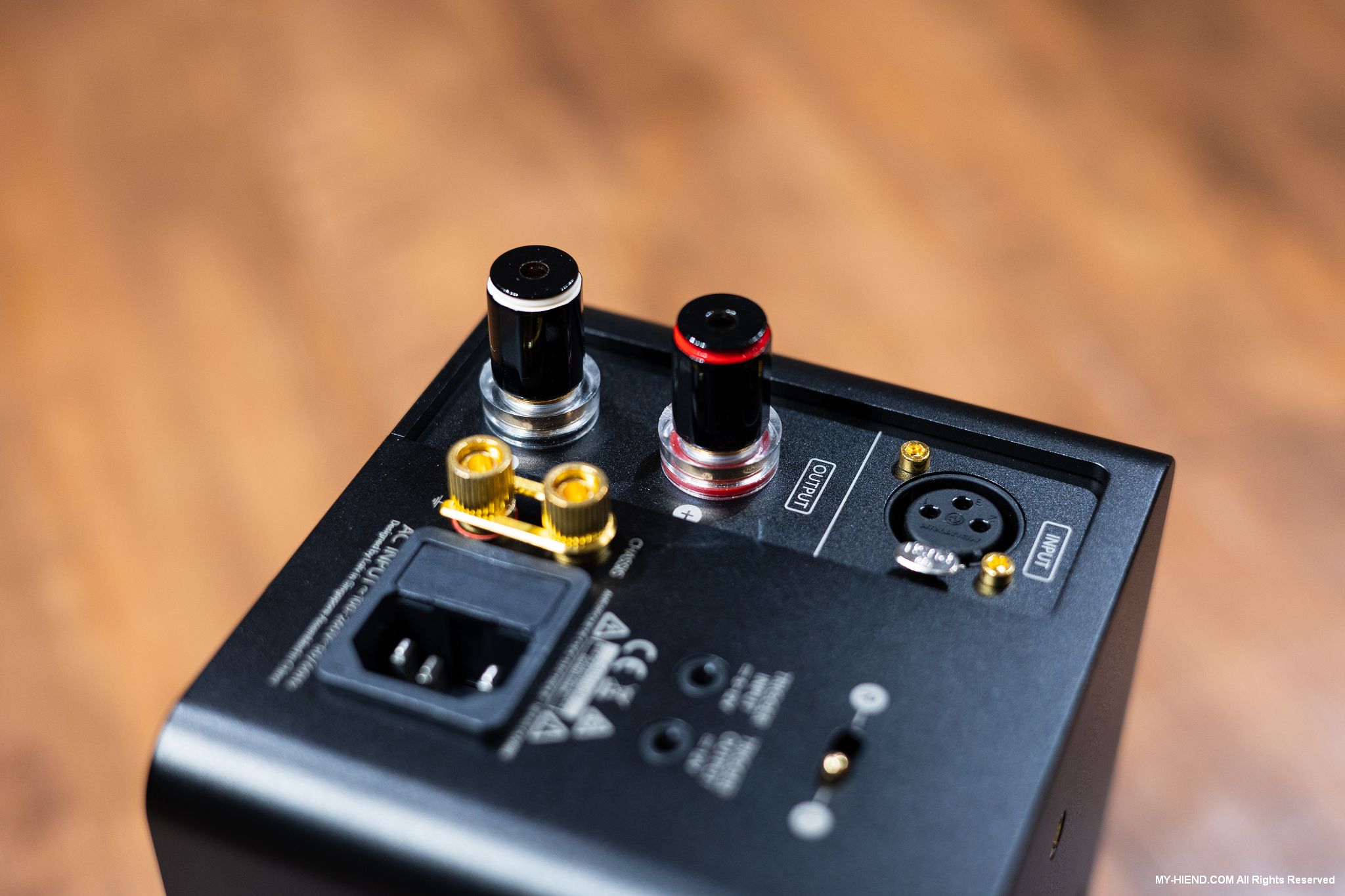 Harmony GaNM的背面,具有XLR類比輸入x1,左右聲道LED顯示切換撥桿,機殼接地與喇叭輸出端子