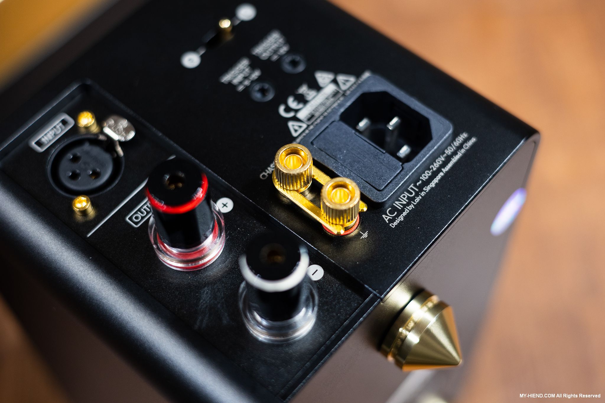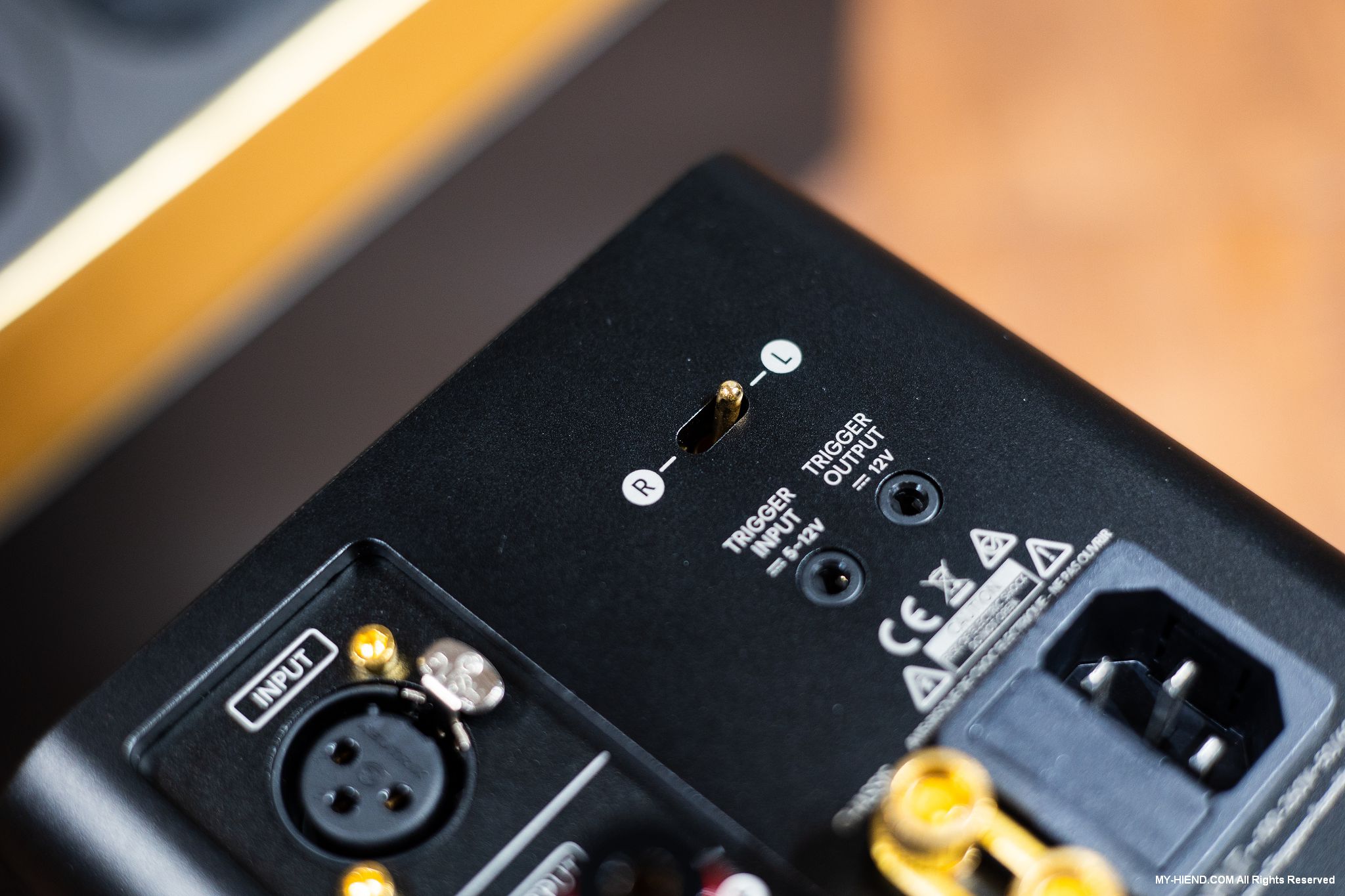 背面的撥桿可以設定這裡是顯示L還是R的燈,代表目前是當什麼聲道使用,一目瞭然,上方正中央的金色按紐為電源開關