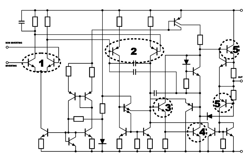 在這篇編號#25中我有解釋,我們偏好在我們的CI線路中不要COPY(訊號),這張圖是最常用的OP-AMP-IC之一,5532,我標記了所有的COPY級,你可以看到這個IC有5個COPY地方,意味著在輸出時,你得到的是a copy of a copy of a copy of a copy of a copy of原來的訊號,且發生在只有一顆IC上,大部份的線路又使用了許多的IC。