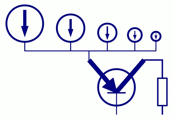Now these current sources are connected to a CI-circuit, feeding the sum of the switched currents to E of the transistor. At the output the voltage is set by the resistor. At this point there is the output voltage of the DAC, without making a copy. That’s it about CI for DAC.